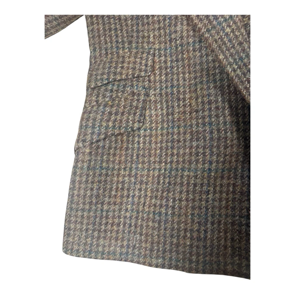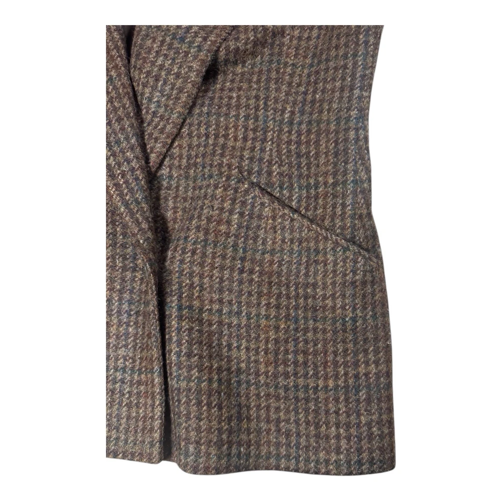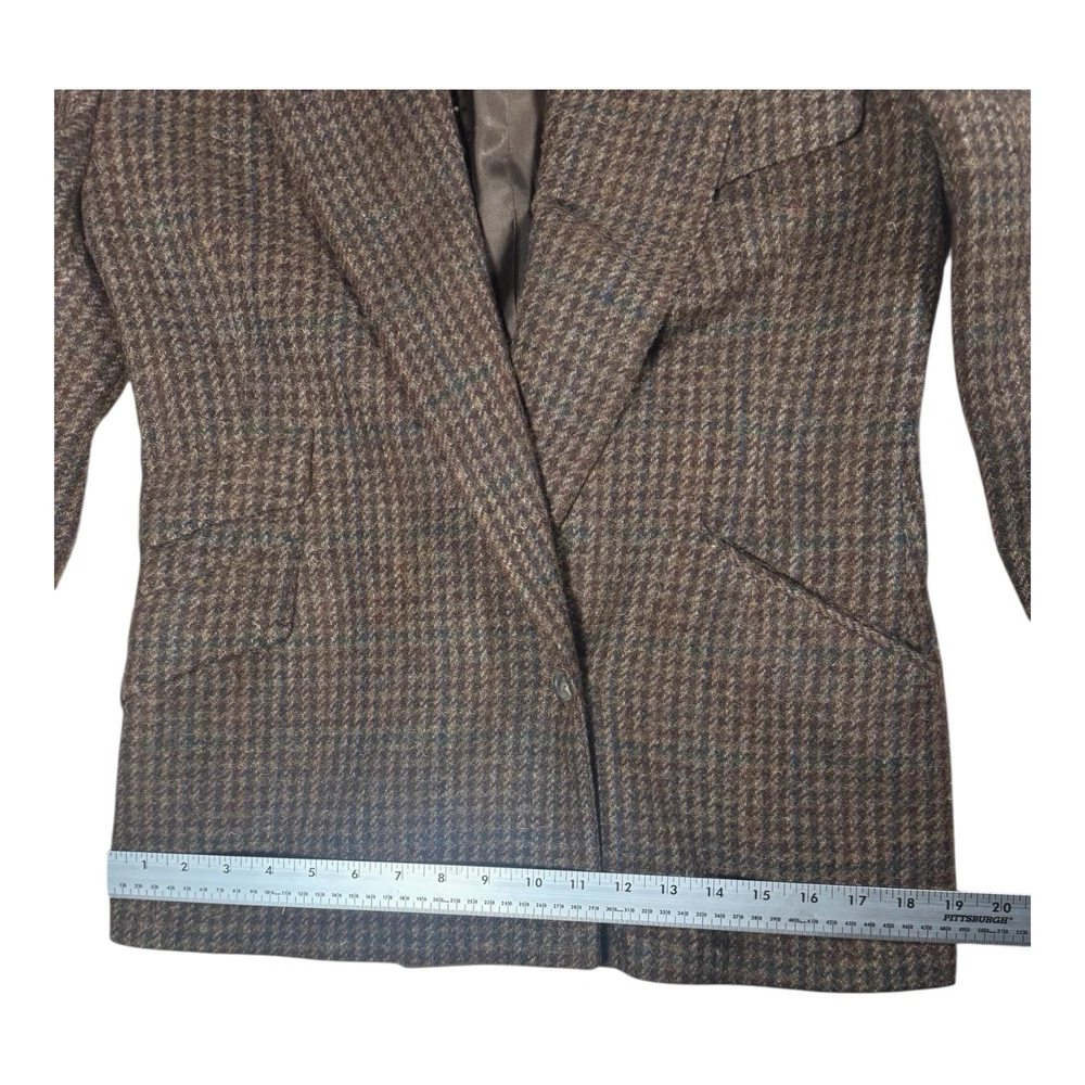 Good vintage condition with no holes or major flaws noted, and all seams, lining, and structure remain intact. This 1970s Polo Ralph Lauren women’s tailored blazer is made in the USA from wool tweed with a brown houndstooth pattern, featuring a classic notch lapel, single-breasted two-button closure, chest welt pocket, flap hip pockets, structured shoulders, and full satin lining, offering a timeless, structured silhouette suitable for casual, business, or dress wear—please review all photos for details and overall condition.