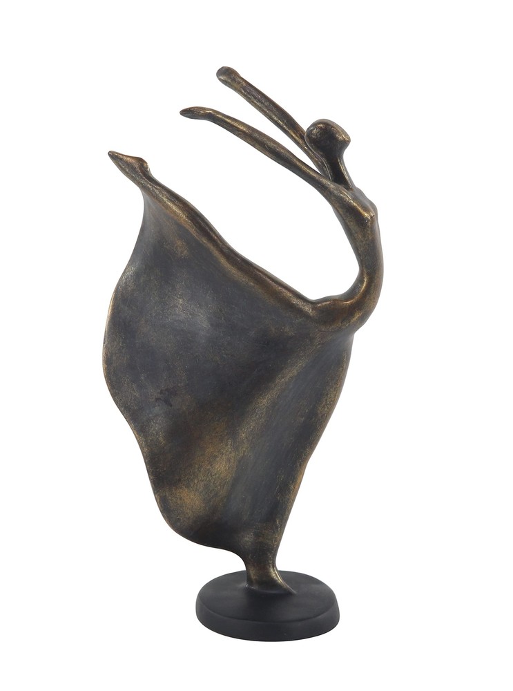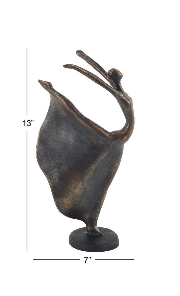 Metallic gold finish further adds class and elegance, while beautifully reflecting light. Display this dancer table decor statue anywhere you wish to bring a magical, sophisticated essence. Designed with felt or rubber stoppers at the base that prevent scratching furniture and table tops, as well as sliding around. This item ships in 1 carton. Please note that this item is for decorative use only. Polystone sculpture makes a great gift for any occasion. Suitable for indoor use only. This item ships fully assembled in piece. This is a single brass colored statue. Traditional style. TRADITIONAL DECORATIVE STATUE: Designed with the essence of timeless sophistication, where rich old-world textures and warm hues come together for a refined classic taste of understated luxury POLYSTONE SCULPTURAL ACCENT: Tabletop human figurine was crafted from polystone BRASS HOME DECOR FIGURINE: Human sculpture features a metallic gold finish with black undertones and a round black base DANCER ACCENT STATUE: The design concept features a woman in a dress posing in a ballet position SMALL SIZE SCULPTURAL STATUE: The brass polystone sculpture measures 7L x 5W x 13H inches, and weighs 0.75 lbs
