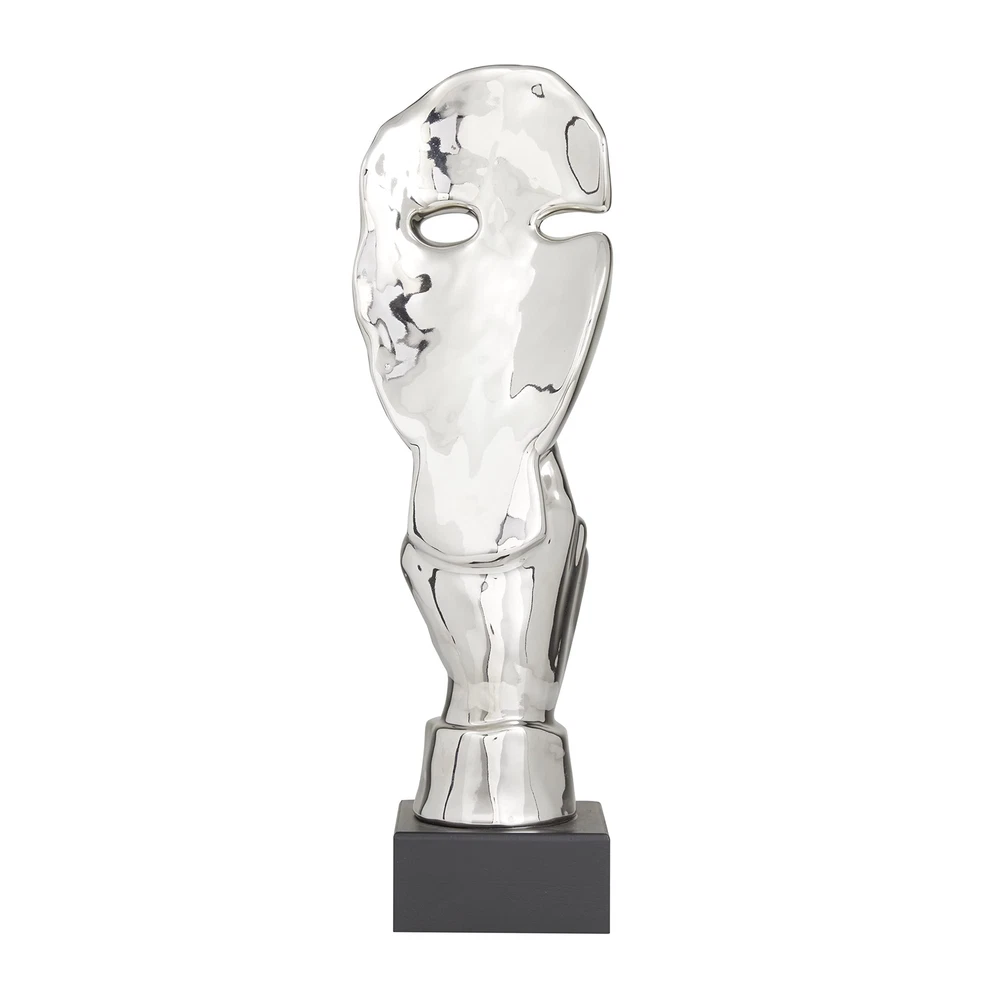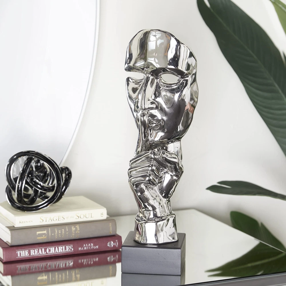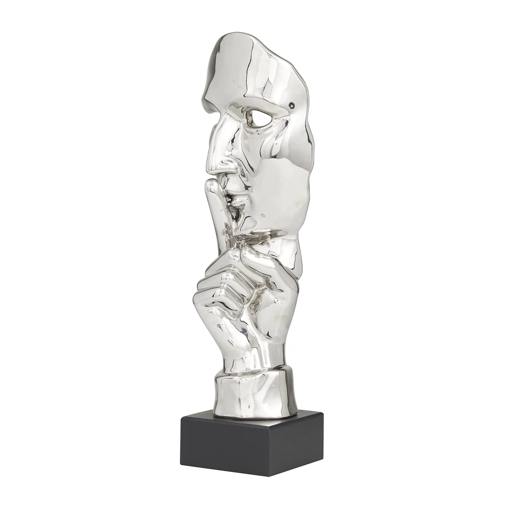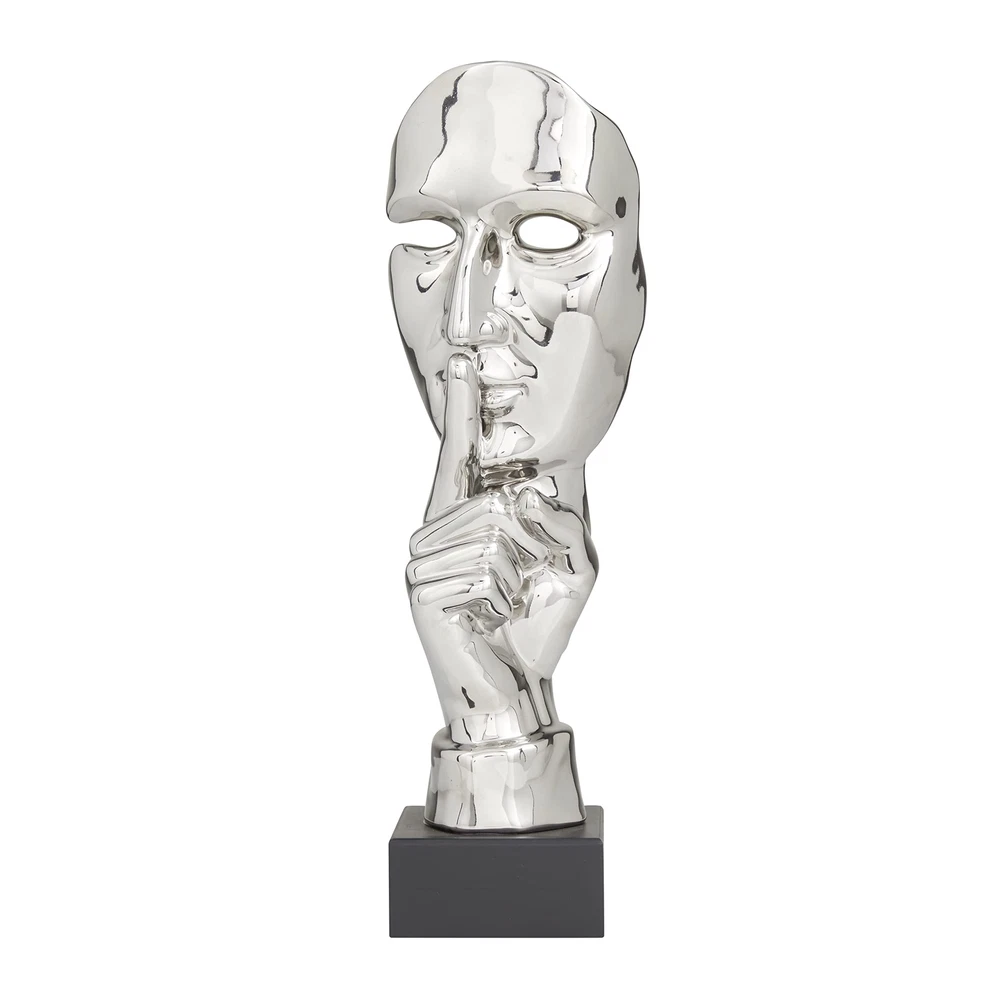 This item will elevate any living space and bring some dimensions and texture to your surface space. Give your corners and spaces a bold an elegant statement piece with this face sculpture as center or accent piece on your tables. Designed with felt or rubber stoppers at the base that prevent scratching furniture and table tops, as well as sliding around. This item ships in 1 carton. Please note that this item is for decorative use only. Polystone sculpture makes a great gift for any occasion. Suitable for indoor use only. This item ships fully assembled in piece. This is a single silver colored statue. Contemporary style. CONTEMPORARY DECORATIVE STATUE: Embrace artistic expression with a style that highlights bold designs with sleek lines, neutral elements, and a minimalist aesthetic POLYSTONE SCULPTURAL ACCENT: A contemporary abstract sculpture made of high-quality and glossy ceramic with an mdf base SILVER AND BLACK HOME DECOR FIGURINE: Hand and face sculpture flaunts a high gloss metallic silver finish set in a soot black base ACCENT STATUE: An ornate 2D full with hands gestured to keep quiet is the embodiment of this table sculpture decor LARGE SIZE SCULPTURAL STATUE: The silver polystone sculpture measures 5.20L x 4.75W x 17.20H inches, and weighs 3.14 lbs