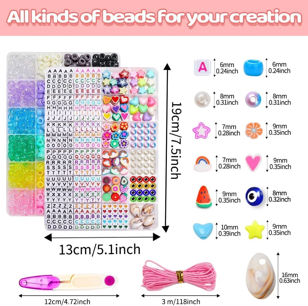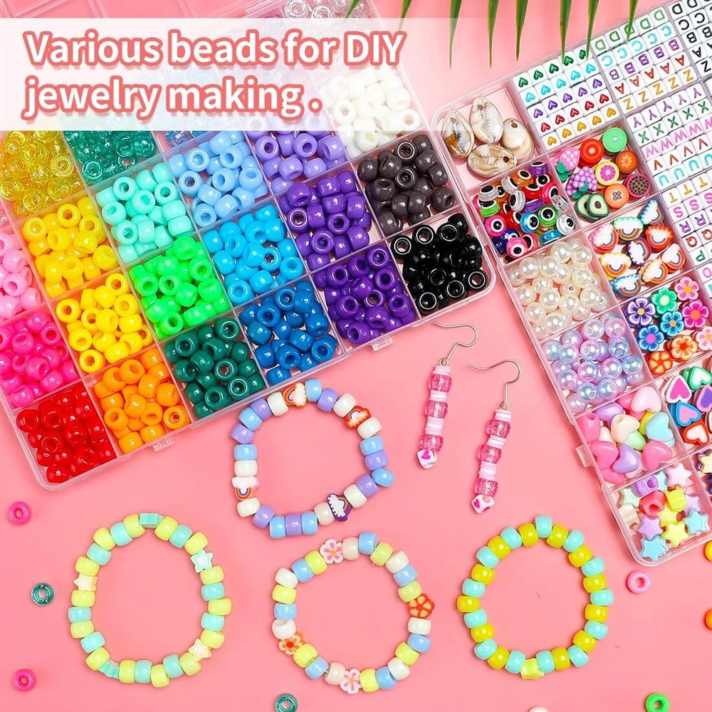 【Package include】2 boxes of various beads in 48 grids: A box of 400+pcs pony beads in 24 colors, 360pcs square letter beads in 2 styles, 30pcs heart beads, 50pcs shaped clay beads, 20pcs evil eye beads, 40pcs pearl beads, 30pcs shaped pony beads, 4pcs shells, 4 rolls of stretchy string, 1 pair of scissors. 【Various color】The pony beads are in glitter colors and solid colors, the letter beads are in 2 colors, the other beads are all colorful. The colored beads are bright and vibrant, you can make all kinds of bracelet styles with the colorful beads. 【DIY pack】The bracelet making kit is an ideal present for friends or loved ones. You can make some own design bracelets, necklaces, earrings for them, or just send the beads kit to friends who love crafts. 【More than jewelry making】You can also create fun crafts like key chains and pendants. You can create frogs, ice cream, turtles, dolphins, and so many more! Attach your bead pets to the key rings and lanyard clips to decorate your backpack, keys and lanyards. Make your own design of decorations. 【Premium products】The beads for jewelry making are made of premium materials, they are well packed in boxes, the package is convenient and easy for carry and storage. Product Description The video showcases the product in use. The video guides you through product setup. The video compares multiple products. The video shows the product being unpacked. Art and craft supplies Add to Cart Add to Cart Add to Cart Add to Cart Add to Cart Add to Cart Customer Reviews 4.7 out of 5 stars 813 5.0 out of 5 stars 5 4.7 out of 5 stars 813 4.7 out of 5 stars 512 4.7 out of 5 stars 512 4.5 out of 5 stars 174 4.4 out of 5 stars 288 Price $5.99 $ 5 . 99 $9.99 $ 9 . 99 $6.99 $ 6 . 99 $6.99 $ 6 . 99 — $5.99 $ 5 . 99 $4.99 $ 4 . 99 Ideal for Crafts ✔ ✔ ✔ ✔ ✔ ✔ ✔ Quantity 900+pcs 2000pcs 1000pcs 6000+pcs 4000+pcs 100m 28 grids Colors Multi-colored Multi-colored Candy colored Multi-colored Multi-colored Clear Clear Size Assorted size 6*9mm 6*9mm 6*1mm Assorted size 1mm 8.6*5*0.66 inch Gift packaged ✔ ✔ ✔ ✔ ✔ ✔ ✔