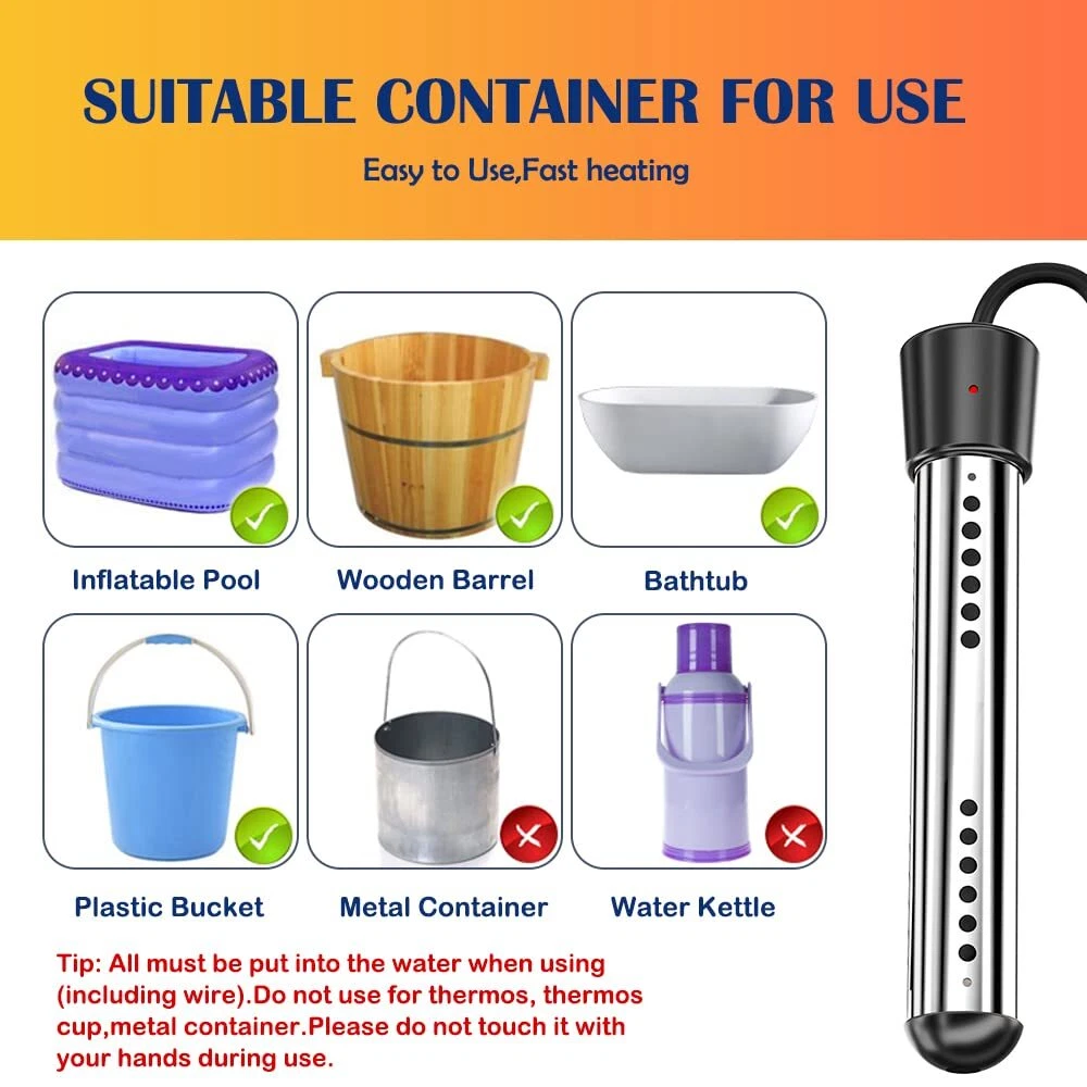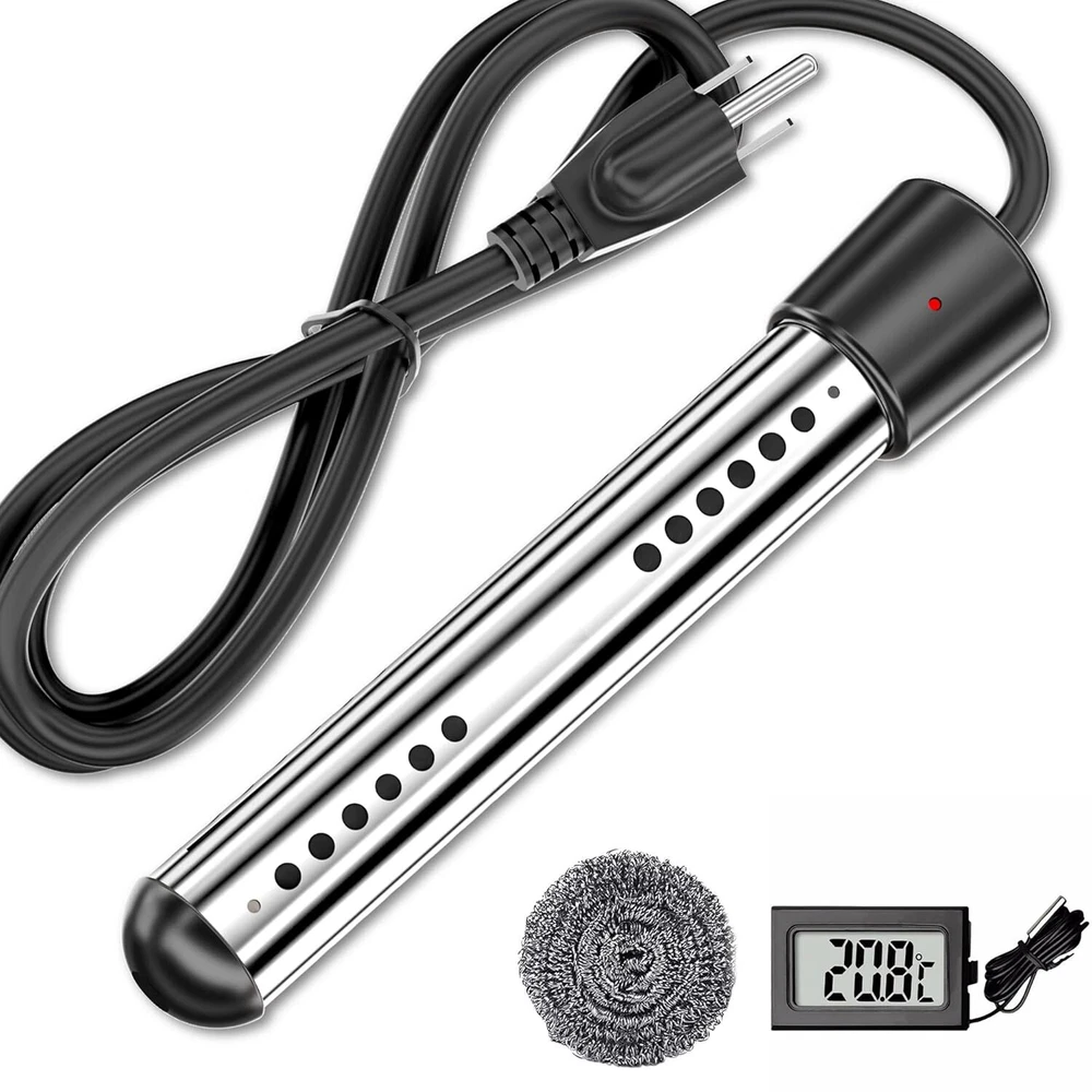 Pool Heater for Above Ground Pool, 1500W with Digital LCD Black Product Details Product Dimensions : 7.87 x 8.66 x 8.66 inches; 1.28 Pounds Item model number : TJDRRS230324 Manufacturer : Laisence Country of Origin : China Material: Stainless Steel Voltage: 120 Volts Brand: Laisence Color: Black Wattage: 1500 watts 【Safety and Practicality】The pool heater is equipped with a stainless steel sheath, which effectively prevents the heating element from directly touching the human body, making it safer. Heat is lost more quickly to the water through holes in the shield. It can boil five gallons of water in minutes. Please follow the instructions strictly! ! 【Easy to Use】First immerse the heater completely in water, and then connect the 120V power supply. Check the power indicator to ensure that the submersible water heater is working properly and that it will continue to heat the water. Suitable for any cold weather application 【Warning】Because of the high power of this product, please ensure that there are no quality problems in the circuit used! The heater must be fully submerged when working! Please take out the heater before touching the water! Do not use continuously for more than 3 hours! Do not plug two water heaters into the same socket to avoid fire. Suitable for basin, bucket, bathtub, mini inflatable pool and other containers, it can quickly make water hot, equipped with 1 digital thermometer, 1 stainless steel cleaning ball, 1 immersion water heater. It will be a great helper in winter and a great gift to give to your friends or family