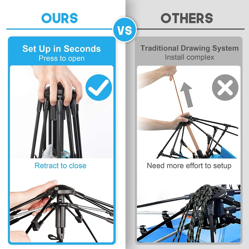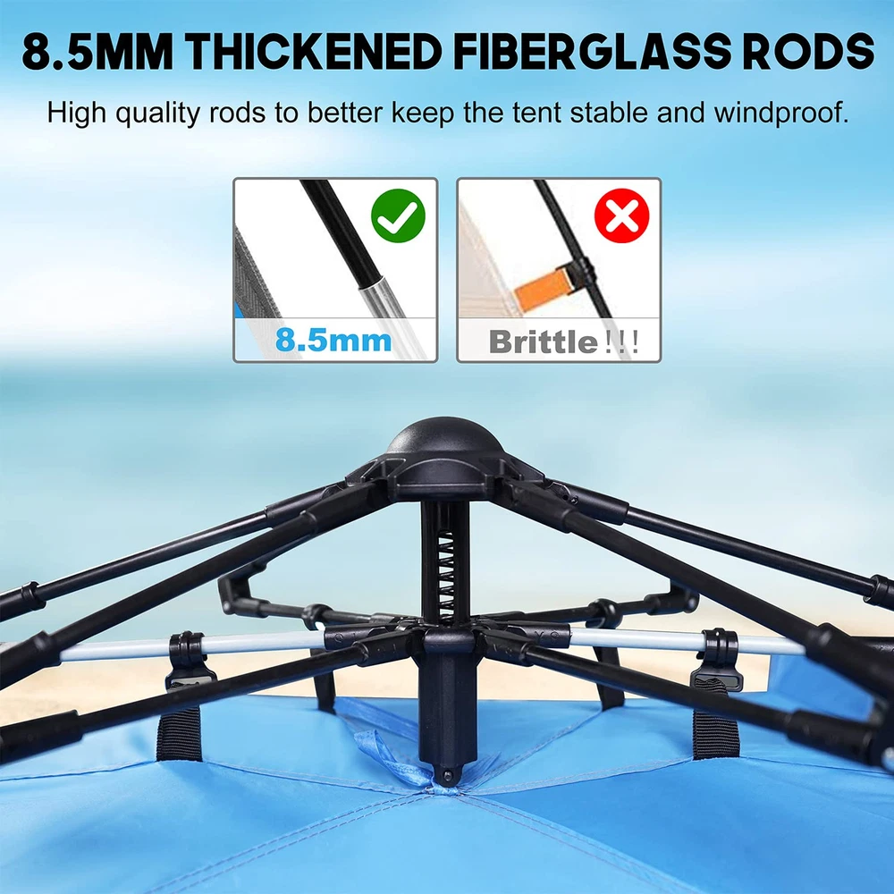 Pop Up Beach Tent for a larger Space at A More Affordable Price- The size of pop up beach tent is upgraded to 99"L x 55"W x 55"H, enough space for 2 adults plus 2 kids! Larger Space : pop up beach tent is one of the largest sunshades for your family. A size upgrade to 99" L x 55" W x 55" H, larger space for up to 2 adults and 2 kids. Easy Set Up & Portable: Quick pop-up mechanism allows setting in under 30 seconds! Light weight, packs down to 36" x 5" for easy carrying and storage. UV Protection & Great Ventilation: Crafted from 210T polyester coated with UPF 50+ protection that blocks harmful UV sun rays. pop up beach tent is made from breathable polyester and is water-resistant. Three-side screen windows of pop up beach tent can efficiently ventilate. Durable and Windproof:beach tent is made of 8.5mm fiberglass frame, high quality poles make the beach tent more durable; And equipped with 3 sand bags, 8 steel stakes, 6 sand stakes and ropes, the combination of inserts and stakes makes the beach tent grip more firmly and resist strong winds more effectively. Privacy Design: pop up beach tent with the adhesive door and window design, which provides you with a private space to change swimming suits, breastfeeding or any other private moment.