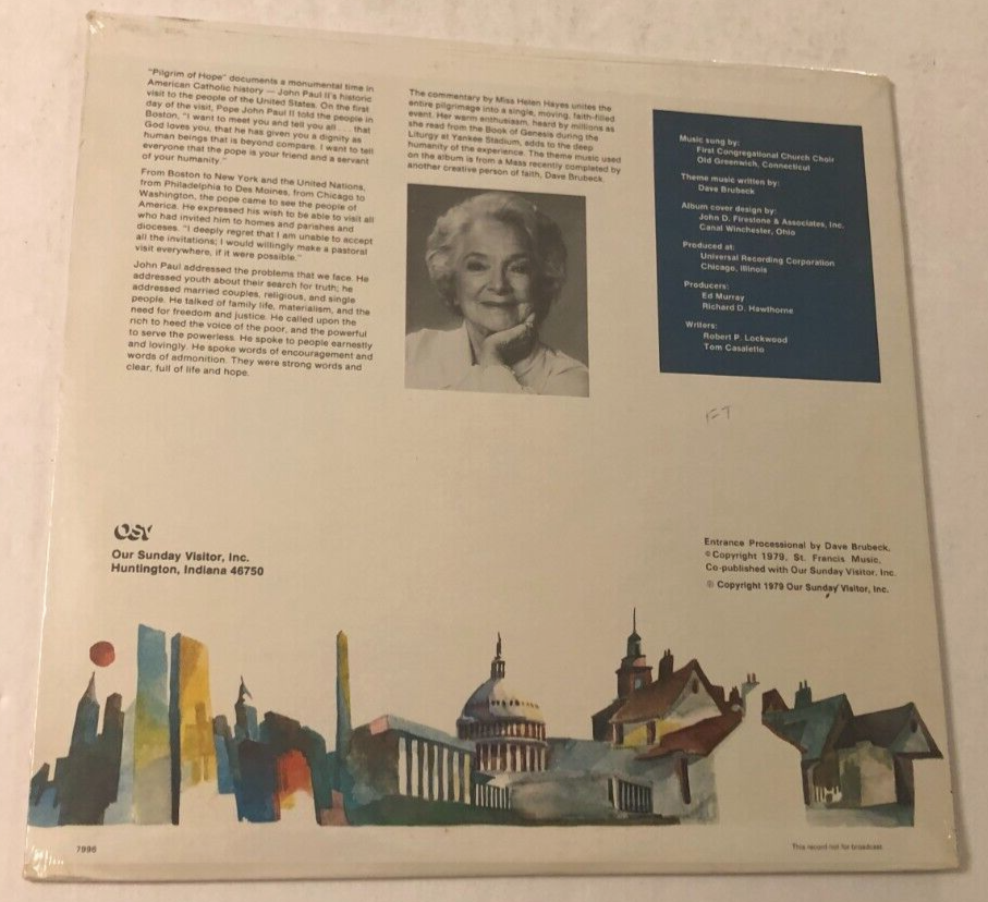 This is a vintage 1970s United States vinyl LP titled "Pope John Paul II Pilgrim Hope" by Helen Hayes. The record features spoken word content in English, has a speed of 33 RPM, and comes in a cardboard sleeve with a black vinyl material. It was released by Our Sunday Visitor, Inc. with catalog number 7996, and includes the original cover. I have been collecting since the early 70s and have over 5,000 plus albums and 45s combine in my collection. I am downsizing and will list as many as I can daily. Please check my listings in the records category in my eBay store @ https://stores.ebay.com/thesixties. Any questions or concerns, feel free to contact me. Thank you. Sale conditions for all new/old stock vintage (20+ years) still-sealed record albums only *Please read the condition description carefully. *Visual grading only, to the best of my ability. *No returns accepted on all sealed albums if opened or shrinkwrap removed. *All returns must be in same condition when received. *All sealed albums are listed and sold as collectible, investment, and/or future PSA grading, and not as a playing copy. *For playing and enjoyment, I recommend an excellent to near mint copy. *Please note: (New and sealed only) Album cover with minor creases, and flaws such as dented and/or creases corners, shrink-wrap with partial tears, and ring wear are possible. *If you have any questions or concerns before buying, feel free to contact me. Thank you. Vintage 70s Our Sunday Visitor, Inc. 7996 Stereo Helen Hays "Pilgrim of Hope" (1979) Vinyl LP Condition: New. Old stock. *This was recently pulled from storage after 35+ years of collecting. See photos provided for more details and condition.