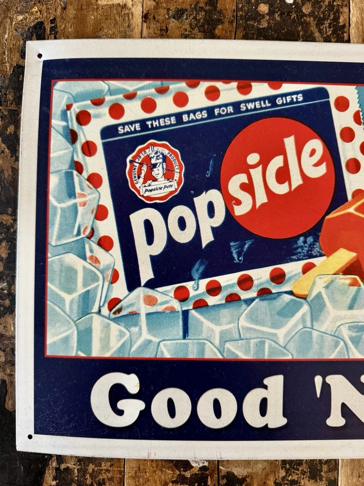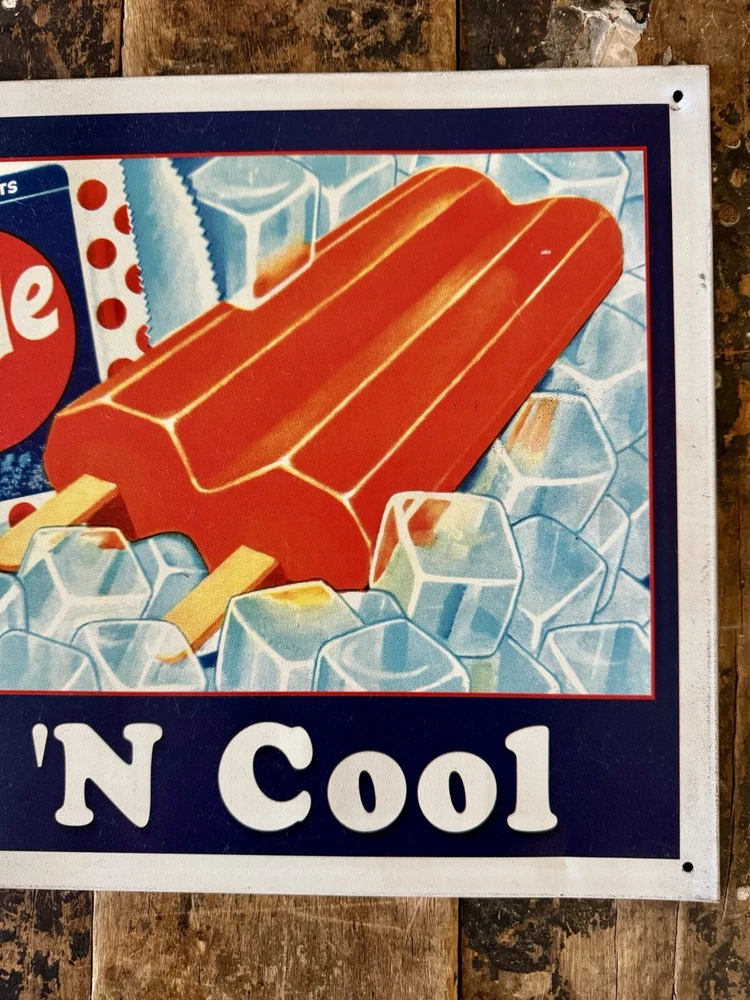 Popsicle Good ‘N Cool Tin Desperate Sign US Made Advertising Popsicle Pete 2002 16”W x 10.5H 2002 Good Humor-Breyers Ice Cream Licensed Item is used and shows signs of age, use and wear Please review photos and ask questions for best condition description