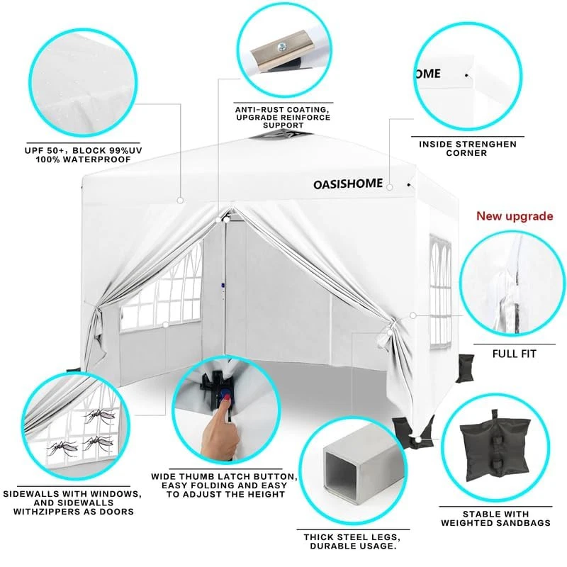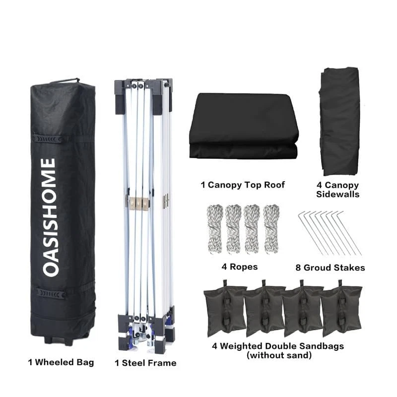 Thicker steel anti-rust coating frame, with legs width 28mm, and cross-bar width 28x12.8mm for the top bracket, sturdy and durable. 150 deniers high-density fabric water-resistant canopy roof, with silver-plated PU lining, can block 99% of harmful rays of sunlight (note: the canopy top looks with color silver not as pure white). The sturdy frame is designed to be easily open and easily fold via its super convenient thumb latch button system. Set up is so easy, to finish the entire assembly work only needs two persons and takes a few minutes without tools. Take out the frame and the roof from the wheeled bag and unfold it ajar, unfold the top roof and put it over the frame, then pull 4 legs to each corner end fully, extend the legs, and 4 sidewalls can be installed or disassembled according to different occasions. Three different sidewall height settings, 72 inches, 76 inches, and 80 inches, more headroom for inside activities. Portability, this tent comes with a bonus roller bag with heavy-duty wheels, made of 600 deniers coated PVC fabric, put into a vehicle effortlessly and take to any place. It also can be a storage bag for the canopy tent without occupying space. What is included, 10x10 Ft pop-up frame; 10x10 Ft top roof; 4 removable high-density fabric sidewalls, 2 of that are with zippers as doors, and 2 of that are with windows for view; bonus 1 upgraded durable carry bag; 8 tent stakes; and a set of ropes. Multiple uses, this canopy provides 10'x10' shade coverage, big enough for 6-8 people with a table inside at the same time. It is suitable for patio, backyard, garden, wedding party, beach, outdoor sports, trade show, art event, camping, disaster relief, and more. Reminder, to prolong the service life of the canopy tent, please do not use it in strong wind, heavy rain, snow, storm, and bad weather accordingly.