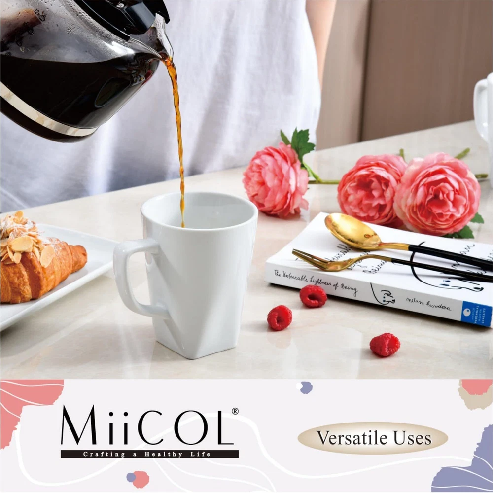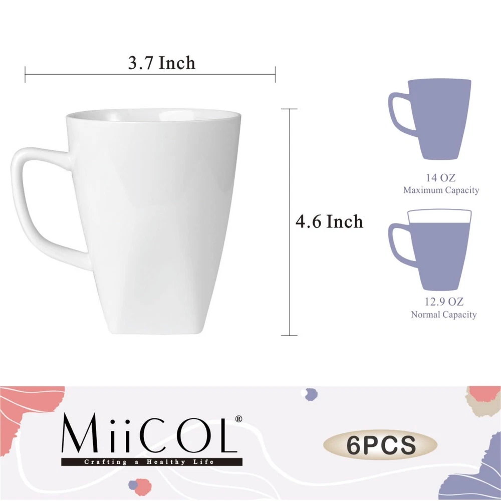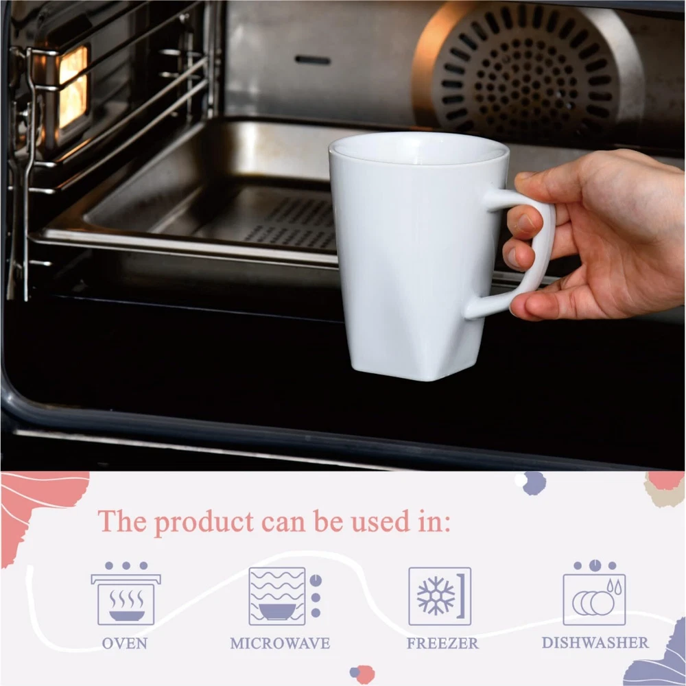 Large Capacity: Each mug can hold up to 400 mL(Capacity:14 oz, Dimension:Ø3.7 x H4.6 inch), providing plenty of room for your favorite beverage like coffee, cocoa, tea, milk, and juice Premium Quality: Crafted from high-quality porcelain, coffee mugs are sturdy and durable(Weight:0.4 kg per piece), ensuring long-lasting use Stylish and Practical: The sleek white design with a square bottom adds a touch of elegance to your coffee or tea time. The handle offers a comfortable grip, making it easy to hold and enjoy hot drinks Convenient and Safe: The cups are microwave and dishwasher safe for your convenience; The smooth, glazed surface is easy to clean and prevents any unwanted stains or odours Well Packaged: Each set of coffee mugs is carefully packaged to ensure they arrive in perfect condition
