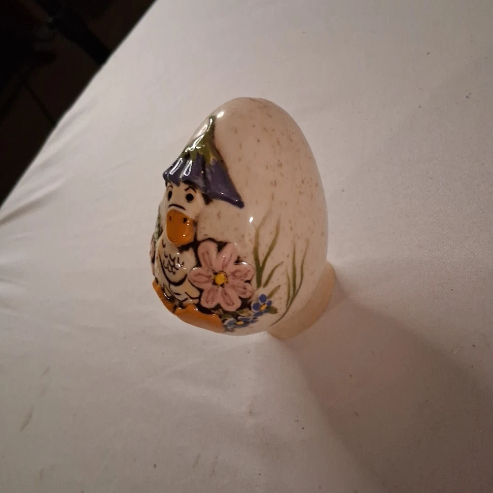 The "Porcelain Egg 3inch Baby Duck" is a small collector egg featuring a baby duck design, belonging to the Animals collection under the theme of Baby. Made of porcelain, this multicolored egg measures 3 inches in length and is adorned with a cute duck motif. Ideal for collectors or as a decorative piece, this item adds a charming touch to any space with its delicate design and whimsical subject matter.