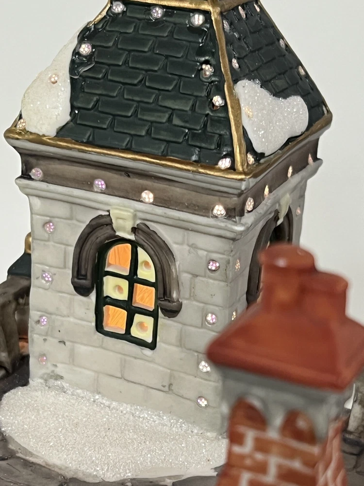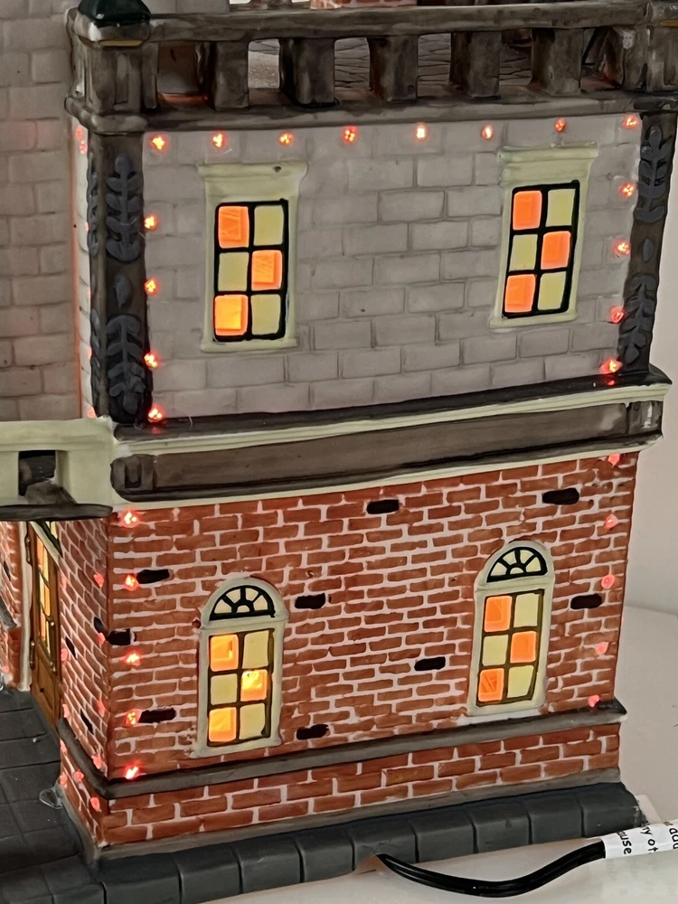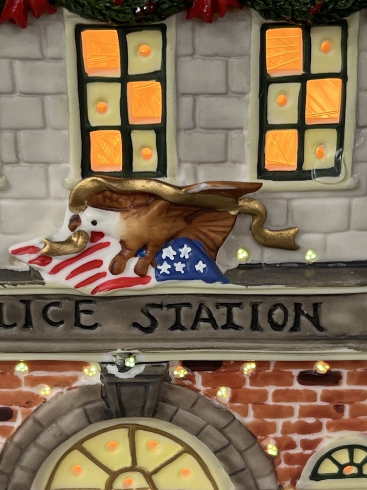 This is a medium-sized O’Well Novelty porcelain Christmas village piece from 2005. It features an illuminated, color-changing 3D effect of a whimsical fiber optic police station. The hand-painted, American-style house is suitable for seasonal display in any room. It comes in a box with a 12-volt adapter, part of the Deluxe Fibre Optic House collection. Perfect for collectors of holiday decor. Absolutely perfect pristine condition! Color changing lights , incredible detail , comes with power cord , all original packaging and original box ! Just a beautiful piece to display.