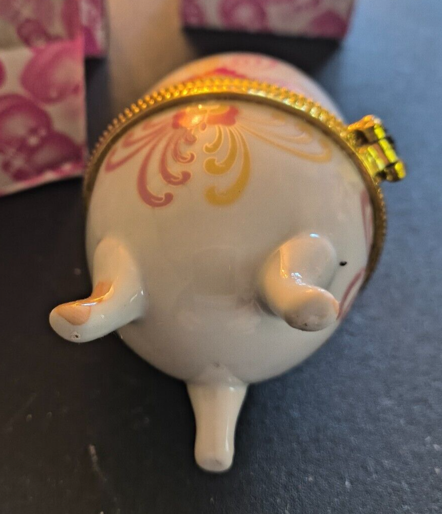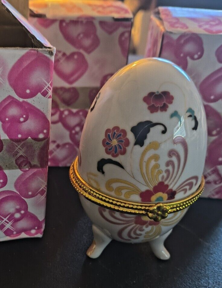 Item Length: 3 in Engraved: No Subject: Egg Packaging: Box Department: Adults Closure Type: Snap Style: Retro Brand: Exotic Imports Number in Pack: 1 Care Instructions: Clean with Damp Cloth Original/Reproduction: Original Finish: Painted Size: Small Country/Region of Manufacture: China Features: Boxed Customized: No Pattern: Floral Production Technique: Mass Production Room: Any Room Theme: Periods & Styles, Romantic, Wildlife, Flowers, elegance Item Height: 3 3/4 in Handmade: No Material: Porcelain Time Period Manufactured: 2000-2009 Color: Multicolor Type: Trinket Box Shape: Oval Occasion: All Occasions Item Width: 3 in
