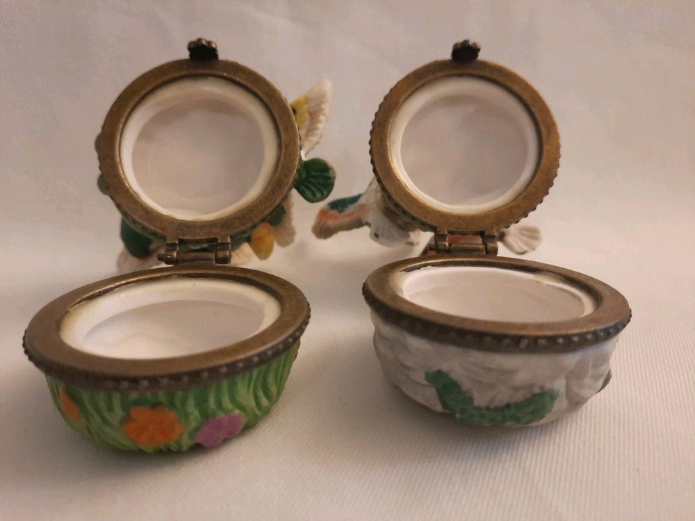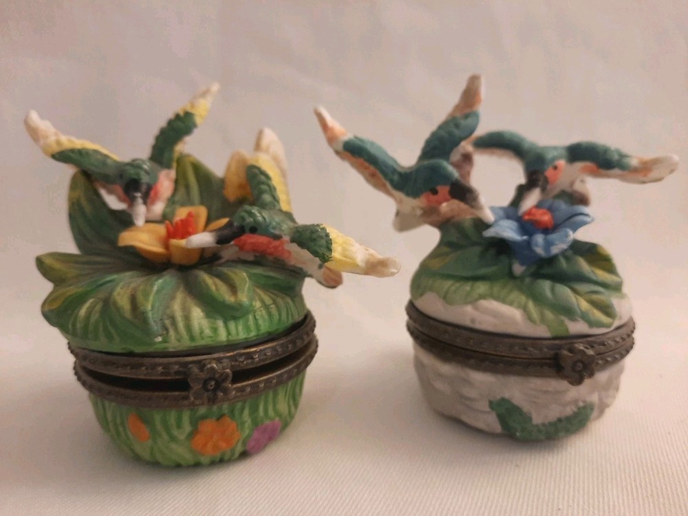 Room: Any Room Size: Small Country/Region of Manufacture: China Finish: Matte Collection: Keepsake Boxes Features: 3D Effect, With Lid Number in Pack: 2 Material: Ceramic Theme: Bird, Hummingbird, flower, Nature, Jewelry Subject: Bird Occasion: All Occasions Feature: Ornament, Home decor, Figurine, Vanity Department: Girls, Teens, Adults Color: Multicolor Closure Type: Snap Suitable For: Furniture Type: Trinket Box Item Height: 2.5 in Brand: Unbranded Pattern: Flower