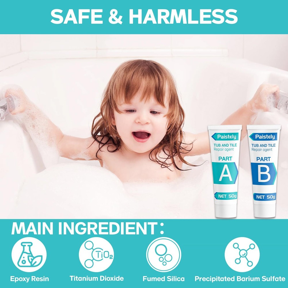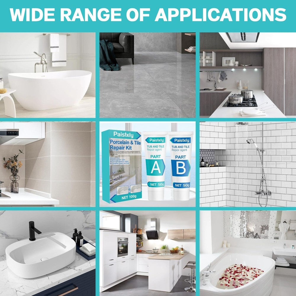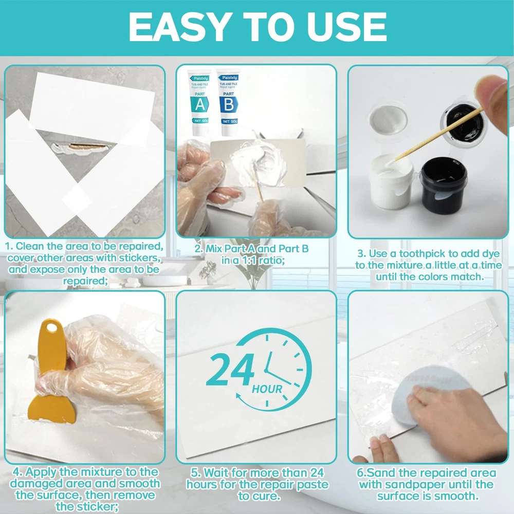 Porcelain Repair Kit, Tub, Tile and Shower Repair Kit, Waterproof and Leak-Proof Fiberglass Tub Repair Kit, Tile Repair Kit for Ceramic, Porcelain, Marble, Quartz, Resin, Granite and More Perfect Repairability: Epoxy resin, the main component of porcelain repair kit, has strong adhesion and wear resistance, which can perfectly cover cracks, holes, etc., and complete repairs easily. Water-resistant, leak-proof, heavy-duty epoxy provides a high gloss when fully cured, leaving surfaces looking new Safe & Harmless: The components of the fiberglass tub repair kits are epoxy resin, precipitated barium sulfate, fumed silica, and titanium dioxide. The ingredients are safe, formaldehyde-free, non-toxic and tasteless. When using the bathtub repair kit, put on the matching disposable gloves first, and then you can use tub repair kit with more peace of mind Wide Range of Applications: Porcelain sink repair kits are suitable for every home. Tile repair kits can be applied to materials such as enamel, fiberglass, porcelain and acrylic. Great restoration for bathtub tile flooring, kitchen table and sink, toilet, scratches, dent, wear and holes Cost-effective Kit: The porcelain sink repair kit is complete with accessories, including porcelain repair agent A and B ( 50g*2), scraper*1, sticker*3, sandpaper*3, stirring plate*1, plastic gloves*2, wooden stirring rod *2, color paste*4. Bath repair kits are easy to use, quickly repair damaged areas, and save money by eliminating the need to replace expensive tubs Thoughtful After-sales Service: If you are not satisfied with the porcelain repair kit you received, or if the paste overflows due to the shipping process, please feel free to contact us, and we will be happy to provide you with replacement or refund services Paistely fiberglass tub repair kit Easy to use Safe and non-toxic Fast and powerful fix Complete repair kit This is probably the case in everyone's home: The tile countertops, sinks, and bathtubs in the bathroom can break down over time. If it is not handled in time, it will not only affect the appearance, but also easily cause greater damage or even permanent damage. If you don't want to resurface your tub or tile (or sink, etc.), a porcelain repair kit is a great option. Paistely Tile Repair Kits are strong adhesion and abrasion resistant, perfectly cover cracks, holes, etc., and easily repair unsightly breakages. The operation is simple, everyone can complete the repair by themselves, saving the cost of replacing the bathtub, etc., it is a very cost-effective choice. Paistely porcelain repair kit includes: Repair agent A and B bottles (50g*2), scraper*1, sticker*3, sandpaper*3, stirring plate*1, plastic gloves*2, wooden stirring rod*2, color paste*4 Repair agent A and B bottles: need to be mixed in a ratio of 1:1 Scraper: Apply the paste until smooth Stickers: cover other areas, only reveal the areas that need to be repaired Sandpaper: After curing, sanding with sandpaper can make the surface smoother Stirring plate: Put A and B parts on it to mix, it is more convenient Plastic gloves: prevent your hands from getting dirty Wooden stirring stick: easy to take out A and B paste and mix Color paste: free to adjust the color you need INSTRUCTIONS: 1. Clean the area to be repaired, cover other areas with stickers, and expose only the area to be repaired; 2. Mix Part A and Part B in a 1:1 ratio on the white stirring board; 3. Apply the mixture to the damaged area and smooth the surface, then remove the sticker; 4. Wait for more than 24 hours for the repair paste to cure. 5.Sand the repaired area with sandpaper until the surface is smooth. Warning: The porcelain sink repair kit needs to wait for more than 24 hours to cure; When using our tile repair kit, Part A and Part B must be mixed in a 1:1 ratio, otherwise it may not dry; Keep this product in a cool place out of reach of children. Shipping We offer FREE shipping on all orders! We ship within Three business days of payment, usually sooner. We use a selection of shipping services such as UPS, FedEx, USPS etc. We only ship to the lower 48 states, no APO/FPO addresses or PO Boxes allowed. Local pickups and combined shipping options are not provided at this time. Return You can return a product for up to 30 days from the date you purchased it. Any product you return must be in the same condition you received it and in the original packaging. Please keep the receipt. Feedback Customer satisfaction is very important to us. If you have any problem with your order, please contact us and we will do our best to make you satisfied. Contact Us If you have any queries, please contact us via ebay. We usually respond within 24 hours on weekdays. Please visit our eBay store to check out other items for sale! Thank you for shopping at our store.