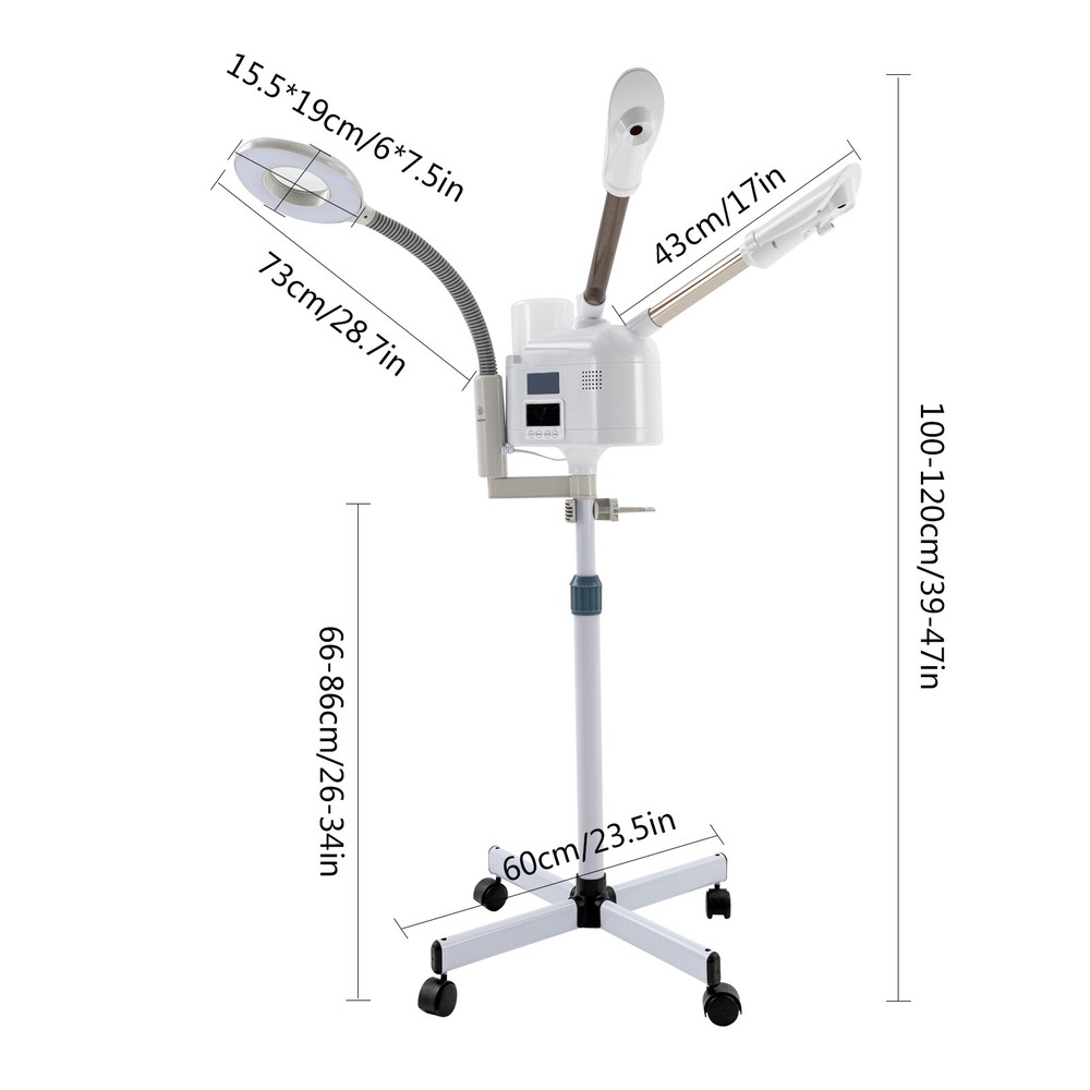 Package Included 1*3 in 1 Facial Steamer 1 Set* English Manual 4* Universal Wheels All Accessories for Assembly Pro Facial Steamer Ionic Ozone Cold & Hot Mist Stand for Salon Skin Cleaning New Pro Facial Steamer Ionic Ozone Cold & Hot Mist Stand for Salon Skin Cleaning New Description Nowadays, Staying up Late at Night and Working Overtime, Staying in Air-conditioned Rooms for Long Periods of Time, Exercising Resulting in a Lot of Sweating, Etc. All Accelerate the Loss of Skin Moisture. Then You Need This 3 in 1 Facial Steamer to Improve Your Skin. It Speeds up the Microcirculation of Your Skin and Moisturizes and Sterilizes. Deep Cleansing, Hydration, and Nourishing Skin Care Will Allow You to Complete a Whole High-quality Skincare Routine at Home. Don't Hesitate Because Your Skin Can't Wait! Key Features Skincare Assistant : This 3 in 1 Facial Steamer with Hot and Cold Double Tubes and 5x Super Clear Led Light Can Accelerate Skin Microcirculation, and Has Moisturizing and Anti-corrosion Functions. It Enables You to Complete a Set of High-quality Skin Care Procedures at Home, Which Is Economical and Convenient. The Secret of Keeping Young : It Uses Ozone Atomization to Disinfect, Soften the Cuticle, Improve Blood Circulation, Etc. It Can Effectively Relieve Nerves, Promote Metabolism, and Restore Young and Firm Skin. Cold and Hot Spray Mode : It Has an Independent Hot and Cold Double Spray Mode, Which Is a Family Spa Used Throughout the Year. the Hot Spray Accelerates the Metabolism Products to Further Clean the Pores, and the Cold Spray Can Calm the Skin and Relieve the Water-oil Balance of the Skin. High-quality Material : This 3 in 1 Facial Steamer Is Mainly Made of High-quality Plastic and Hardware, so It Is Not Only Safe but Also Durable. Under Normal Operation, It Can Meet Your Long-term Skin Care Needs. Easy to Use : the Lcd Operator Panel Can Be Easily Switched on and off and Timed from 0-30min, so You Can Enjoy Your Spa in the Comfort of Your Own Home. Deep Hydration : This 3 in 1 Facial Steamer Is Larger than Conventional Standing Facial Steamer Sprays and Turns Water Molecules into Nano-particles Through High-frequency Vibrations. It Keeps the Skin Hydrated for 8-15 Minutes a Day and Effectively Improves Dull Skin and Brightens Skin Tone. Deep Cleansing : It Uses Ionic Vaporization Technology to Produce Ultra-fine Steam That Is Easily Absorbed by the Skin. It Penetrates the Skin Better than the Basic Hot Water Standing Facial Steamer, Thus Achieving a Deep Cleansing Effect. Comfortable Beauty Experience : Both the Body and the Spray Tube Can Be Rotated 360 Degrees. in Addition, the Height of the Machine Can Also Be Adjusted Between 39in and 47in, so You Can Choose to Sit or Lie down for a Pleasant Facial Time. Easy to Clean : This 3 in 1 Facial Steamer Has a Removable Water Tank, so It Is Very Easy to Remove and Clean. It Also Allows You to Say Goodbye to Limescale from Now on, and No Longer Worry About Cleaning . Ptc Heating Technology : It Uses Innovative Ptc Heating Technology, so It Can Achieve Fast Heating and Delicate Atomization. in Addition, It Will Be Safe from Power Failure and Interference, Adding More Protection for Your Use. Safe and Secure : When the Machine Does Not Detect the Water Level the Machine Will Automatically Cut off the Power. in Addition, the Warm Steam of 42℃ Is Very Friendly to Our Skin, so You Can Use It with Confidence. Great Stability : It Uses a Crossed Base to Support the Whole Machine, so It Is Very Stable and Will Not Shake and Collapse. Details Independent Transparent/Large Capacity Water Tank : It Adopts a 33.81oz Independent Transparent Water Tank Design, Which Can Hold More Water at One Time and Allows You to Control Water Volume More Intuitively. Germicidal Lamp: This Facial Steamer Has a Built-in Germicidal Lamp That Destroys Harmful Bacteria for Gentler and Cleaner Hydration. Universal Wheels : Each of the Four Kickstands Is Installed with a Universal Wheel That Has Brakes, so You Can Move It from the Bedroom to the Living Room and Fix It at Will, Which Is Very Convenient. Heat Dissipation Holes : the Machine Body Is Designed with Dense Heat Dissipation Holes, Which Can Effectively Dissipate the Heat Generated by the Machine's Operation and Extend Its Service Life. Application It Can Be Used at Home to Allow You to Achieve a Skin Care Spa at Home, and It Can Also Be Used in Beauty Stores to Provide Better Quality Skin Care Services to Customers. Specification Material: Plastic, Hardware Color: White Item Type: Facial Steamer Machine Power: 25w Water Tank Capacity: 1000ml/33.81oz Spraying Time: 0-30min Magnifying Magnification: 5 Times Plug Voltage: 110v, 60hz Plug Type: Us Plug Adjustable Height: 100-120cm/39-47inch Bar Height Range: 66-86cm/26-34inch Beauty Lamp Length(with bar): 73cm/28.7inch Beauty Lamp Size(L*W): 15.5*19cm/6*7.5inch Hot Jet Pipe Length: 43cm/17inch Cold Jet Pipe Length: 43cm/17inch Base Size(Diagonal): 60cm/23.5inch Gross Weight: 5.2kg/11.5lbs Net Weight: 5kg/11lbs Package Size: 69*18*28cm/27.2*7*11inch Package Included 1*3 in 1 Facial Steamer 1 Set* English Manual 4* Universal Wheels All Accessories for Assembly Notes It Is Recommended to Use Tap Water for the First Three Times, Then Distilled Water or Pure Water Can Be Applied in Later Use. Please Read the Operating Manual Completely Before Use. and Pay Particular Attention to the Safety Instructions Included. Please Allow the Slight Color Difference Caused by the Shooting Light and 1-3 Cm Error Due to Manual Measurement, and Make Sure You Do Not Mind Before Ordering. Payment Delivery details Terms of sales About us Contact us Payment We accept ebay payment 。 Fees such as import duties, taxes are not included in the item price or shipping costs. These charges are the buyer's responsibility. Delivery details Shipping: 2-9 working days to: USA Terms of sales We maintain high standards of excellence and strive for hundred percent customer satisfaction. Feedbac