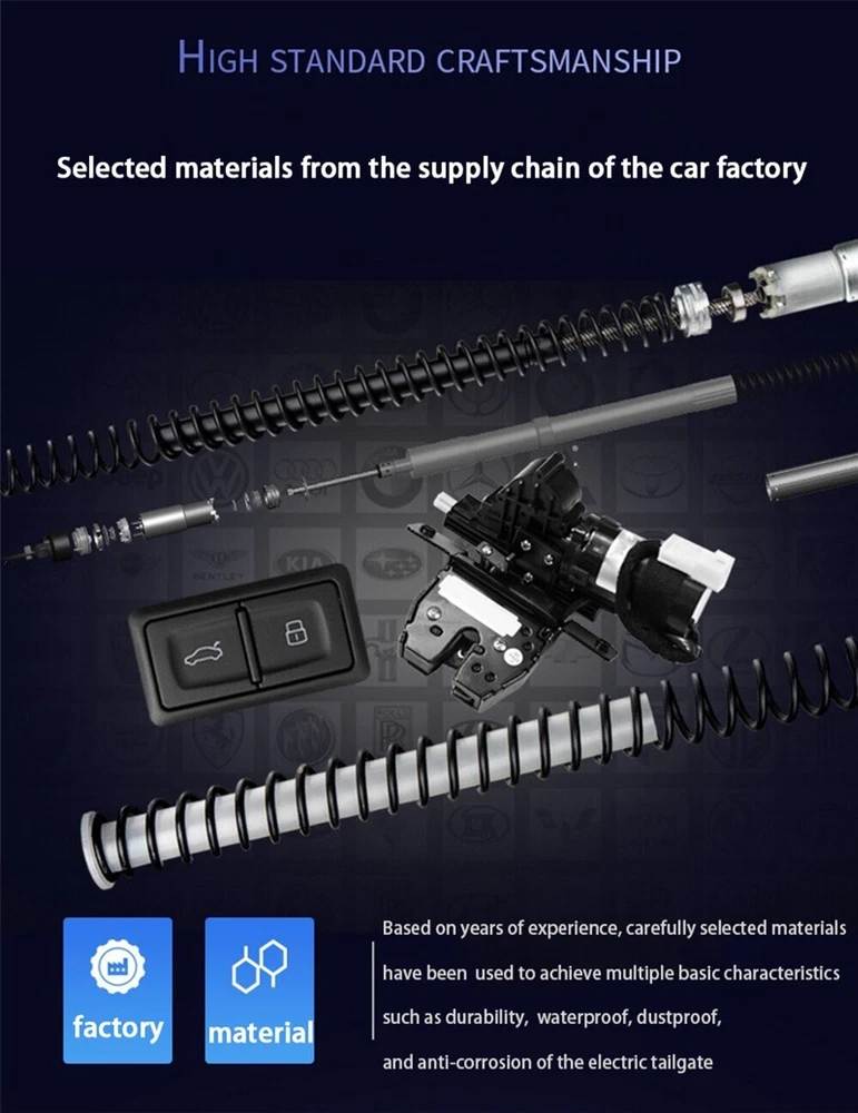 NEW-00002 100% Genuine High Quality Fast Shipping Car Electric Tail Gate Lift Tailgate System for Porsche Cayenne 92A E2 2011–2018 PRODUCT INCLUDES Note: Please do leave messages on your vehicle type, year and provide an e-mail address to receive the detailed installation guide when placing an order! Suitable for vehicle models: Car Electric Tail Gate Lift Tailgate System for Porsche Cayenne 92A E2 2011–2018 Nine Core Technologies: 1. Remote control 2. Height adjustment 3. Intelligent anti-clip 4. Abnormal alarm 5. Smart electric suction 6. Ultra-silence 7. Double pole support 8. Safe access to electricity 9. Nondestructive installation Specifications: Item Name: Car Electric Tail Gate Lift Place of Origin: Shenzhen, Guangdong, China Brand Name: AutoBora Material: Aluminum Alloy Function: Automatic Opening and Closing,height adjustment, sound alarm, water proof, anti-pinch Installation: Plug in connection, easy to install Position: Rear trunk Waterproof: Level IPX7 Application: Automatical Car Trunk Opener Multiple operating modes: Four operation modes, comfortable and worry free 1. Original car key control Control the tailgate switch without the need for additional keys or modified keys 2. Driver control Different car models have different buttons, and the buttons are defined according to the car model 3. Tailgate button control No need to exert great effort, just press lightly to open or close the tailgate 4. Foot sensing control Easy to open the tailgate with foot sensing Intelligent anti pinch: The intelligent electric tailgate will automatically stop when encountering obstacles during the opening or closing process, effectively preventing pinch injuries The tailgate height can be freely adjusted: Height can be freely adjusted and locked for record management. People of different heights can set the opening height that suits them Abnormal alarm: If the tailgate is not tightly closed or encounters obstacles during the opening and closing process, the built-in buzzer will continuously sound a warning to remind the owner to close the car door Silent and smooth: The tailgate adopts comfortable and silent technology, with a running sound as low as 42DB, providing a comfortable driving environment Intelligent adsorption: Electric suction lock door, automatically pulls and locks at the moment of closing the door to prevent accidents caused by not closing the door properly Kick sensing door opening: Release both hands, slightly lift your foot under the rear bumper for easy and quick opening of the tailgate, simple and efficient Dual pole synchronous operation: More stable support Dual pole dual motor drive, uniform force operation, and smoother support Hydraulic damping cylinder: The electric tailgate push rod is a necessary component for controlling the tailgate movement trajectory (including hovering at any position) Directly plug in installation: No need to damage the original vehicle circuit, directly plug in the original vehicle interface without damaging the original vehicle circuit, and without affecting the overall vehicle warranty FAQ: Installation problem We recommend that you search for a professional garage installation repair technician The quality of the product Before the product leaves the factory, after 7 days of testing, before delivery, we will check the accessories and the ignition test to ensure the quality of the products. Package: The packaging is packed in a foam box and a cardboard box Logistica: Tailgate interior (additional) dedicated tailgate electric button (Some models have different shapes) Due to the large number of models, this page is just a sample of some models. Please refer to the product specifications and quantity (the use of the electric tailgate function is not affected). Please understand, thanks More more product installation and display models, other models can contact customer service, we have developed more than 1000 models, thank you PaymentShippingReturn policyAbout usContact us Copyright © - Tongtool All rights reserved | Design:Tongtool