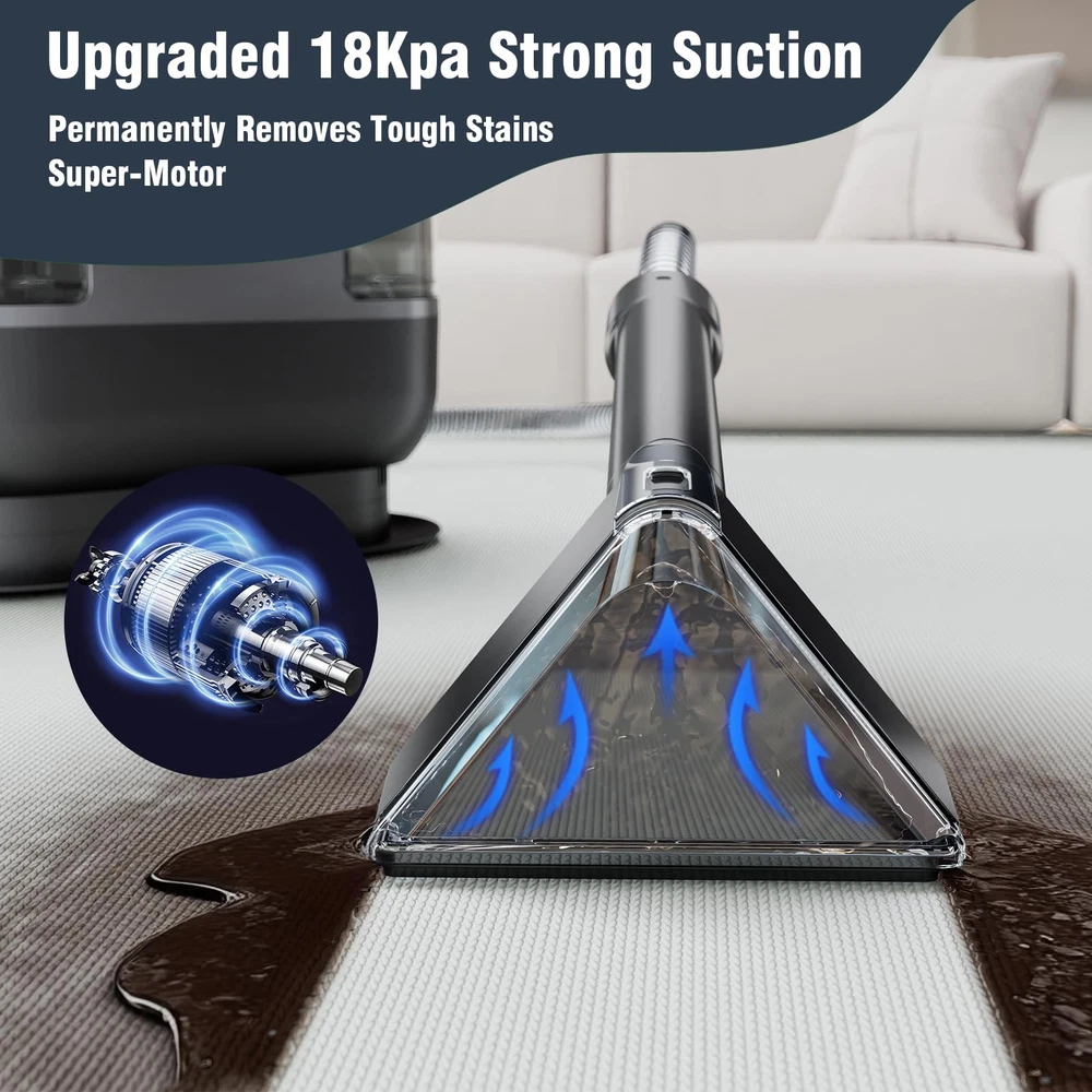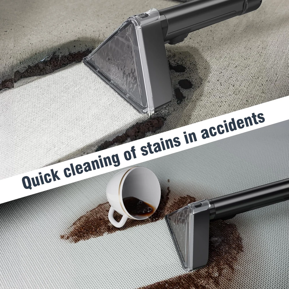 Fabric cleaning machine 【POWERFUL SUCTION FOR QUICK REMOVAL】Carpet cleaner machine is equipped with a 500W motor, which can provide a super suction force of 18Kpa, which can permanently remove stubborn spots and stains like mud, wine, pet messes and more from carpets, upholstery and car interiors. Also, equipped with a strong suction system, ensure that the carpet can dry quickly after cleaning, quickly return to its normal state. 【DUAL WATER TANK & BRUSH HEAD】0.75L sewage tank and 1.20L clean water tank are stored separately, allowing you to easily disassemble the water tank for filling, draining, and cleaning. Tips: The water volume of the dirty tank can't exceed the MAX line, otherwise it may cause the suction of the couch cleaner to stop. The upholstery cleaner machine is equipped with two sizes of brush heads, which can be used for stains in different areas. 【PORTABLE CLEANING】The upholstery cleaner machine comes with an ultra long hose (5.57ft) and power cord (17.06ft), and the small carpet cleaner machine is lightweight and easy to move from one cleaning job to the next. The brush and power cord can be stored on the machine's hook to save space. 【TOOLS FOR EVERY MESS】The carpet cleaner machine is for fabric cleaning that cannot be cleaned as a whole, such as sofa, mattress,car seats,and other hard-to-clean items, conserving water resources and minimizing damage to carpeted furniture caused by repeated cleaning, thereby extending its service life. 【7×24 Hour Customer Service】We are confident in this Carpet Cleaner Machine and so will you. If for some crazy reason you are not 100% satisfied or your Carpet Cleaner Machine accessory is damaged, please feel free to contact us! We will solve the problem for you quickly. Don't worry about after-sales service! We will always be at your service.