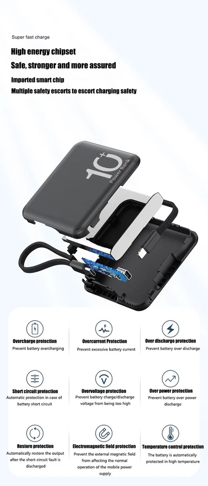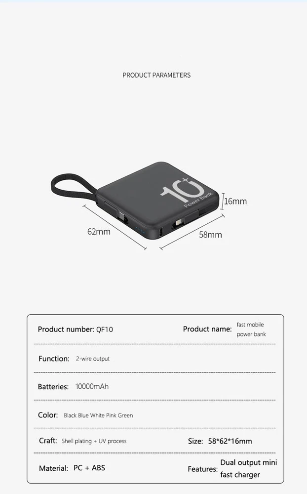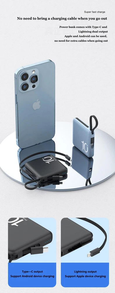 Free and fast shipping , shipping take up 1-7 Business Days 30 Day Return Accepted EASY PAYMENT via PayPal, Credit Card, PayPal Credit, Google Pay... Power Bank 10000mah Mobile Phone Plastic Mini Multicolor 2-usb 5v Backup 10w Друзям в Україні зверніть увагу:оскільки логістика " Standard Shipping" не може транспортувати чисту електричну продукцію, тому я буду використовувати інші чисті електричні логістичні транспортні продукти після того, як ви купите товар, якщо у вас виникнуть запитання, ви можете проконсультуватися з продавцем, дякую 10000mAh Portable Power Bank built-in Type-C & lightning cable 5000mah 22.5W Fast Charging External Auxiliary Battery Powerbank for iPhone 15 14 13 Samsung Xiaomi HUAWEI [Product capacity] :10000mAh 5000mAh 5000mAh parameters TYPE - C input: 5 v / 2 a Type-c comes with the cable output :5V/2A LIGHTING comes with wire output :5V/2A Battery capacity :5000mah Rated capacity :3000mah Weight :97.6g(bare) 138G (with color box) Product Size: 64.6 * 62.8 * 18 mm 10000mAh parameters: TYPE - Cinput: 5 v / 2 a Type-c has a built-in cable output :5V/2A LIGHTING comes with wire output :5V/2A Battery capacity :10000mah Rated capacity :6000mah Weight :170.5g(bare)212G(with color box) Product Size:64.6 * 62.8 * 32 mm Material: ABS + PC Color: Black, white, pink, blue, green [Standard configuration] : packaging +machine + data cable + manual REVIEWS The product came very well packaged. I'm very happy. thank you for everything. Seller strongly recommended. This is great! I definitely recommend! Product looks amazing Delivery was fast. Excellent seller, great communication. I advise everyone to buy it!