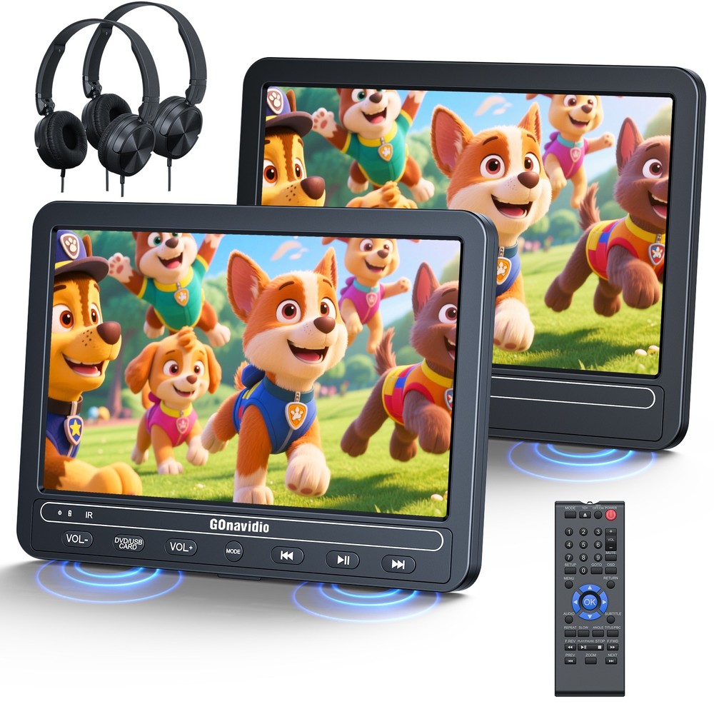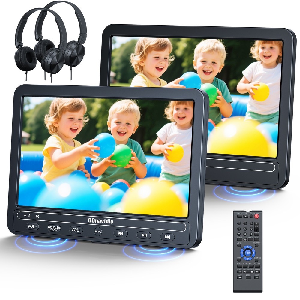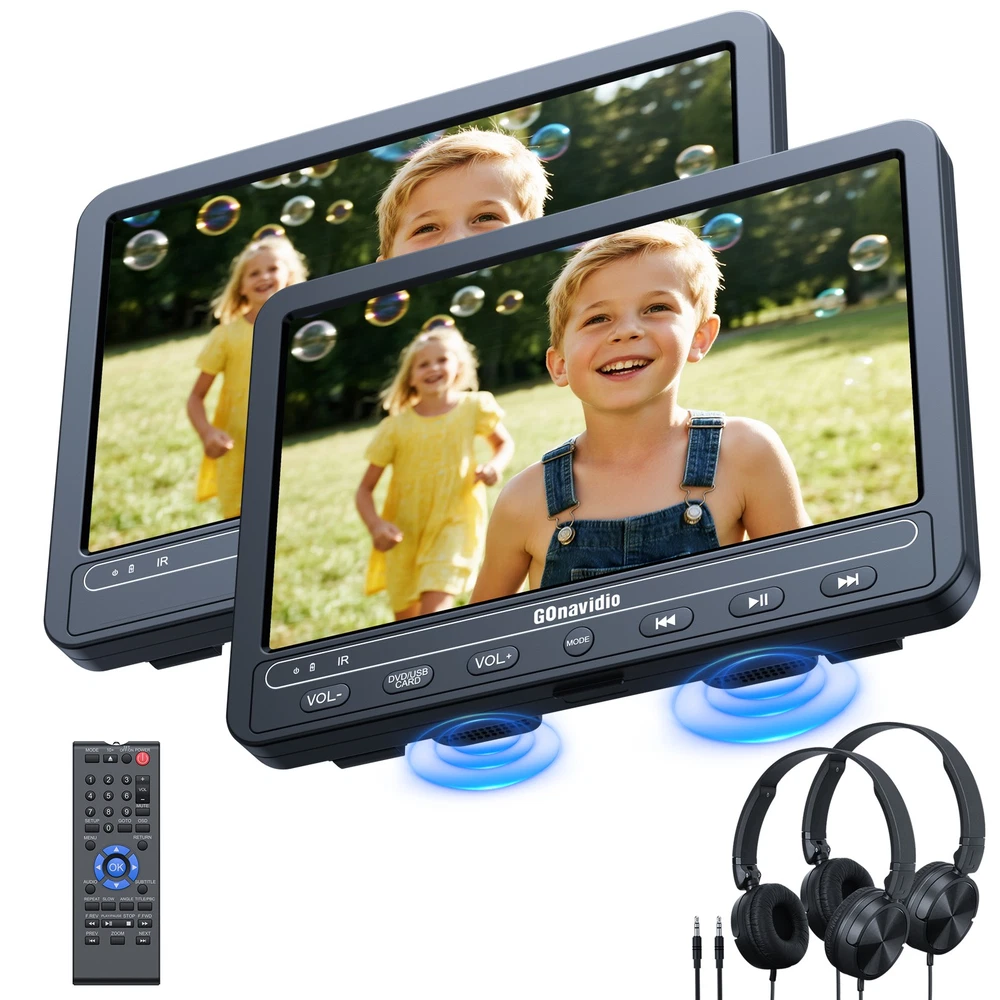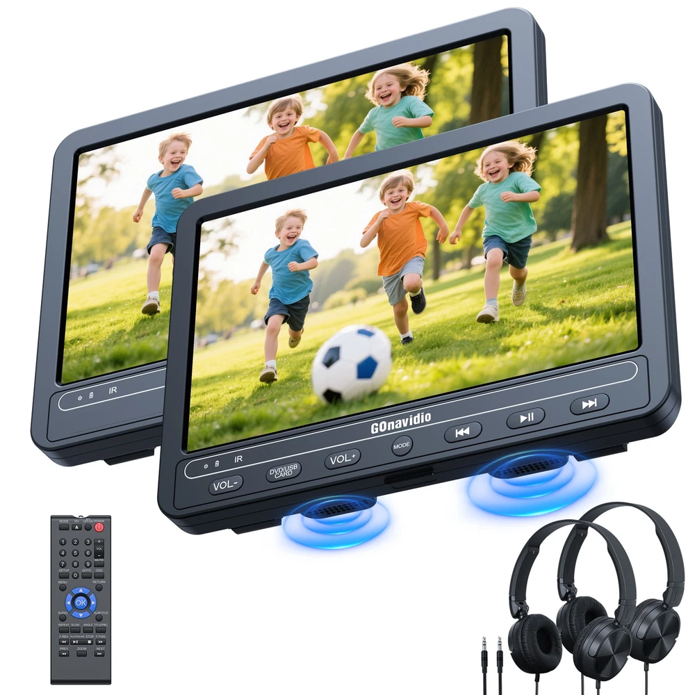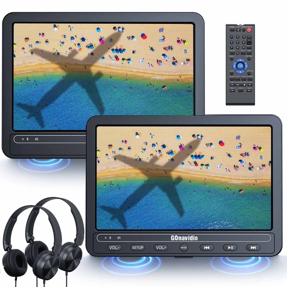【5-hour Playing Time】With a built-in 2500mAh rechargeable Li-ion battery, these dual-screen portable DVD players support up to 5 hours of solo playback and 2.5-3 hours of sync playback after one full charge. AC power adapter and Car Charger are included in the package, the perfect rear seat entertainment system for long-time travel or daily use at home. 【Sync Playback on Both Screens】With the AV cable (included in the package), you can connect the host DVD player and slave monitor to play the same movie or video (Do not support separate playback). 【Dual Louder Speakers】Built-in 2 upgraded stereo speakers on each unit provide you with louder and clearer stereo sound, so you can hear every detail of the movie. Each unit also owns a 3.5mm headphone jack to connect with headphones (included) o Key Features: Ø 【5-hour Playing Time】With a built-in 2500mAh rechargeable Li-ion battery, these dual-screen portable DVD players support up to 5 hours of solo playback and 2.5-3 hours of sync playback after one full charge. AC power adapter and Car Charger are included in the package, the perfect rear seat entertainment system for long-time travel or daily use at home. Ø 【Sync Playback on Both Screens】With the AV cable (included in the package), you can connect the host DVD player and slave monitor to play the same movie or video (Do not support separate playback). Ø 【Dual Louder Speakers】Built-in 2 upgraded stereo speakers on each unit provide you with louder and clearer stereo sound, so you can hear every detail of the movie. Each unit also owns a 3.5mm headphone jack to connect with headphones (included) or external speakers for various listening experiences. Ø 【Support USB and SD Card】With built-in USB port and SD card slot, the DVD player for car allows you to play all of your downloaded media (VOB, AVI, MPEG1, MPEG2, XVID, MPG, 3GP, MP3, WMA, JPG, JPEG), you can enjoy your videos, music, and photos on the road. Ø 【Region Free & Last Memory】No restriction for discs from all regions: CD, DVD, CD-R/RW, DVD±R, DVD±RW, VCD, SVCD, etc (Blu-Ray not Supported). The Last Memory function keeps your viewing progress and always starts from where you leave off. Enjoy all your collections from now on! Technical Specification: Screen Size: 10.5 inch HD TFT LCD Screens Resolution:1024*600 LED back light Supported Formats: DVD/SVCD/VCD/CD/MP3/JPG/AVI/AVI/MPEG/DIVX Battery: 1 Lithium Polymer batteries required. (included) Charging Time: more than 6 hours Playing Time: the main player can keep running for 5 hrs, or the both monitors could work together for about 2.5-3 hrs Box size: 15.9 x 9.7 x 5.4 inches Gross weight: 5.49 Pounds Package 1x DVD player 1x LCD monitor 1x AC adapter 1x Car charger 1x IR Remote control 1x DV cable 1x AV cable 1x User manual 2x Mounting Strap 2x Headphones