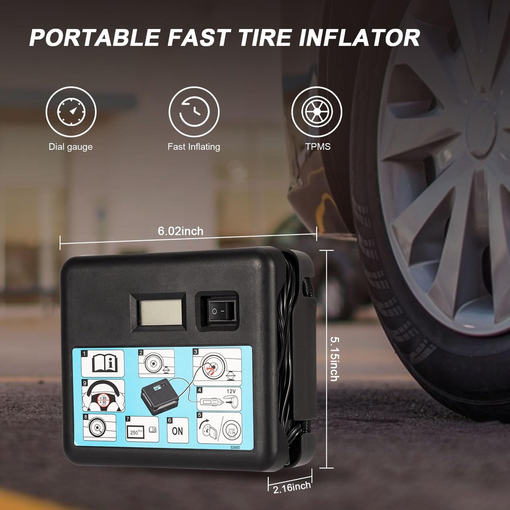 【7 Min Fast Inflation & Easy Operation 】The air tire inflation pump with compact size can inflate 0-680KPA to standard automobile tires in 7 minutes, Just connect the power and press the on/off switch, then the tire inflation pump will start to do all the work. 【Digital Display & Low Noise Design】: This tire inflator is equipped with a large high-precision and high-brightness display to help you check the tire pressure and preset the tire pressure values. The tire inflator of low noise motor adopts special motor technology to realize low noise. 【Wide Application Tire Inflator】Portable compressor can inflate the vehicle tires of cars, motorcycle and bicycles by different nozzle. And inflate balls/ swimming ring/ air pillows/ cushions and mattresses for outdoor activities with accessories nozzles , more energy saving and oil saving 15% at work. 【Ultra-long Power cord & Compact】: The 2ft air hose gives easy access to the front and rear tires, saving you time and energy. The compressor’s compact size allows it to be easily stored anywhere in a vehicle. Even though it's compact, the air compressor delivers fast inflation. 【100% Satisfaction】: This is a great tool to take along with your driving tours, use it anytime you need. If you have any problems when using our products, you can us and we will help you solve all the problems. We will do our best to help you. GET 100% SATISFACTION.