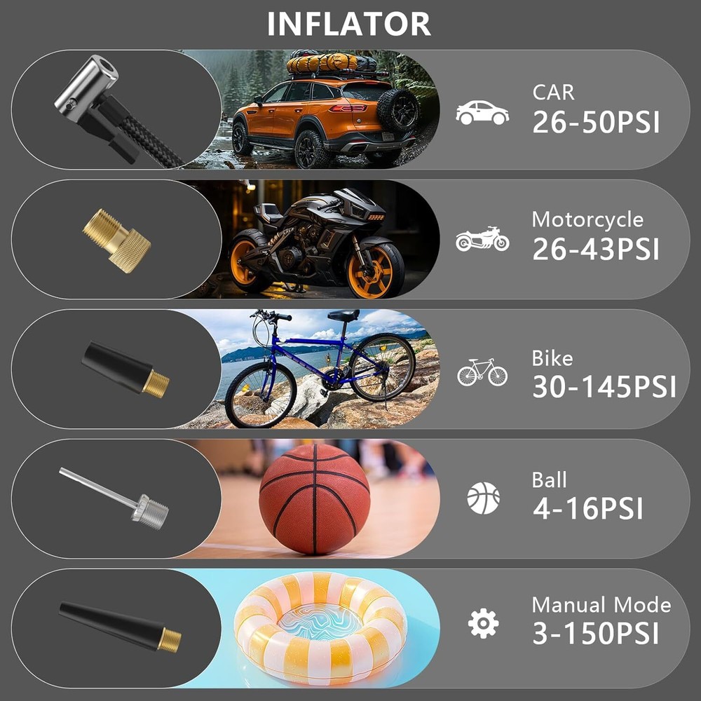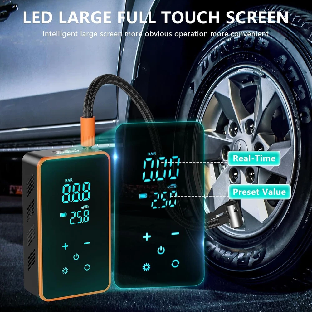 This portable air pump is a game-changer! Super fast inflation with its 150PSI power and massive 20,000mAh battery means no more waiting at gas stations. The touch screen is intuitive, and the four preset modes make it super easy to inflate car, bike, or motorcycle tires—even sports gear. Love that it's cordless and lasts 1-2 hours on a charge. Super compact yet powerful—total lifesaver for emergencies or quick top-ups!