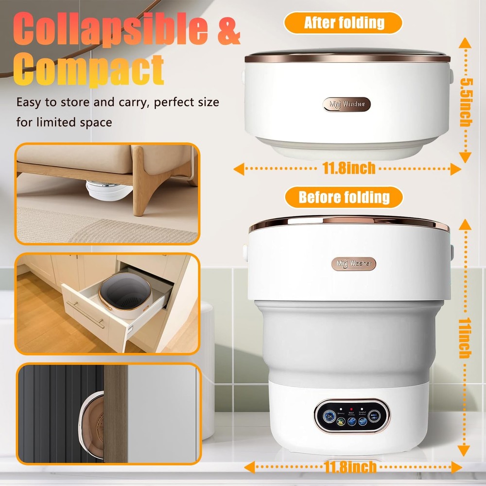 Specifications: Product Name: Portable mini washing machine Capacity: 15L Color: off-white Material: TPE and food-grade silicone Function: washing, drying Time Setting: 3 minutes, 5 minutes, 10 minutes Package: 1* Portable Folding Laundry Machine 1* Drain Basket 1* Power Adapter 15 L Compact Size: Designed for efficient small-volume laundry, 15L mini washing machine can wash multiple pieces of clothing at once, especially for delicate fabrics; the powerful motor produces strong vortexes to deep clean clothes and make them look brand new; can be connected to the kitchen faucet or sink for easy filling and draining Convenient and Foldable: Introducing the ultimate portable washing machine for small spaces and busy lifestyles! The lightweight body with folding structure adopts a stylish design, providing complete washing in a compact device, is very suitable for travel, camping, RV travel or small spaces such as apartments, dormitories, and hotels; the external handle is convenient for carrying, and it is easy to store after folding, which does not take up space Washer and Dryer 2 In 1: Foldable washing machine can not only wash clothes, but also the equipped drain basket can help remove most of the moisture from the clothes after washing and speed up the drying of clothes; after washing clothes, drain the water in the washing machine, install the drain basket on the buckle at the bottom of the washing machine, put the clothes in the basket, select the time mode, and it can be rotated to drain; do not use the drain basket when washing clothes Easy Operation: Mini washing machine is equipped with an intuitive one-touch control panel, which makes washing simple and convenient; equipped with 3-minute, 5-minute and 10-minute timer buttons, just press the button to start the washing program; whether you are a busy office worker, an elderly person not familiar with electronic products, or a first-time user, this portable washer can make washing easy and worry-free Durable Material: Made of excellent TPE and food-grade silicone materials, portable washer machine is durable and safe for daily use; designed for washing delicate clothes such as underwear, socks, and baby clothes, provides a gentle and efficient washing experience; blue light deep washing protection can improve cleanliness and promote healthy living Energy and Quiet: Collapsible washing machine significantly reduces water and electricity consumption, helping you save water and electricity bills while reducing green burden; equipped with a low-energy noise reduction motor to ensure smooth operation of the washing machine and reduce shaking during operation, allowing you to enjoy a quiet washing experience