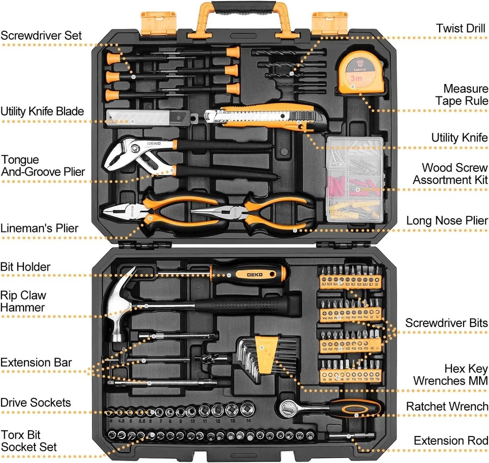Color: Black Batteries Included?: No Case Included: Yes Brand: Unbranded Type: Household Tool Set UPC: Does not apply Tools Included: Hammer, Rip Claw Hammer, Lineman's Plier, Long Nose Plier, Ratchet Wrench, Measure Tape Rule, Tongue and-Groove Plier, Drive Sockets, Screwdriver Bits, Universal Joint, Extension Bar, Utility Knife, Twist Drills, Wood Screws Assortment Kit, Hex Key Wrenches, Torx Socket Set Material: Stainless Steel Batteries Required?: No Finish: Chrome Package Dimensions: 15.59 X 11.18 X 3.27 Inches Case Type: Box System of Measurement: Both, Standard (SAE), Metric Number of Pieces: 196 Personalize: No gtin13: Does not apply Item Weight: 8.36 lb Size: 196pcs