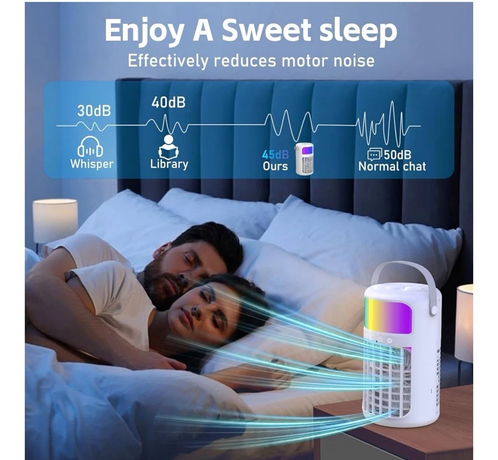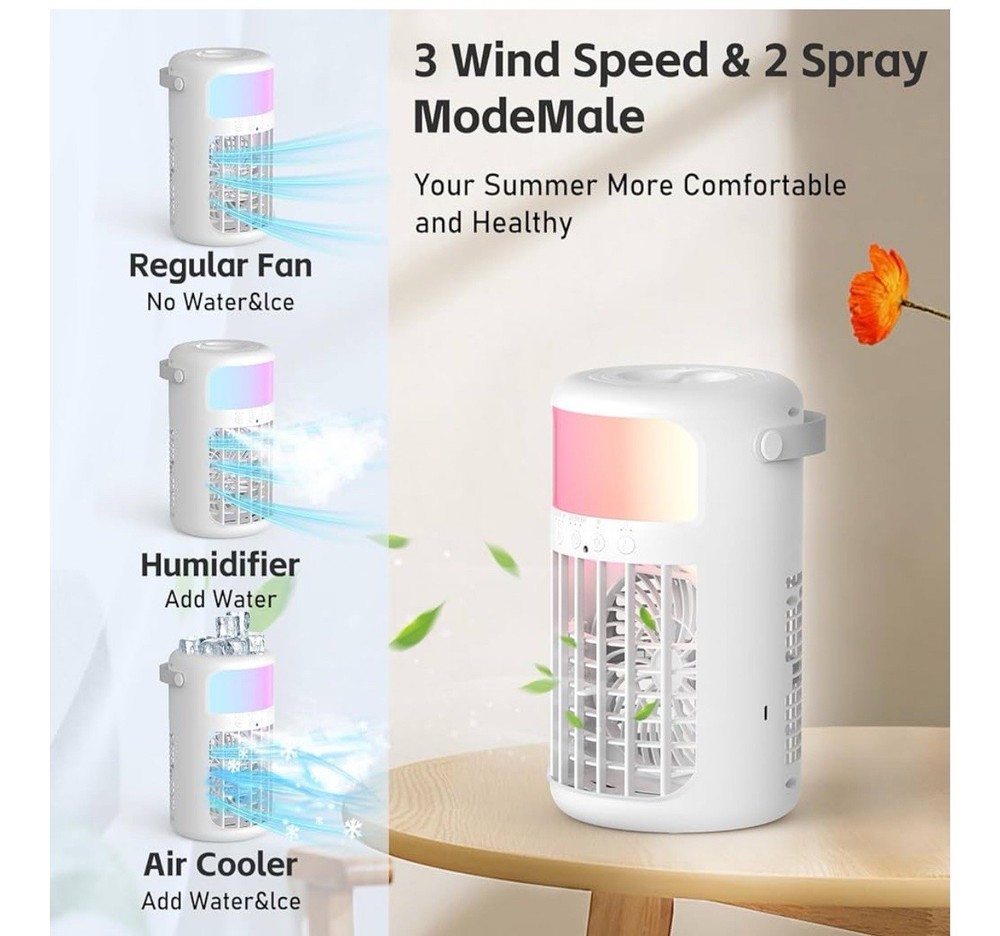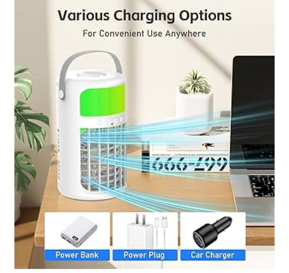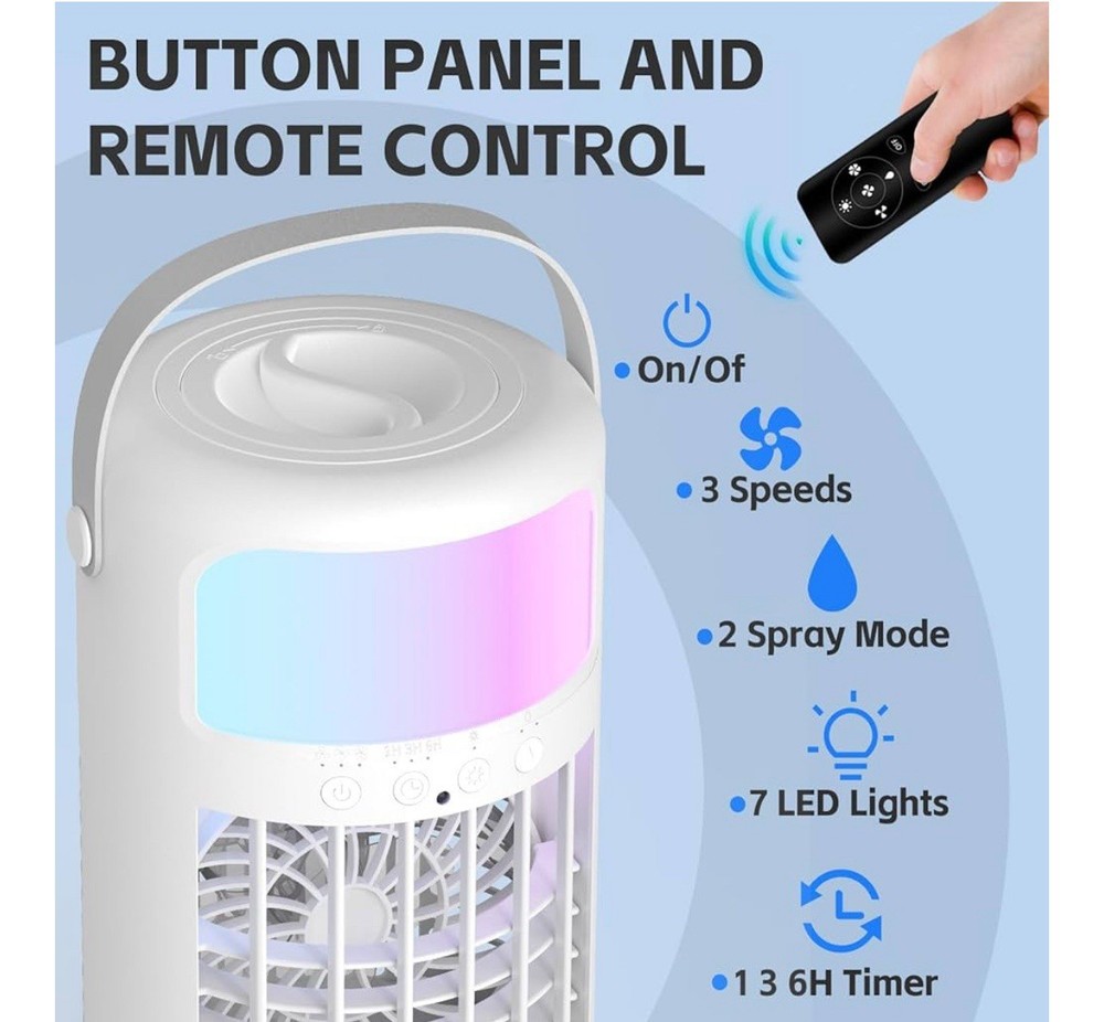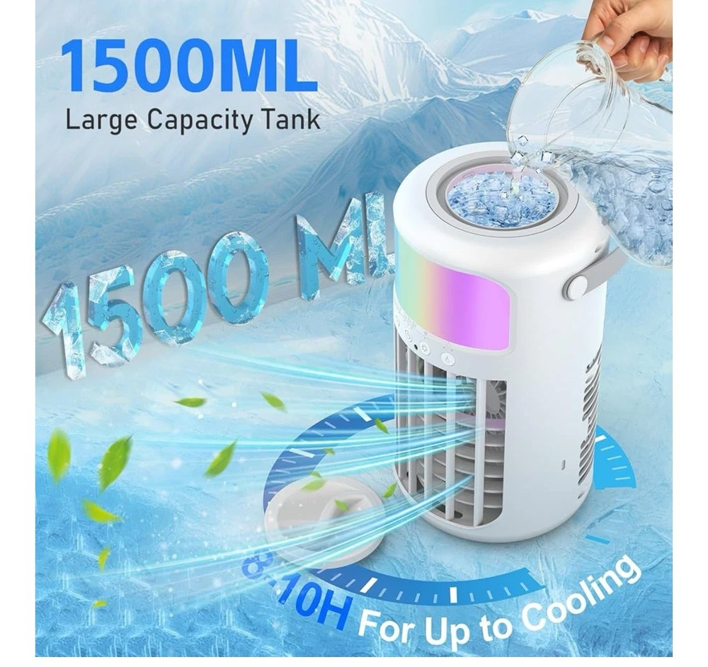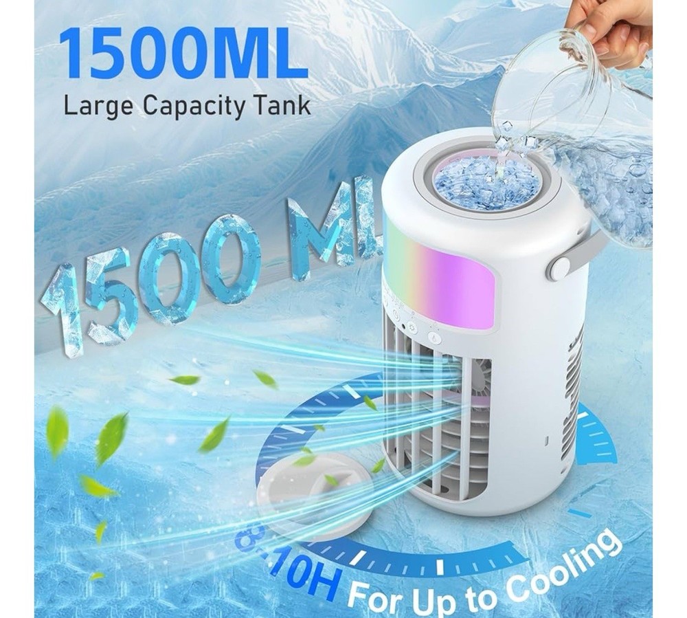 2025 Upgraded 4-in-1 Multifunctional Design portable air conditioner, humidifier, fan, and 7-color night light in one. 3 Fan Speeds & 2 Cool Mist Modes Customize your cooling experience with 3 adjustable wind speeds and 2 mist modes. The large 1500ml water tank offers up to 8 hours Ultra-Quiet Operation with Timer Function Featuring the latest 2025 upgraded evaporative cooling technology, this unit runs whisper-quiet—perfect for sleep or focused work. Built-in 1H/3H/6H timer allows automatic shut-off to save energy and give you peace of mind. Portable USB Powered