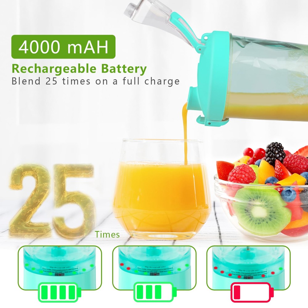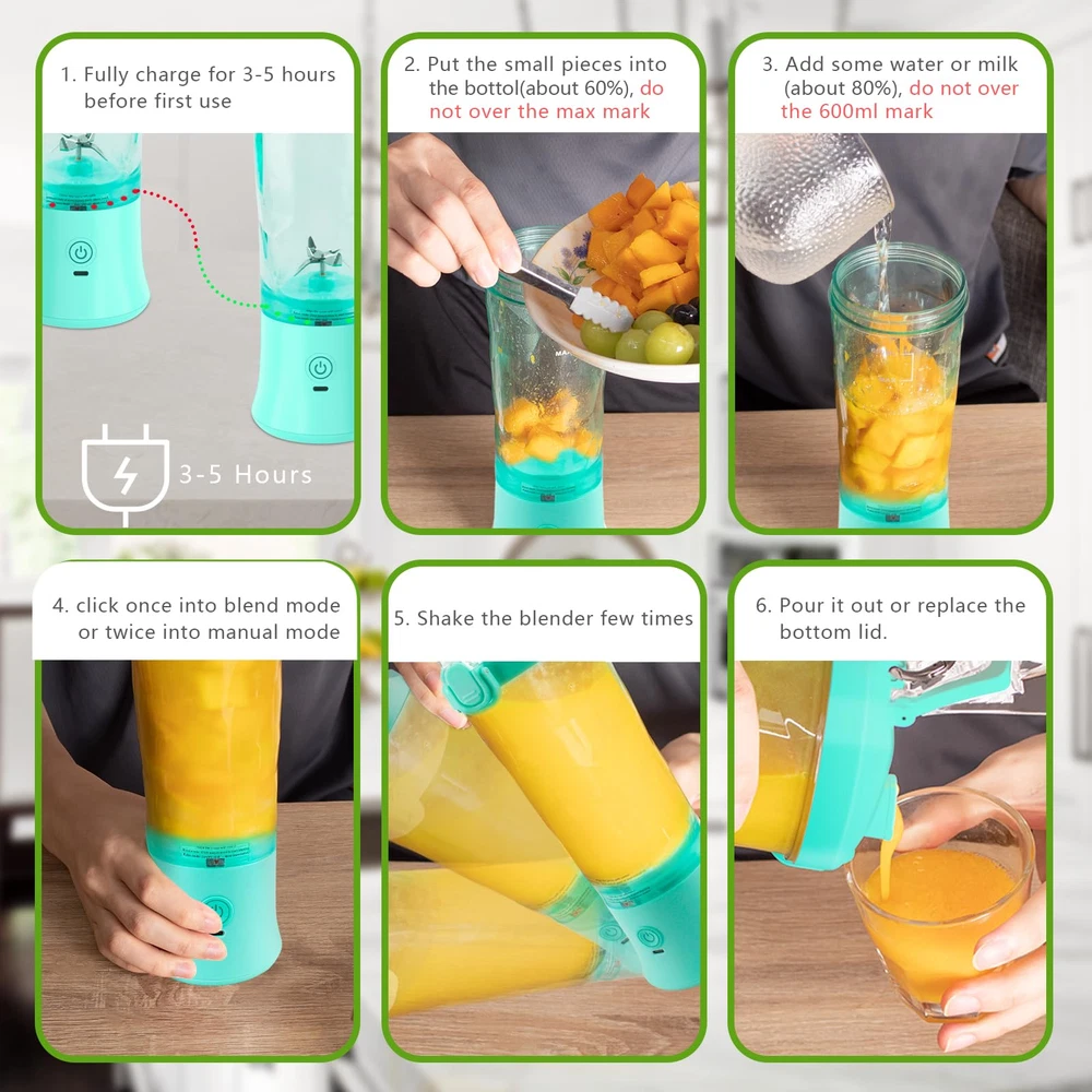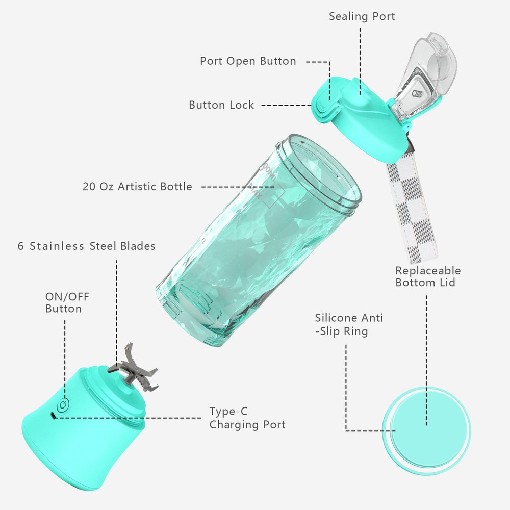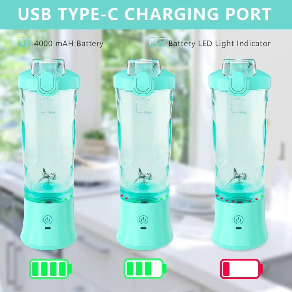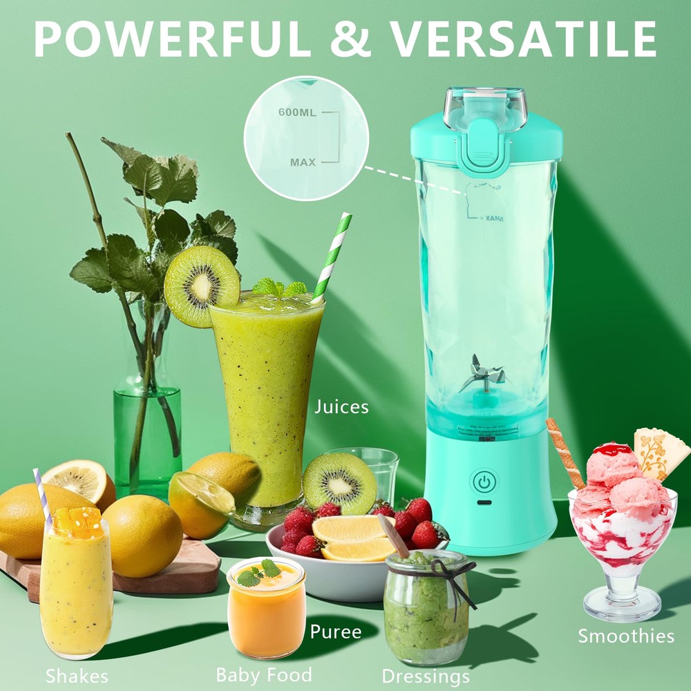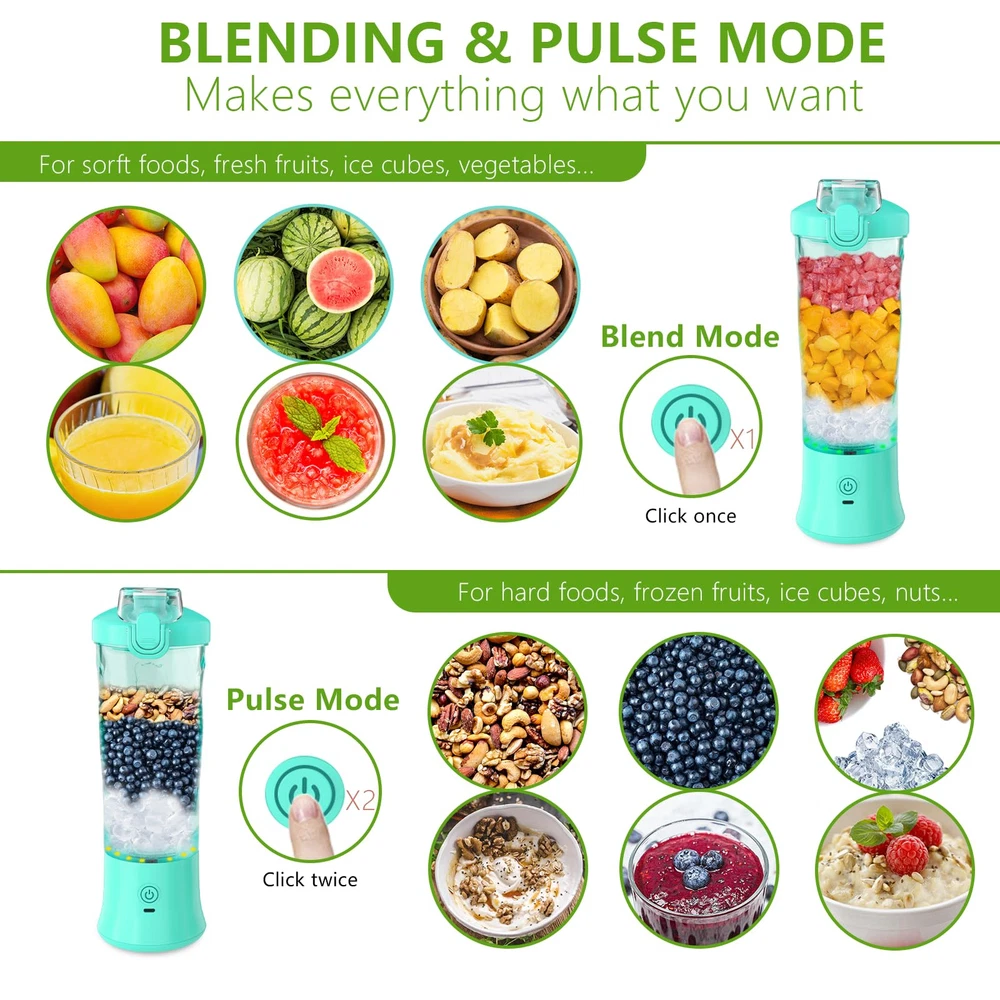 【Portable Smoothie Blender】Experience the ultimate convenience with our portable smoothie blender. Equipped with 6 razor-sharp stainless steel blades and a blistering speed of 18,000 RPM, our portable blender can effortlessly crush ice cubes, frozen fruits and vegetables. Create nutritious smoothies or milkshakes in just 30 seconds. Unleash the blend 【Innovative detachable Cup Jar】Our rechargeable blender for smoothies features a convenient detachable 21oz (600ml) BPA-free cup that transforms into a travel lid for use on the go. Cleaning is a breeze as it easily disassembles into three parts: lid, cup and blender base. We provide cleaning tools, including a straw brush and cup brush, for thorough and effortless cleaning 【Stylish Diamond Pattern & LED Lighting】Add elegance to your countertop with our stylish diamond pattern design. The twelve intelligent LED indicators allow you to effortlessly track the remaining power and switch between different blend modes. Our small blender for smoothies supports convenient USB-C charging, with green lights indicating a high battery level and red lights signalling a low battery level 【Blend & Pulse Mode】Our personal blender for shakes and smoothies has two modes to tackle all your blending needs. Use the Blend mode for smooth treats like strawberries, bananas and kiwis. It automatically shuts off after 30 seconds for the ideal consistency. For frozen fruits, jams, ice cubes or tough ingredients, double-click the switch to activate Pulse mode. The indicator light flashes yellow to indicate pulse mode 【What's Included】Our mini blender package includes 1* blender, 1* travel lid, 1* leather handle, 1* silicone straw, 1* cup brush and 1* USB-C charging cable. If you have any questions about the Smoothie Blender, please don't hesitate to contact us. We are committed to providing you with a satisfactory solution