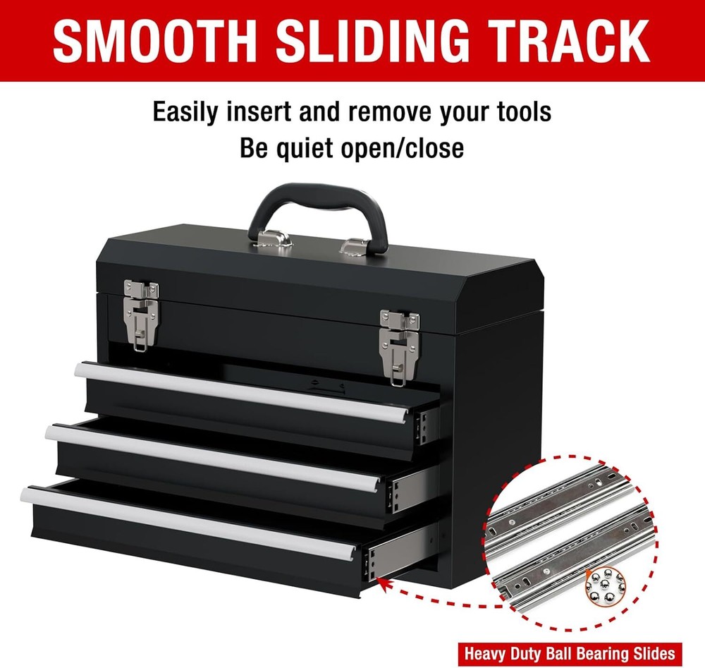 Product Description Portable Metal Tool Box, 3-Drawer Steel Organization Micro Tool Chest for Household, Warehouse, Repair Shop, Black 100% metal đ§°ăMore Relaxedă- Please attention that It's a small box, Our original intention of developing the toolbox is that you will feel more relaxed when you go to work with it. please check the size before you place an order. If you mind, please don't buy it. đ§°ăExtra storageă- The steel tool box consists of two ample drawers and a deep top storage compartment allow for maximum organization and flexibility, the full-extension steel drawer slides, allow access to the entire drawer and easy to open, you can get the tools you need more quickly. Hold up to 88LBS. đ§°ăEasy to Moveă- Portable tool box convenient design features a carrying handle and lightweight construction, comfortable handle allows you carry the box easily even when it's filled, the lock bar keep drawer tight, Automatic locking when the lid is closed, prevent the drawer from slipping out when toolbox carried. đ§°ăsecure Designă- The tool box has 2 steel lock latches, Prevent the top box from opening accidentally to cause the tool to fall. The middle of top with lock bar, when you open the lid to take out the tool, the lid will not suddenly close and crush your hand. About Us We are a reputable seller with many years of experience selling on eBay. Our goal is to provide high-quality products and excellent customer service. Shipping Items will be shipped within 1-3 business days when we received payment. (Orders are not processed on weekends & holidays) Tracking information will be sent once item is shipped. Delivery time depends on destination and other factors Item is shipped to ebay address. Leaving correct address can minimize delay. For international shipping and shipping to Guam, Hawaii and Alaska, Please contact us before placing the order. International buyers please note: Import duties, taxes and charges are not included in the item price or shipping charges. These charges are buyerâs responsibility. We will try our best to reduce the risk of the custom duties. Local pick-up is unavailable at the moment. Contact Us We reply any email messages within 1 business / working days(off-duty at weekend). If you do not get a response from us, then please check your junk or spam mailbox. Our Business hours: Mon-Fri 9:00-18:00, UTC/GMT +8 hours. Please contact us either by clicking "contact seller" in the "purchase history" section or simply click "ask a question" at the bottom of this page. If you are unsatisfied with our item or service, please contact us before leaving any feedback. We are committed to resolve all issues in a friendly and satisfactory manner.