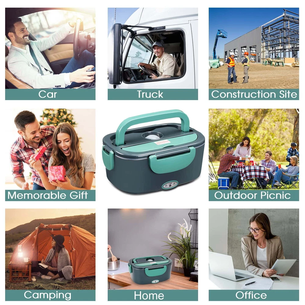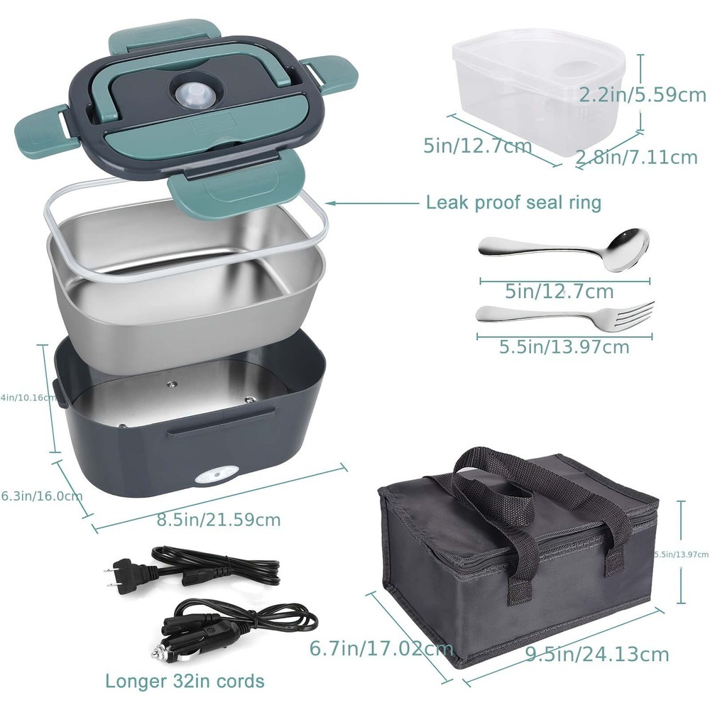 Copedvic Electric Lunch Box Food Heater Description: 【2 IN 1 ELECTRIC LUNCH BOX】No Need to looking for a microwave and wait in line for heating, now simply plug in and heat up your food with the electric heating lunch box at home/office or in car/truck using the 110/12V power cables. keep constant heating between 60°C and 70°C when plugging in, always serving you a hot meal. 【SAFTY & FAST PTC HEATING TECHNOLOGY】Using PTC original constant temperature heating, low-consumption heat cycle to keep food at a suitable temperature and keep the moisture of the food. It normally takes 30-50 minutes to warm the food, super efficient and energy-saving. (If the food was taken out of the fridge or where the ambient temperature is low, the heating time should be extended appropriately). 【PACKAGE LIST】Electric lunch box warmer includes: 1x electric lunch box ( 9.45*6.7*4.25Inch ), 1x insulated lunch carry bag, 1x plastic additional compartment,1x leak-proof seal ring, 1x stainless steel spoon & fork,1x 304 stainless steel inner box, 1x 12V power cord for cars/trucks, 1x 110V for home/office use. Capacity 1.5L. 【LEAK PROOFING】Improved cover design, the cover will not move during use, more tightly covered. Because leak-proof seal ring design is added, it improves the defect of food leakage. Prevent fluid leakage in sloshing car environments. 【MATERIAL & HEATING NOTES】The electric lunch box is made of food grade PP plastic and stainless steel, which is high-temperature resistant, non-toxic, durable, eco-friendly and safe to use. Warm Tips: Please do not clean the heating base with water, and do not add water to the heating base. 【2 IN 1 Car & Home Cable Guide】Electric heating lunch box contains two different plugs: one for Home/Office(110V), one for Car/Truck(12V/24V). Please check our photo guide before use. The Car cable is used on the Right port. The home cable is used on LEFT port. Dont Mix them. Convenient Heating: This electric lunch box can heat up your food quickly and easily, making it perfect for busy days at work or on the go. Versatile Use: Use it in your car or at home, this lunch box is perfect for anyone who needs a hot meal while on the move. Durable Material: Made of high-quality stainless steel, this lunch box is built to last and withstand daily use. Complete Set: Comes with a fork and spoon, as well as a portable bag for easy carrying and storage. Perfect for Travel: Whether you're on a road trip, camping, or fishing, this lunch box is an essential item to bring along.