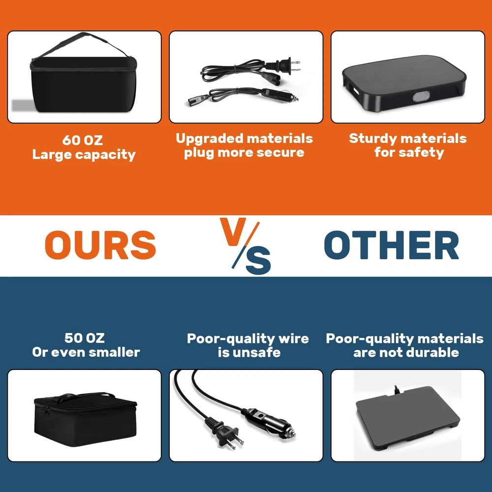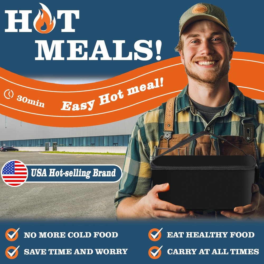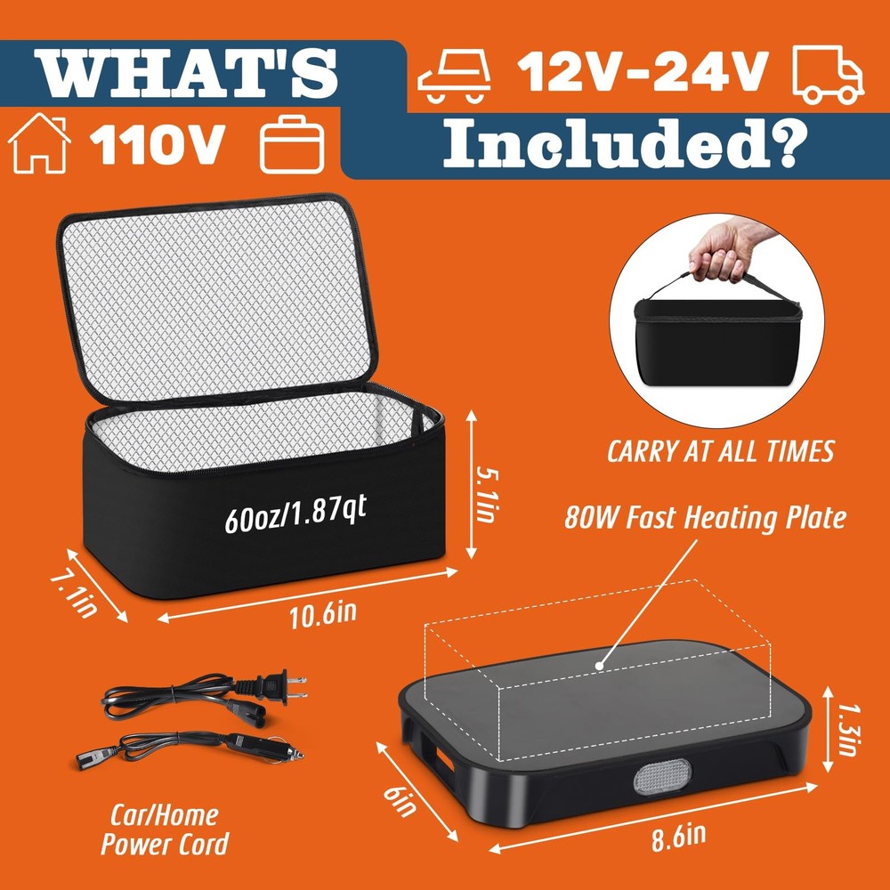 portable oven lunch box electric lunch box for adults , 12V, 24V, 110V food warmer, portable mini personal microwave heated lunch box warmer for cooking and reheating food in car, truck, travel, camping, work, home [3-In-1 Portable Microwave Oven] --- Wherever you are - at the office, in your car/truck, or on the move - enjoy piping-hot nutritious meals anytime. This compact microwave redefines mealtime convenience with its portable design, delivering home-style comfort wherever you dine. [Smart Heating Technology] --- Equipped with intelligent thermostatic heat transfer system, simply plug into 12V/24V/110V sockets for instant meal revival. Maintains freshly-cooked temperature and texture, ideal for office workers, long-haul drivers, construction crews and mobile professionals. [Lightweight & Hassle-Free Maintenance] --- Engineered for portability with a premium insulated carry case. Features odorless heating process and detachable components. After use, simply wipe clean with damp cloth - no complex cleaning routines required. [Multi-Container Compatibility] --- Supports heat-safe materials including glass, ceramic, stainless steel, aluminum foil trays, and rigid cardboard. Accommodates containers up to 9.84"L x 7.08"W x 4.13"H (1.8 quarts), ideal for family-sized meals. [Satisfactory After-Sales Service] --- The package includes one insulated bag, one heating plate,one instruction manual, two power cords. Due to the uncertainty of the transportation process, if you arrive with no heating or other problems, please contact us in time [HEARTWARMING GIFT IDEA] --- The ultimate lunchtime companion for working loved ones. This personal food warmer makes an exceptionally practical yet thoughtful gift for spouses, parents, or anyone who values warm homemade meals on busy days.