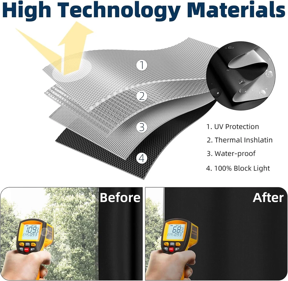 100%BLACKOUT 100% blackout curtains, lightweight fabric for easy portability, blocks sunlight in summer and reduces heat loss in winter, Perfectly blackout shading to create a comfortable dark sleeping environment UPGRADED HOOK AND LOOP TAPE- Self adhesive hook and loop tape strips,strong grip and back very sticky can help to keep your portable blackout blinds on a variety of surface types, such as plastic, wood, and glass other flat.No marks or residues after removing and can be attached without drilling DIY SHAPE- 101×145cm(40”×57”)Black out curtains can be cut to any shape or size you need, perfectly suited for RV, doors, sunroofs, rectangular, round and polygonal window MATERIAL SAFETY- Our blackout curtains are non-toxic and Formaldehyde-free, environmental protection, easy installation, suitable for baby rooms or night shift workers, etc. To create a blackout-shaded environment for the interior and improve sleep quality EXCELLENT QUALITY ASSURANCE- To ensure the quality, each of our blackout curtains undergoes strict quality control before leaving the factory. If you have any questions about our portable blackout curtains, feel free to contact us, we will reply you within 24 hours and give you a satisfactory solution
