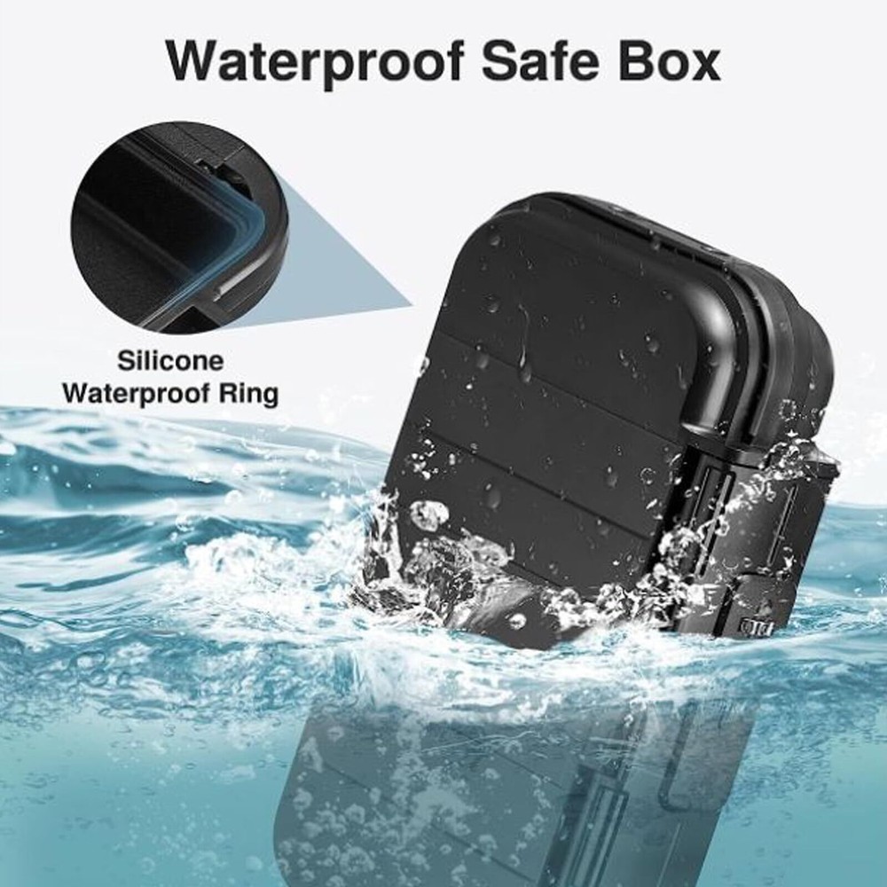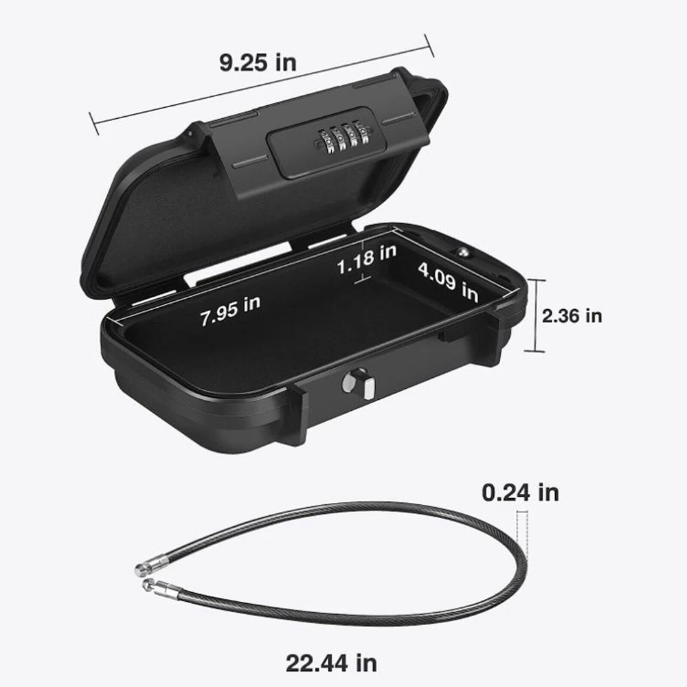 Specification Color: Blue/ Black/ Grey Material: ABS Size: 200x102x30mm/ 7. 8x4. 2x1. 1" Package Including lock box* 1 【Sturdy and Durable】: This traval safe lock box is made with high-strength ABS plastic and shock-absorbing foam, this portable safe box is waterproof, shockproof, and fully sealed to protect your valuables from damage 【Portable Safe Lock Box】: With an inside size of7.8x4.2x1.1, this lock box provides ample space for cell phones, USB cables, power banks, passports, cash, credit cards, watches, jewelry, and more 【Safe and Secure】: 4-digit password combination with up to 10,000 possible combinations for added security. The cable made of special steel can be locked to any surrounding fixed object to ensure the security of your items 【Easy to Carry】: Our safe box is equipped with a detachable electric cord with a lenght of 22.44in, it can hang on railings, pools, beaches, Ideal for use in the car, at the beach, or while traveling, this portable safe box is a must-have for anyone who wants to keep their valuables safe and secure 【Easy to Open the Safe Box】: After entering the correct password, knock the shell to break the vacuum. Open with a little more force. Enjoy the convenience and security of this safe box