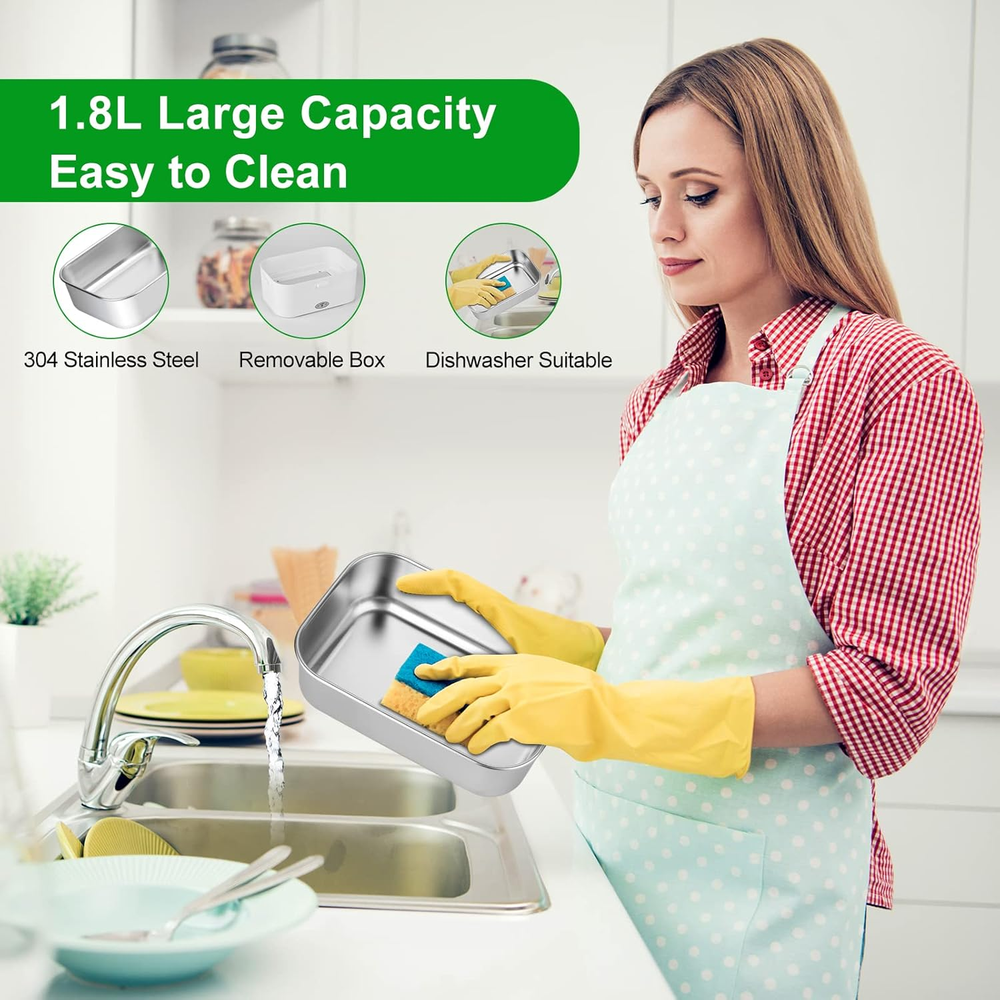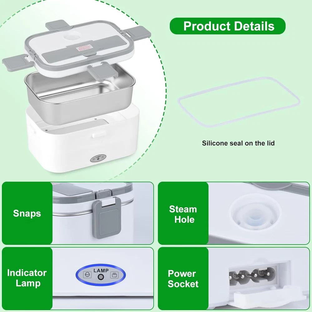 【3-in-1 Electric lunch box】Are you often busy and have to eat cold food? From now on, with our electric lunch box, you can enjoy hot meals anytime, anywhere! This electric heated lunch box supports 110V home/office + 12V car and 24V truck use. You will love this heated lunch box. 【80W Fast heating】Our electric heating lunch box uses an upgraded 80W power supply for heating, once plugged in, the heating lunch box will heat up in 20-30 min. This food heating lunch box is designed with circulating heat to keep your food nutritious and fresh. It not only heats your meals quickly, but is also easy to clean and dishwasher safe.This item is not suitable for children 12 years and under. 【1.8L Super large capacity】1.8L large capacity stainless steel container, you do not need to be hungry.Our food heater lunch box are perfect suited for you! What's more, we provide a 0.45L plastic compartment so you can place different kinds of food separately. There is a and fork on the lid, you can also use it as a cell phone stand to watch movies while eating. 【Leak proof design for you】In order to make the food warmer lunch box better sealed, we designed four sides snaps, plus the built-in rubber seal, you no longer have to worry about leakage of soup.Perfect for students, company office employees, construction workers, trucks and others who want to carry lunch by themselves. 【Warm & Healthy meals】Pls do not wash the electric lunch box as a whole into the water. The portable heated lunch box comes with a insulation bag, don't have to worry about heavy rain and dust, you can carry the lunchbox easily. If the food was taken out of the fridge,the heating time should be extended appropriately. If you have any questions about our electric lunch box, please contact us as soon as possible! Product Description UPGRADE LARGE CAPACITY PORTABLE ELECTRIC LUNCH BOX Say goodbye to greasy fast food, and enjoy fresh, heart-warming, and healthy food anytime, anywhere! The lunch box design can be separated independently, and various foods can be matched at will to achieve balanced nutrition! Enjoy fresh, heart-warming, and healthy food anytime, anywhere! -PRODUCTION SPECIFICATION- DC Power: 12V-60W 24V-80W ; AC Power: 60W/80W ; Voltage: 12-24V ; 110V 60Hz ; 220V 50Hz ; 110V 60Hz/12-24V ; 220V 50Hz/12-24V ; Material: 304 Stainless Steel, PP Material, Rubber ; Capacity: 1.8L for Lunch Box, 0.5L for Fruit Container ; Warm Tips: We recommend adding some stock or water to food before heating, making the food more evenly heated. Don't put lunch boxes in the refrigerator or microwave. Don't immerse the lunch box body in water. Don't add water to the lunch box heated base. Make sure to open the steam port before heating. Remember to unplug the power cord before eating. Any problems while using the lunch box,Please cont~act us. We will provide you the best solution. Please do not repair it by yourself. Home/Car Plugs There are 2 plugs on the portable food warmer, one is a 12/24V car adapter plug, and the other is a 110V/220V home adapter plug. Available anytime, anywhere! 304 Stainless Steel Container Made of food-grade stainless steel, you can use it with confidence. At the same time, it is very easy to clean, it can be rinsed directly in the faucet or put in the dishwasher! Portable Insulated Lunch Bag This lunch bag is lightweight and foldable, Sturdy and durable, easy to carry. Insulated aluminum foil makes the food fresh for hours, it's non-toxic and safe for your food, perfect to pack your foods and lunch containers.