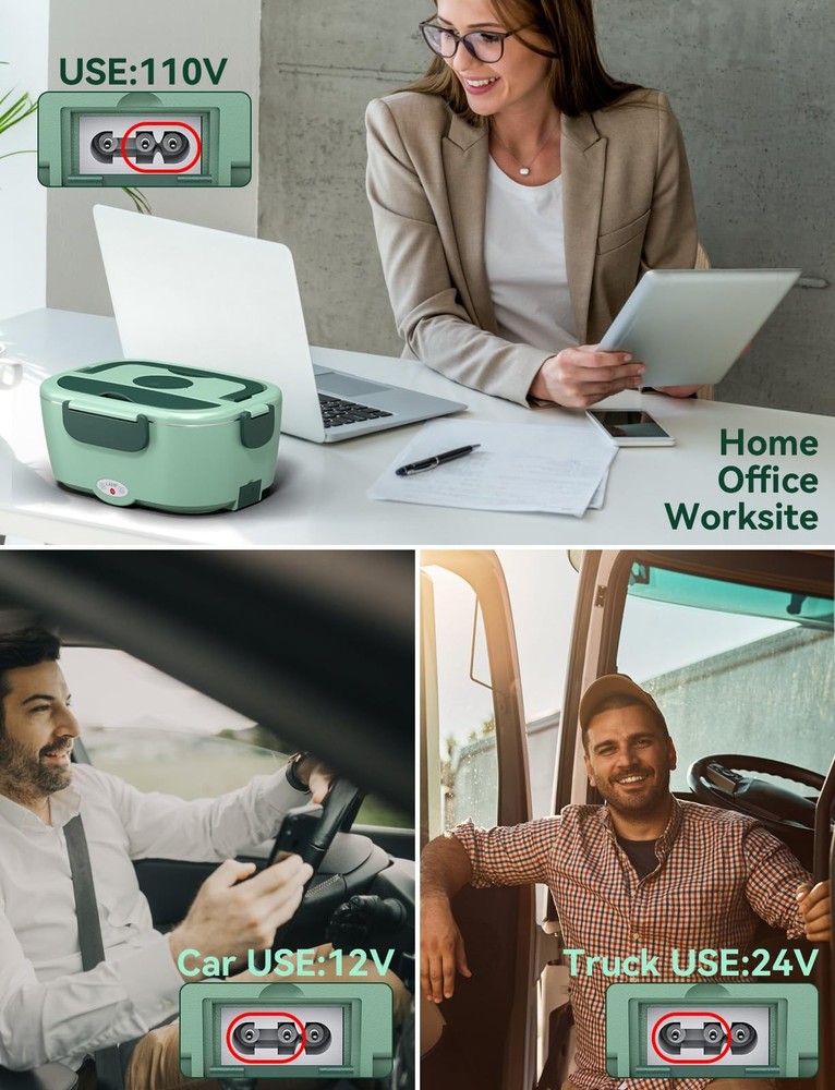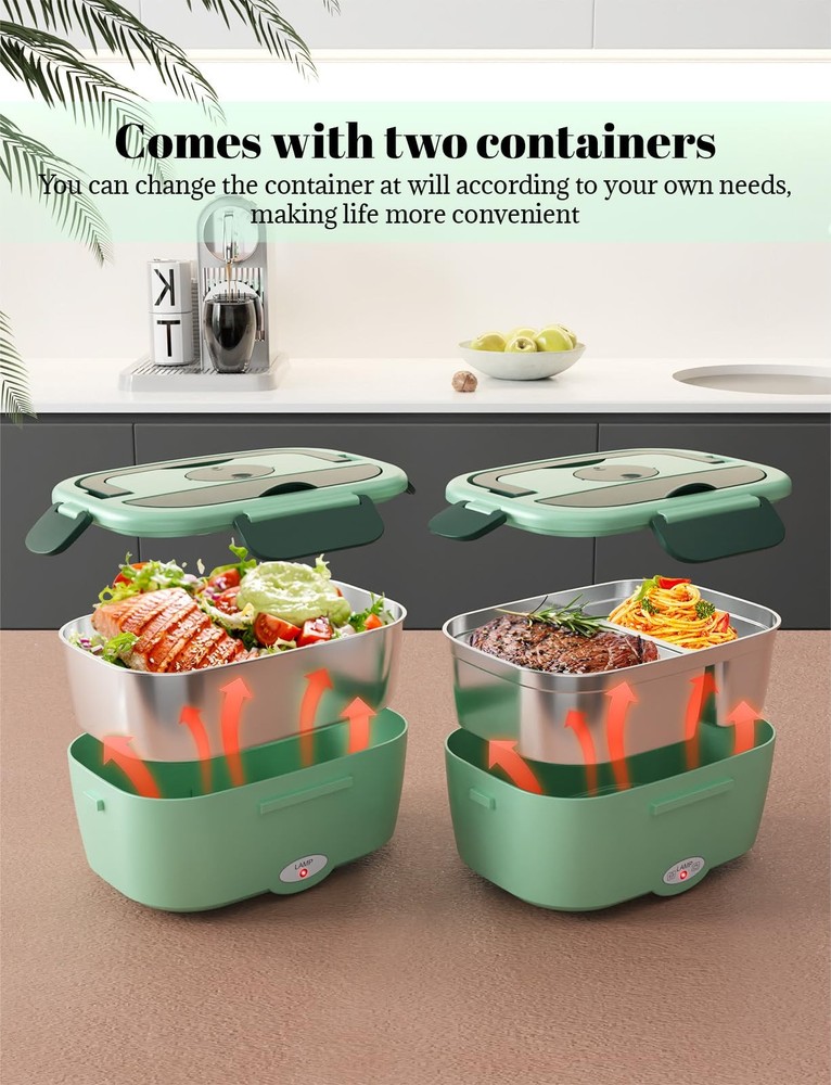 Are you still worried about going out for a cold meal? Are you still waiting in line for the microwave to heat up your meal? With this electric lunch box, you don't have to eat cold meals anymore, and you don't have to wait in long lines for those poor microwave ovens. You don’t have to worry about having no place to heat up meals outdoors far away from home, you can solve this problem in the car. This electric lunch box has a capacity of 1.5L, which can meet the appetite of an adult. At the same time, the package contains two stainless steel containers, which can be heated alternately, suitable for couples who are traveling or working outdoors. The power of 65W is enough for you to heat up the food in about 25-40 minutes. At different temperatures, the heating time is different, please pay attention. 3 IN 1 FOOD HEATER: Do you always have cold meals at work, in the car, or on the go? If so, then our portable heated lunch box is tailor-made for you. The electric lunch box can be heated in cars,trucks,work office and so on 80 W FAST HEATING: Our heated lunch box heats up fast and evenly, with a heating time of 20-40 minutes. It contains Two of 1.5 Liters removable 304 stainless steel containers, which can be used interchangeably. Good sealing, no leakage during driving FOOD GRADE MATERIAL: The food warmer is made of food-grade PP plastic and stainless steel. Do not use steel brushes to clean, it is recommended to use our foam brush. The containers can be washed in the dishwasher, But the heating base can't HEATING QUIET AND ODORLESS: There is no sound when The electric lunch box is heating, no water vapor is released, and there are no peculiar smells. It can be heated half an hour in advance before leaving work without affecting others PACKAGE INCLUDES: One heating base, two stainless steel containers, one insulation bag, one car power cord, one office power cord, one stainless steel spoon, one stainless steel fork, two foam brushes, one packing box, one instruction manual