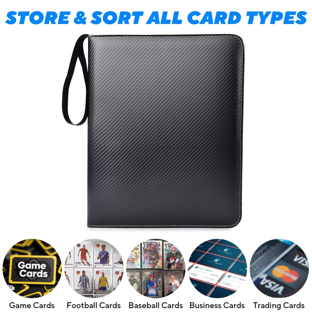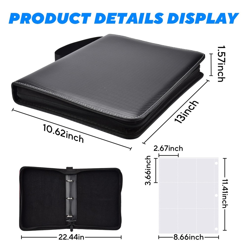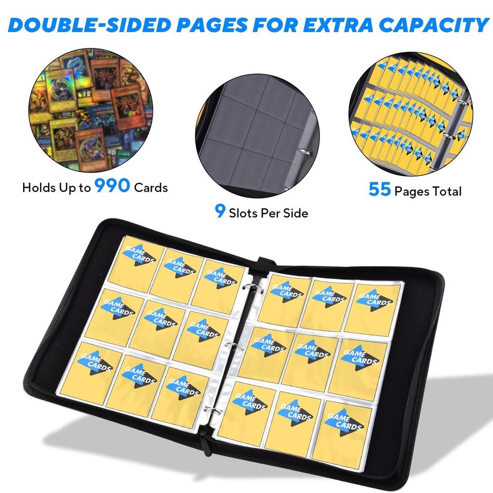 Keep your trading cards organized and protected with this premium card binder. Featuring 55 double-sided 9-pocket pages, it holds up to 990 standard-size cards. The 3-ring design allows you to add or remove pages as needed. Made with durable PU leather, it offers a sleek look and excellent protection from dust and spills. A secure zipper closure and built-in handle make it easy to store and carry. Perfect for kids and collectors alike. sports gamers baseball trading card binder album storage organizer collectible card holder collection 3-ring binder for cards gifts for kids Toys top loader binder toploader binder Holds Up to 990 Cards: The Card Binder includes 55 double-sided pages with 9 pockets per side, allowing storage for up to 990 standard-size trading cards, game cards, baseball card, sports card. Great Gift for Kids & Collectors: A great card binder perfect for organizing game cards or trading cards—an ideal gift for young collectors or hobbyists. Removable 3-Ring Design Card Binder: Flexible 3-ring binder lets you easily add or remove pages to customize your card collection as it grows. Durable PU Leather Cover: Sleek, water-resistant exterior protects your cards from dust, scratches, and spills for long-lasting use. Zipper Closure & Carry Handle: Smooth zip-around closure keeps cards secure, while the built-in handle makes it easy to carry anywhere.