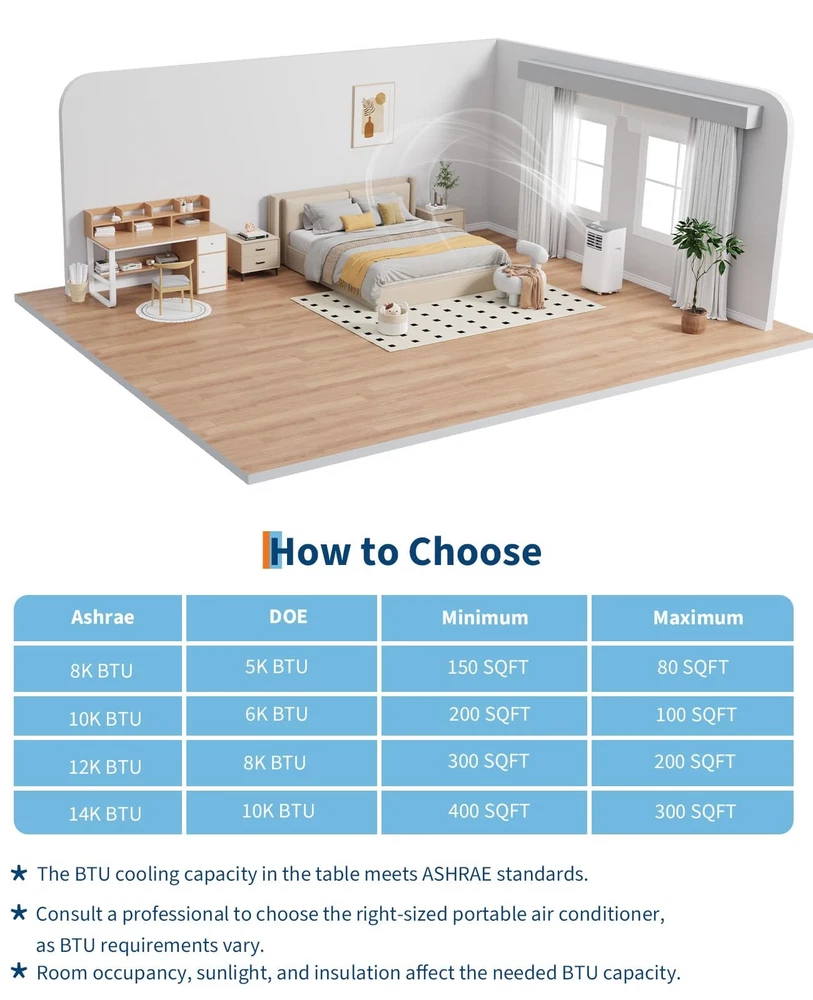 3 in-1 Mode with Fan and Dehumidifier: This portable ac unit offers cooling mode with effective temperature control, dehumidification mode, and a fan mode with two speed settings to meet your cooling and ventilation needs Fast Cooling: This compact air conditioner has a cooling capacity of 8,000 BTUs, capable of cooling areas up to 350 square feet with stable, fast, and efficient performance. It's perfect for bedrooms, garages, and offices, keeping you cool and comfortable Convenient Design: This portable ac is easy to use, equipped with a 24-hour timer and an adjustable thermostat (61°F to 88°F), which can be easily controlled via an LED panel and a handy remote. The caster wheels at the bottom and the side handles at the back allow you to effortlessly move it to your desired cooling area Simple and Quick Installation: This portable ac units for rooms is easy to install, portable, and space-saving. With the included exhaust hose and window kit, it requires no additional installation tools, making it compatible with double-hung or sliding windows Complete Portable AC Kit: Our air conditioner kit includes essential accessories: 1 portable air conditioning unit, 1 remote control, 1 exhaust hose, and 1 window ventilation installation kit. We provide long-term technical support, so please feel free to contact us at any time