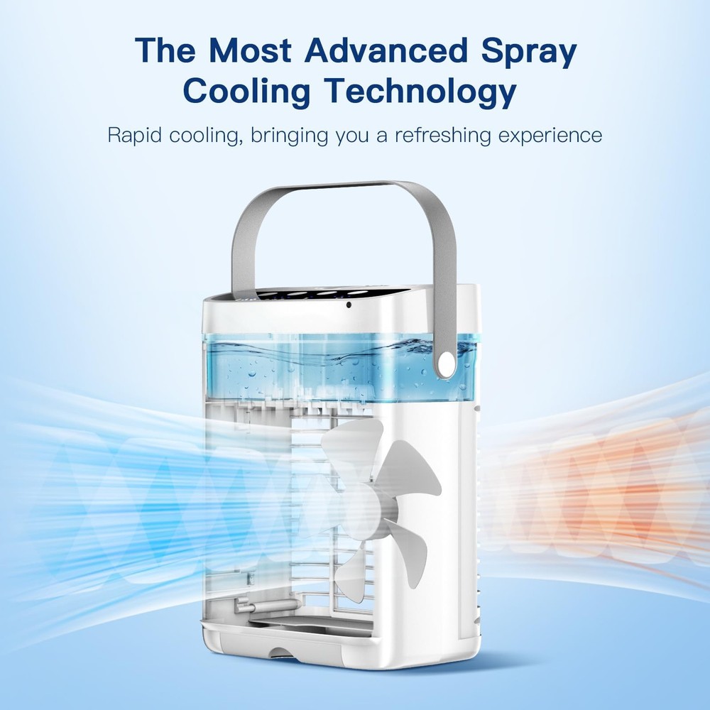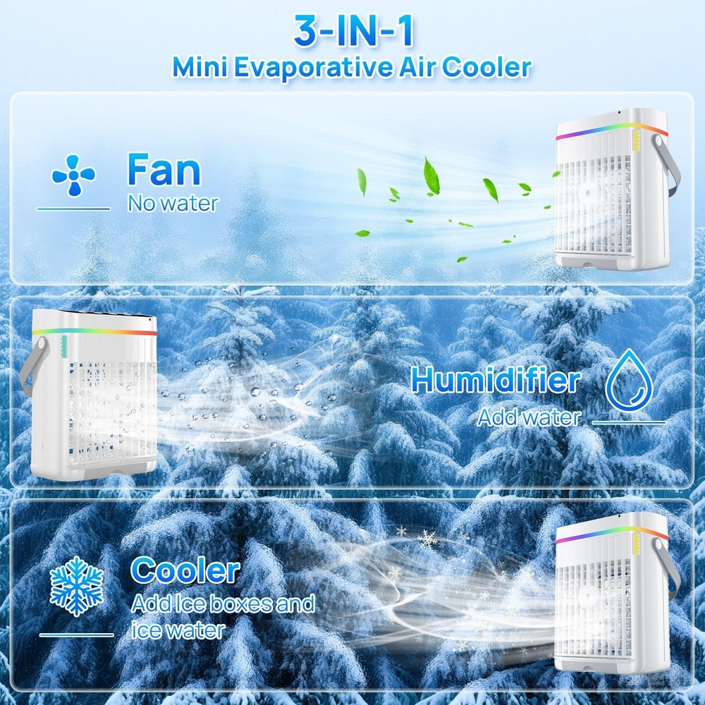 Portable air conditioner has air cooler, desk fan, humidifier and LED night light, timer function. Equipped with USB charging port, it can be powered by mobile power, laptop, adapter, car charger. Room air conditioners is suitable for bedroom, living room, kitchen, office, outdoor picnic, fishing, camping in the hot summer. Evaporative air cooler with a misting humidification holes that adding water will create a cool airflow. This cooling fan is not only have three levels of humidification adjustment, but also 3 wind speeds (Low/Mid/High) that keeping cool and comfortable during hot weather in summer. This Portable air cooler equipped with 1250ml water tank that can can work for up to 8-9 hours. The water level window design allows you to adjust water levels as needed, ensuring keep cool in summer. Also a water outlet plate at bottom is to prevent water leakage. Additional, the 60-degree adjustable air outlet allows you can choose the ideal air direction. Personal air conditioner is built-in 7 soft colors night light, you can choose your favorite color. It can as a bedside lamp creating a tranquil ambiance for restful sleep or as a decoration to add atmosphere at the party creating a good mood. Multi-functional Cooling Fan: Portable air conditioner has air cooler, desk fan, humidifier and LED night light, timer function. Equipped with USB charging port, it can be powered by mobile power, laptop, adapter, car charger. Room air conditioners is suitable for bedroom, living room, kitchen, office, outdoor picnic, fishing, camping in the hot summer. 3 Cooling Wind Speed: Evaporative air cooler with a misting humidification holes that adding water will create a cool airflow. This cooling fan is not only have three levels of humidification adjustment, but also 3 wind speeds (Low/Mid/High) that keeping cool and comfortable during hot weather in summer. Large Water Tank: This Portable air cooler equipped with 1250ml water tank that can can work for up to 8-9 hours. The water level window design allows you to adjust water levels as needed, ensuring keep cool in summer. Also a water outlet plate at bottom is to prevent water leakage. Additional, the 60-degree adjustable air outlet allows you can choose the ideal air direction. 7 Color Night Lights: Personal air conditioner is built-in 7 soft colors night light, you can choose your favorite color. It can as a bedside lamp creating a tranquil ambiance for restful sleep or as a decoration to add atmosphere at the party creating a good mood. Great Summer Gift: It is effective cool in hot weather and can keep you cool and comfortable. Cooler gift for your family, friends. Turning on the portable air conditioner to bring you a cooling summer.