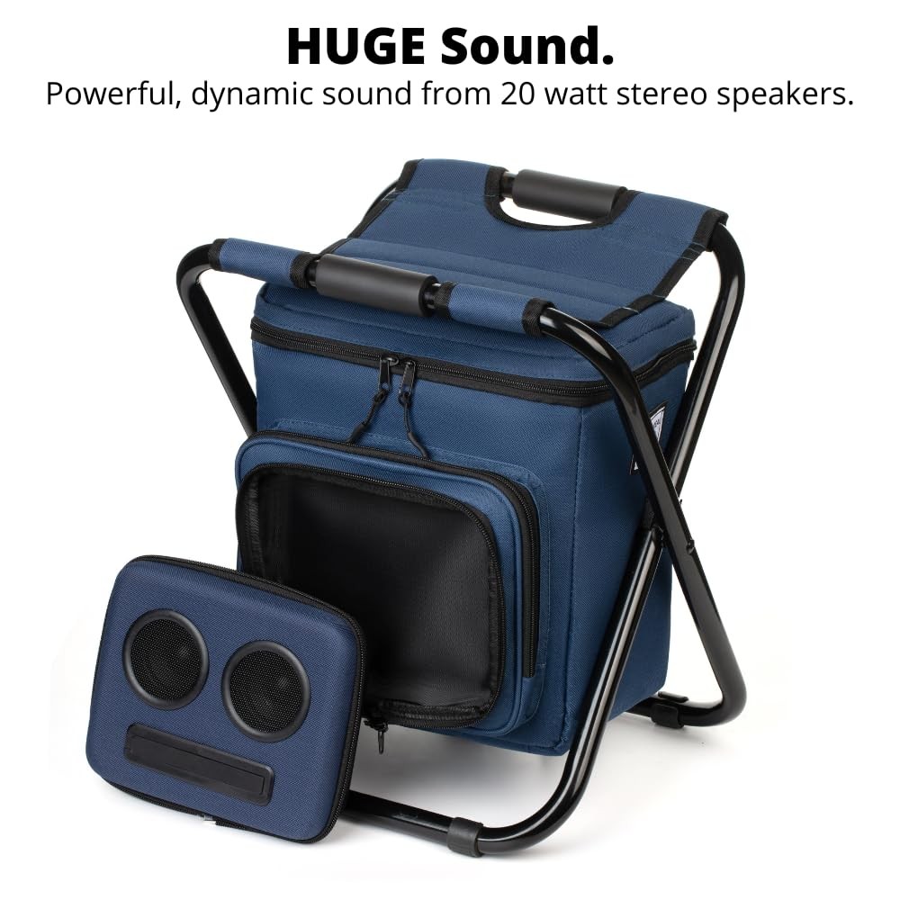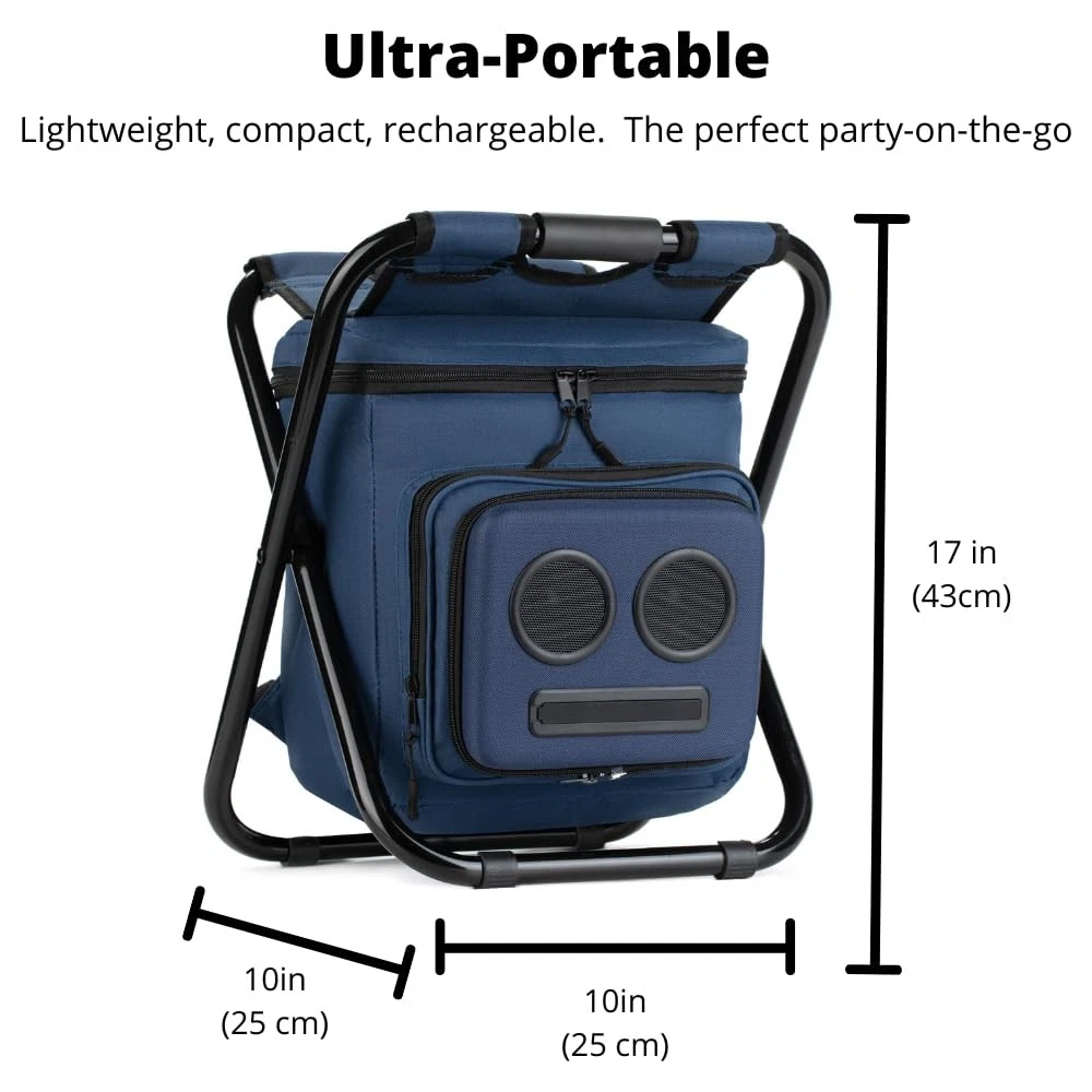 The Backpack Cooler Chair with Speakers. The Speaker Backpack Loved by All. This Backpack Cooler Chair has a removable stereo speaker built into it, for high quality sound. It has two full range 20 watt bluetooth speakers. Not all backpacks with speakers work on all devices, but this one does! - iPhones, Androids, iPads & Tablets and connects via bluetooth (includes an optional 3.5MM jack). The rechargeable backpack speaker battery lasts for 8+ hours. It’s ready to go – with shock-resistant compartments that allow for high-impact use. Perfect for parties / festivals / bachelor party gifts & bachelorette party gifts. With easily removable stereo speakers, this backpack with speakers is loud and fun! Buy it now! Lightweight, Water-Resistant Removable Speakers: Weighs less than 5 lbs and has a removable 20-watt speaker with compelling design in a water-resistant cooler. The Backpack Cooler Chair + 20-watt speakers combine to deliver powerful, full-bodied sound that lasts for 8+ hours. Works with iPhone and Android devices seamlessly, and charges them while you're on the go. Bring It Everywhere: Good for the beach, boats, picnics, camping, parties, raves and festivals. What You Get: Bluetooth speaker cooler w/ 20-watt speakers, micro USB cable, welcome guide, super friendly customer service. Click "Add to Cart" now!