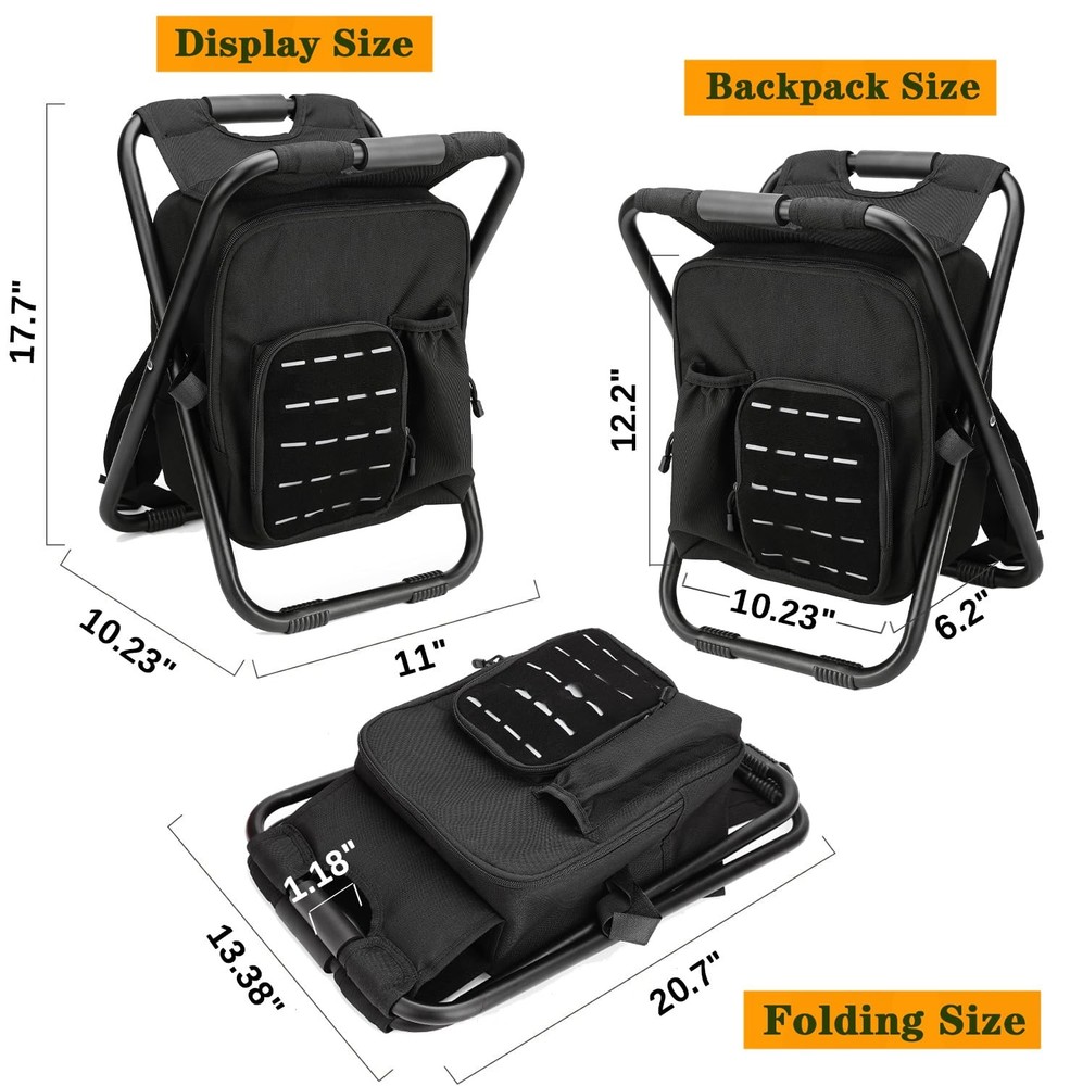 VERSATILE OUTDOORS CONVERTIBLE BACKPACK/STOOL Backpack Chair Material: The durable lightweight nylon is water-resistant and breathable, reinforced with a steel tube bracket securely fixed by rivets. Advantages: Lightweight、comfortable and easy to carry. Paired with a versatile molle pocket and well-insulated cooler bag. Backpack Cooler Chair Size: Chair Size: 18 inch x 11 inch x 10 inch. Folding Size: 21 inch x 13 inch. Insulated Cooler Bag Size: 12 inch x 10 inch x 6 inch. Front Molle Pocket Size: 8inch x 7 inch. Weight capacity: 400LBS. Applications: Outdoor recreational activities (fishing, hunting, hiking), watching sports events and performances (baseball games, Renaissance ceremonies), outdoor workers. MULTI-PURPOSE 3 IN 1 - Backpack, insulated cooler bag, and chair, perfect for camping, hunting, fishing, hiking, picnics, and more outdoor activities/watching sports events. The durable lightweight nylon is water-resistant and breathable, reinforced with a steel tube bracket securely fixed by rivets, can support up to 400 lbs and comfortable for sitting. LERK-PROOF COOLER BAG DESIGN - Our insulated bag has an aluminum foil insulation layer inside, and an upgraded reflective coating on the inner layer that can keep food and drinks warm for longer periods of time and effectively prevent leakage. American Flag Patch with Hook & Loop Backing, Attach to Military Tactical Gear, Jackets, Jeans, Vests, and More. LIGHTWEIGHT FOLDING CHAIR BACKPACK - Backpack stool folds up nicely to travel, pack, and store in the trunk of your car to take with you everywhere you need it. The two outer pockets are suitable for storing tea cups, water bottles, mobile phones, keys, and other items. We have designed a reflective bottom layer for the front molle position, making it convenient for you to use when walking at night. BACKPACK CHAIR SIZE - Chair Size: 18 inch x 11 inch x 10 inch. Folding Size: 21 inch x 13 inch. The backpack cooler chair has lightweight seat, breathable straps with wide shoulders for greater comfort. Ergonomic design also provides extra stability comfortable. IDEAL OUTDOOR GIFTS FOR MEN - If he is a outdoor enthusiasts who likes fishing, hunting, camping, hiking, this folding stool backpack will be perfect as a gift for him on Valentine's Day, birthday, anniversary, Father's Day or any other important holidays.