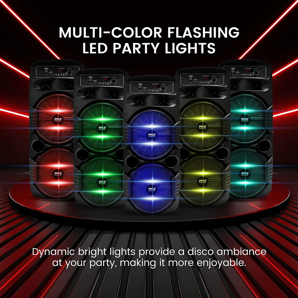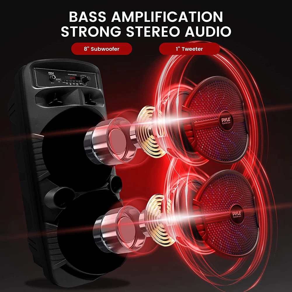 600 WATT POWER: This high powered wireless karaoke PA portable bluetooth speaker is equipped with dual 8" subwoofer and 1" tweeter with 600 watt peak power / 300W RMS at 2.6 ohm for full range stereo sound reproduction and impressive bass response.Waterproof : No COMPATIBLE WITH BLUETOOTH: The box type loud bluetooth speaker system is compatible with bluetooth for wireless audio streaming and works with devices like iPhone, android mobile phone, iPad, tablet, PC. Ideal for personal indoor home and outdoor use 3 INPUTS: Pyle bluetooth speaker karaoke PA system is equipped with a USB flash drive reader so it can serve as an MP3 player, a 3.5mm AUX input for connecting external devices & a 1/4” mic / guitar input. Equipped with FM radio with digital LED display FLASHING DJ LIGHTS: The bluetooth party speaker with lights features multi-color flashing disco LED party lights. True wireless stereo system adds life to any occasion, great for patio parties & night gatherings when colorful presence is noticeable RECHARGEABLE BATTERY: This Pyle PA speaker is great for karaoke, stage performances & crowd control. It is fully portable, thanks to its built-in rechargeable battery with level indicator lights, and extending carry handle so you can take it anywhere Features: - True Wireless Stereo System - Portable Speaker System - High-Powered PA Loud Speaker Style - Bluetooth Wireless Music Streaming Ability - Multi-Color Flashing LED Party Lights - Built-in Rechargeable Battery - FM Radio with Digital LED Display - Connect & Stream Audio from External Devices - Aux (3.5mm) Input Connector Jack - USB Flash Memory Reader - 6.5mm Microphone input - Battery Level LED Indicator Lights - Rugged & Durable Molded Cabinet Design - Convenient Extendable Carry Handle - For Indoor / Outdoor Use Bluetooth Wireless Streaming: - Built-in Bluetooth for Wireless Music Streaming - Simple & Hassle-Free Pairing - Works with All of Today’s Latest Devices - Smartphones, Tablets, Laptops, Computers, etc. - Bluetooth Version: 4.1 - Bluetooth Network Name: ‘PYLEUSA’ - Wireless Range: Up to 32’ ft. What's in the Box: - PA Speaker System - Remote Control - Power Adapter Technical Specs: - Material: Polypropylene (PP) - Max Power Output: 600 Watt Max - Sound System: 8’’ -inch Subwoofer x2 + 1” Tweeter - Impedance: 2.6 Ohm - USB Interface Type: 2.0 - Digital Audio File Support: MP3 - Maximum USB Flash Support: 32GB - Remote Control Battery Operated, 1 Piece Button Cell Battery CR-2025 (Included) - Battery Life: Up to 3 Hours (Charge Time: Approx. 4.5 Hours) - Rechargeable Battery: 3.7V, 2400mAh – 8.88 Wh - Power Supply: 120/240V, Switchable (5V/2A Power Adapter) - Dimensions (L x W x H): 9.1’’ x 8.7’’ x 23.2’’ -inches.