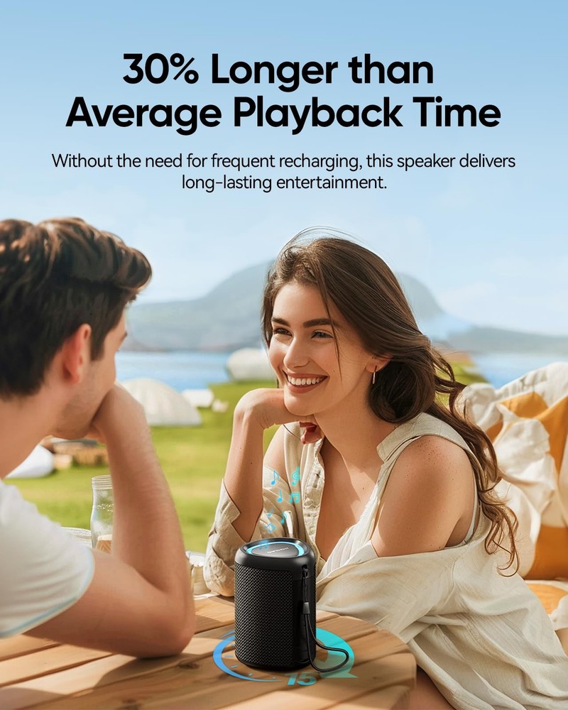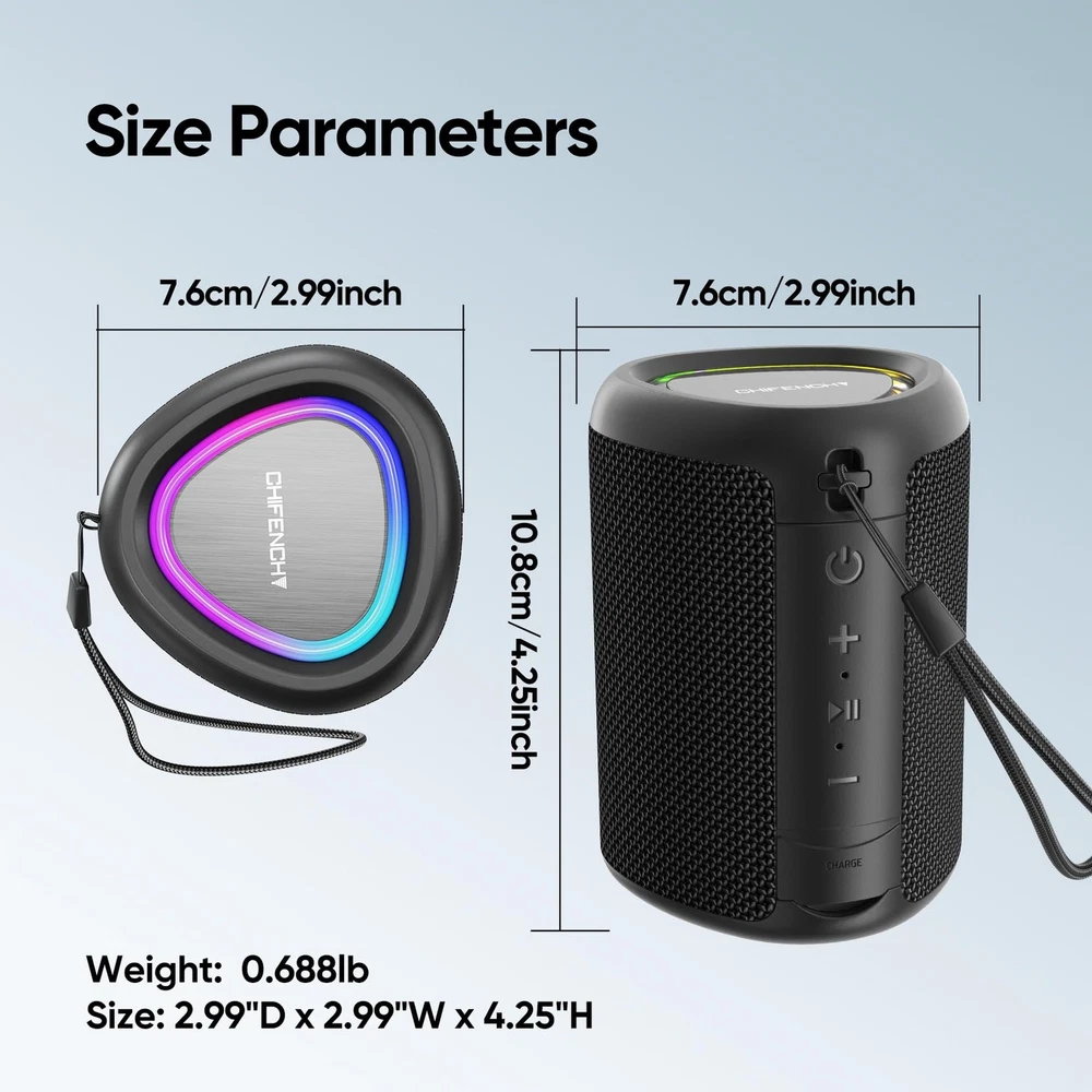 With a room-filling audio experience, this compact speaker delivers impressive clarity and depth. Whether you're unwinding with soothing melodies or getting pumped up with energetic beats, the PulseSound fills your space with immersive sound, making every listening session a captivating journey. Experience a mesmerizing visual experience with the beat-synced light show feature. As you groove to your favorite tunes, the lights pulsate and dance in sync with the rhythm, enhancing your listening experience with an immersive and dynamic display. Whether you're hosting a party or simply enjoying music alone, the synchronized lights add an extra dimension of excitement and energy to your surroundings. Engineered with premium craftsmanship, this portable speaker features a space-saving form measuring a mere 2.99 inches (7.6 cm) in width and length, and 4.25 inches (10.8 cm) in height. Ultra-lightweight at just 0.582 lbs (264g), it slips effortlessly into any bag. Driven by a robust 20W peak power, it delivers immersive audio with punchy bass and crisp highs, while its 15W continuous output ensures crystal-clear sound for indoor relaxation or outdoor adventures 【Immersive Sound】: Experience stunning 15W(20W peak) sound in a compact design ( Pro Tip: For larger spaces, pair two speakers in stereo mode (30W total) for immersive sound). With zero distortion audio, this Bluetooth speaker delivers loud highs, crisp midrange, and full bass for an immersive listening experience. With up to 15 hours of playtime on a single charge, enjoy your favorite tunes all day and night without interruption 【Portable Design】: Compact and lightweight at 4.25 inches high and 2.99 inches in diameter, this speaker is perfect for on-the-go use. It features a TF card slot (supports WAV / FLAC / APE / MP3 formats), a 3.5mm AUX input port, Type-C fast charging, and a lanyard for convenient carrying 【Dynamic Beat-Synced Light Show】: Enjoy an exciting light show that dances to the rhythm of your music. With vibrant LED that sync with the beat, this speaker adds an extra dimension to your listening experience 【360° Stereo Pairing】: Enjoy true wireless stereo sound by pairing two speakers together. With 360° coverage, you can enjoy loud 30W music in any setting, whether it's at home, parties, the beach, park, or elsewhere 【Advanced Bluetooth 5.3】: Equipped with the latest Bluetooth 5.3 chip, this speaker ensures fast pairing and a stable connection.