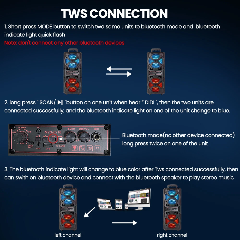 2000W Portable Bluetooth Speaker Sub Woofer Heavy Bass DJ RGB Party Speakers LoudSound System TWS Karaoke Machine with Mic FM Radio Features: 1.High Power: This high powered wireless karaoke PA portable bluetooth speaker is equipped w/ dual 6.5" subwoofer for full range surround stereo sound reproduction and impressive bass response. 2.Bluetooth 5.2 Speaker: Your favorite music will smoothly come out from the Bluetooth speaker. Upgraded Blutooth chip ensures lower consumption and a stable connection between the Bluetooth subwoofer and your smartphone, tablet or other Bluetooth-enabled device within 10m/33ft. No cable and no hassle. Chairmanstore Portable Bluetooth Speaker Sub Woofer Heavy Bass Party Speakers LoudSound System 2000W Portable Bluetooth Speaker Sub Woofer Heavy Bass DJ RGB Party Speakers LoudSound System TWS Karaoke Machine with Mic FM Radio Features: 1.High Power: This high powered wireless karaoke PA portable bluetooth speaker is equipped w/ dual 6.5" subwoofer for full range surround stereo sound reproduction and impressive bass response. 2.Bluetooth 5.2 Speaker: Your favorite music will smoothly come out from the Bluetooth speaker. Upgraded Blutooth chip ensures lower consumption and a stable connection between the Bluetooth subwoofer and your smartphone, tablet or other Bluetooth-enabled device within 10m/33ft. No cable and no hassle. 3.MultiFunction Modes: TF Card Input/AUX input/U-Disk Input player connecting to other non-Bluetooth devices in your home. Remote control and digital display makes your use feel more conveniently.With FM radio input function, you can tune in your favorite radio channel with your friends. 4.Long Battery Life & Rechargeable Battery: Equipped with 1800mAh rechargeable battery, the speaker can keep running up to 6 hours in events such as outdoor live performances, BBQ, advertising activities, street speeches, school events, karaoke, Bon festival dance, etc. 5.Karaoke Input: When connected to the provided wired microphone, it can provide Karaoke function, allowing you to enjoy singing whether you are providing live streaming or joining in a party. Do not put the open microphone near the speaker to avoid loud noise. 6.TWS Function: Our speakers support True Wireless Stereo (TWS) function, allowing you to pair two speakers at the same time. Simply long press the pause button for easy pairing and immerse yourself in a rich, stereo surround sound experience. 7.Flashing DJ Lights: The bluetooth party speaker with lights on wheels features multi color flashing disco LED lights that will add life to any occasion which is great for patio parties or gatherings at night when a colorful presence is noticeable Specification: Type: Party Speaker Color: Black Size: 211*185*495 mm / 8.31*7.28*19.49 in Bluetooth Version: 5.2 Speaker Unit: 2* 6.5 inch woofer Output Power: 20W Peak Music Power Output: 2000W Power Supply: DC 5V 1A Battery: 3.7V 1800mAh Play Time: 3-5H Frequency Response: 150-18KHz Funtions: Bluetooth/Microphone/USB/TF/AUX/FM/TWS TWS Function: 1.Open two Speakers 2.And then long press the Pause button on one Speaker 3.Until we hear the beep 4.Connect your phone to Speaker Bluetooth Note: In order to prevent the light from interfering with the radio signal, the RGB light is off in FM mode. Package Included: 1 * Bluetooth Speaker 1 * Wired Microphone 1 * Charging Cable 1 * Remote Controller 1 * User Manual Item Specifics Brand Unbranded Type Portable Speaker System Connectivity Bluetooth Features Bluetooth Color Black Model / Bluetooth Version 5.2 Peak Music Power Output 2000W Power Supply DC 5V 1A Battery 3.7V 1800mAh Play Time 3-5H Funtions Bluetooth/Microphone/USB/TF/AUX/FM/TWS Payment Returns Chairmanstore DESCRIPTION PAYMENT SHIPPING RETURN POLICY CONTACT US Shop Category Store Home Home&Garden (G&V) Big discount Other Hot Item Wireless Bluetooth 5.0 Headset Earpiece Driving Trucker Earbuds Noise Cancelling USD 19.60 Bluetooth 5.0 Headset Wireless Earphones Earbuds TWS Stereo Headphones Ear Hook USD 23.48 Wireless FM Transmitter Car Adapter Type-C PD 20W+ QC3.0 Fast USB Charger PD20W USD 7.99 Wireless Car Bluetooth FM Transmitter AUX Radio Adapter Handsfree USB Charger US USD 12.05 300Mbps WiFi Range Extender Signal Booster Amplifier Internet Wireless Repeater USD 20.99 Picture New List Item 3 Channel Dash Cam Vehicle Car DVR HD1080P Video Dashcam Camcorder +Rear Camera USD 45.58 HD 1080P Video DVR Clip IR Night Cam DVR Camcorder Mini Police Body Camera USD 26.58 3 Channel Dash Cam 360° Dash Camera HD1080P 3 Lens Driving Recorder Night Vision USD 37.04 24V Cordless Electric Hedge Trimmer with Battery & Charger for Shrub Cutting USD 55.08 Cordless Airbrush-Kit Rechargeable Airbrush Compressor-Nail Airbrush Machine USD 35.14 Help & Info Payment Policy Shipping Policy Return Policy FAQ About Us Portable Bluetooth Speaker Sub Woofer Heavy Bass Party Speakers LoudSound System 2000W Portable Bluetooth Speaker Sub Woofer Heavy Bass DJ RGB Party Speakers LoudSound System TWS Karaoke Machine with Mic FM Radio Features: 1.High Power: This high powered wireless karaoke PA portable bluetooth speaker is equipped w/ dual 6.5" subwoofer for full range surround stereo sound reproduction and impressive bass response. 2.Bluetooth 5.2 Speaker: Your favorite music will smoothly come out from the Bluetooth speaker. Upgraded Blutooth chip ensures lower consumption and a stable connection between the Bluetooth subwoofer and your smartphone, tablet or other Bluetooth-enabled device within 10m/33ft. No cable and no hassle. 3.MultiFunction Modes: TF Card Input/AUX input/U-Disk Input player connecting to other non-Bluetooth devices in your home. Remote control and digital display makes your use feel more conveniently.With FM radio input function, you can tune in your favorite radio channel with your friends. 4.Long Battery Life & Rechargeable Battery: Equipped with 1800mAh rechargeable battery, the speaker can keep running up to 6 hours in events such as outdoor live pe