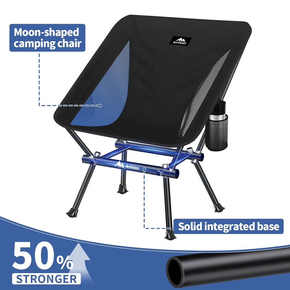 1.【Stronger Stability】: Say goodbye to unstable camping chairs. For ultimate stability, we've designed our camping chair with a square structure and four supporting points. Even better, this robust portable camping chair has a load capacity of up to 330 lbs. 2.【Unique Design】: Exclusively designed by a designer with 30 years of outdoor chair design experience, our chair offers enhanced stability and durability while ensuring a comfortable and compact use experience. We have replaced common plastic components with pure aluminum nuts in the core link section, giving the chair a unique metallic appearance and making it sturdier and more durable. The bracket is made of alloy steel, which is hard and has excellent toughness, providing a sitting experience as comfortable and reassuring as a trampoline. 3.【Practical】: The snug seat and headrest ensure support and relaxing comfort for hours. Also included are three pockets: one back magazine pocket, one side pocket, and one drink holder.These pockets allow you to easily access frequently used small items while using the chair. Additionally, when not in use, you can place your water bottle in the drink holder instead of carrying it at all times. 4.【Complimentary Backpack】: Our backpack can not only hold chairs but also accommodate towels, magazines, and other supplies. It can be used as a separate computer bag or an outdoor camping bag, freeing up your hands for daily activities such as school, cycling, camping, shopping, work, and travel. 5.【Easy Setup & Cleaning】: Setup has never been easier, thanks to the foldable Oxford cloth and metal poles.Simply take out the frame, assemble it by following the elastic connection cords, and then attach the fabric. It's also easy to clean.No handyman skills are required! Just wipe with a damp cloth or soapy water, and you’re good to go. 6.【Super Comfortable】: The upgraded square structure is far more stable than the older models on the market. An ergonomic seat provides an exceptional experience with excellent wrapping and back support. Breathable side mesh panels enhance airflow and help keep you cool. 7.【Global Patent Protection】: Our chairs have design patents in the United States, Europe and Japan. 8.Note: After assembly, please tighten the nuts to stabilize the chair. If you have any questions about the product, please contact us by email, and we will resolve the issue as soon as possible. To keep the chair compact and portable, it requires assembly each time you use it. If this is a concern for you, please purchase with caution.