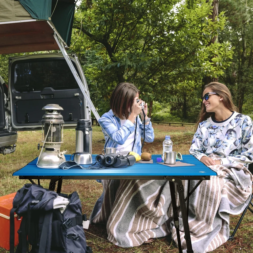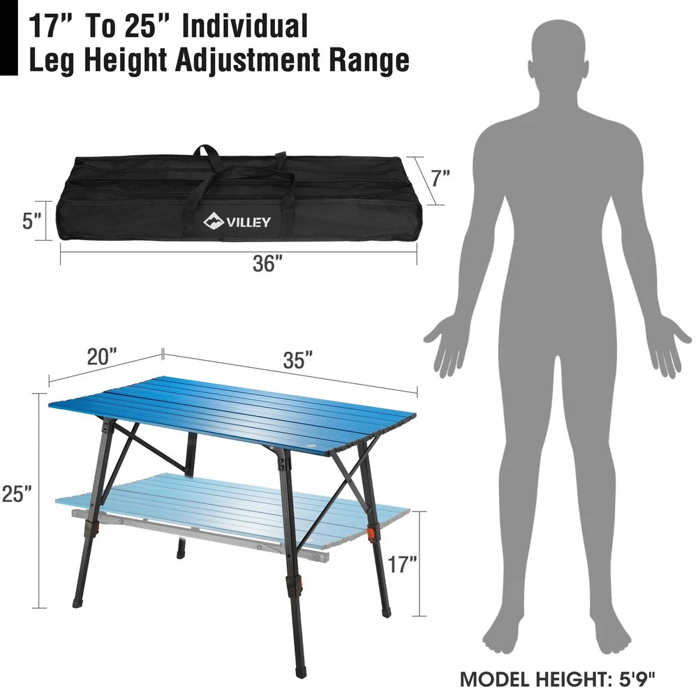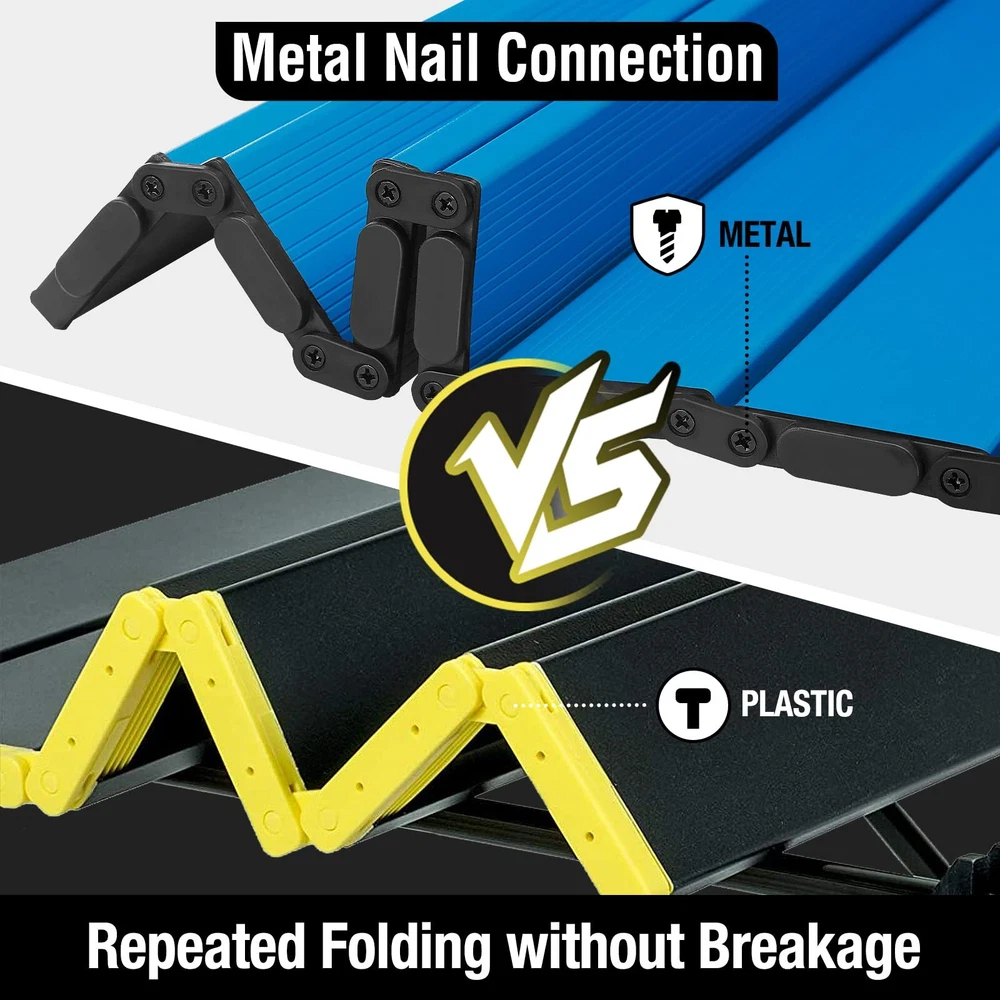 Ultra-light for Easy Portability: Our folding camp table's top and frame are all made of aluminum, only 8.9 lbs weight, it is lighter than other comparably-sized wooden camp tables. This foldable table is easy to install or fold into the included carry bag, you can carry it anywhere, and easily fits in the back of a car, RV, or motorcycle Individual Leg Adjustments for Uneven Terrain: The foldable camping table is designed with 4 retractable aluminum legs, making it easy to level no matter how uneven the ground is. You can freely adjust the height starting from 17" to 25", meeting all the needs of campers and adventurers Hinged Connection Upgrade: outdoor table has a unique metal screw design that works with hinges to connect each panel of the table, unlike other similar foldable tables that are connected with bungee cords or plastic nails, heavy-duty metal nail-attached hinges make the snack table more stable, allow it to last for many years Sturdy Construction for High Load Capacity: This portable table is made of high-quality aluminum, the legs will not fold, bend or fall off with the stable foot cap, allowing it to be used on different terrains without the risk of tipping over. The heavy-duty construction and sturdy joints make the foldable camping table can support 100 pounds of weight Large & Easy to Clean: The heat-resistant and waterproof aluminum tabletop can be sanitized with a quick scrub and rinse, so it is perfect for a picnic table for cooking and dining. This camping table has the ability to adjust the height for standing or sitting, and it’s spacious enough to comfortably seat four to six adults