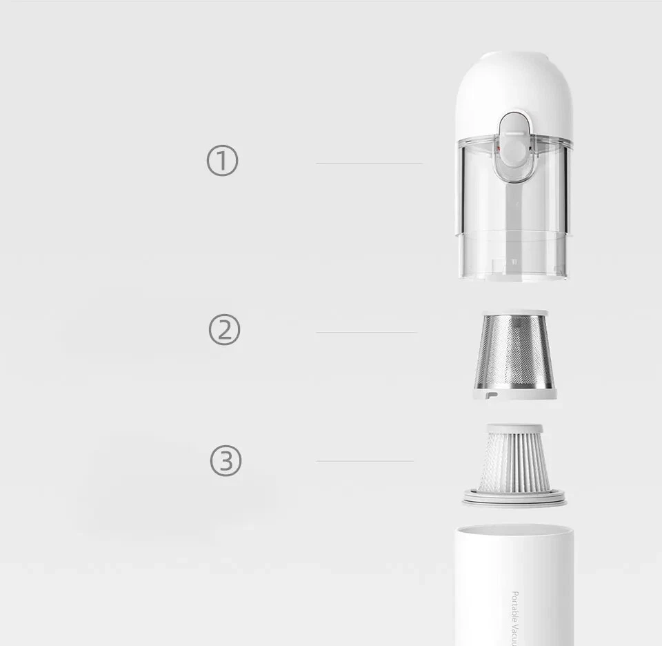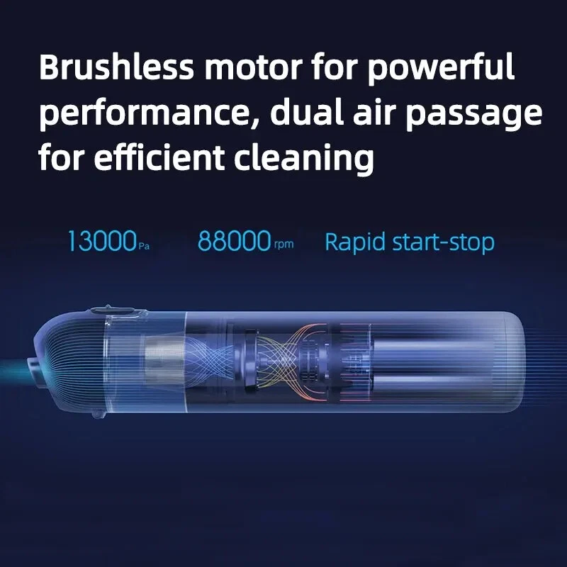 • High Suction Power : With a suction power of 13000Pa, this vacuum cleaner can easily remove dust and dirt from your car or home. • Wireless Operation : The wireless design of this vacuum cleaner makes it easy to use and maneuver, allowing you to clean hard-to-reach areas. • Cyclone Suction : The cyclone suction feature ensures that the vacuum cleaner can effectively remove dust and dirt from all surfaces, including carpets and upholstery. • Lightweight and Portable : Weighing only a few kilograms, this vacuum cleaner is easy to carry and store, making it perfect for use at home or on the go. User Instructions: Charging: 1.For the initial use or after prolonged storage, please fully charge the product first. 2.It is recommended to charge every 3 months. 3.Please use a 5V/2A power adapter (to be purchased separately) and the original Type-C charging cable for charging. Nozzle Installation: Select the appropriate nozzle and install it into the nozzle mounting port. Tip: Both nozzles can be used individually or combined. Power On/Off / Mode Switching: Press the power button briefly to cycle through the following modes: Power On (default low speed), high speed, power off. Notice: 1.Avoid charging, using, or storing the product in high-temperature conditions. When placed in a car, avoid direct sunlight, as it may cause overheating, ignition, or explosion. 2.It is recommended to use the product in environments ranging from 0°C to 40°C. Outside this temperature range, the battery may not function properly. 3.Do not use the product to suction any liquids (such as water, cola, etc.). 4.Do not use the product to suction any burning or smoking objects (such as unextinguished cigarette butts). 5.Do not use the product to suction hard or sharp objects (such as construction debris, glass, nails, etc.). Portable car vacuum cleaner Attention to Detail, Clean Up Easily Dual-Use for Cars and Homes, Powerful Suction, Brushless Motor, One-Touch Dust Emptying Slimmer than a Thermos Flask Home Dust Removal, One-Touch Clean Living Free yourself from the constraints of cords for more flexible cleaning. Even dirty and cluttered corners can be easily dusted, allowing you to enjoy a cleaner life. Cleaning Inside the Car, Tidying Up Small Messes In smog and dusty weather, the interior of the car is prone to accumulating dust. With a quick and convenient vacuum, even the finest dust and debris have nowhere to hide. *Strictly prohibited to be placed in direct sunlight. It is not recommended to leave the Xiaomi handheld vacuum cleaner in the car during high temperatures in summer to avoid potential hazards. Brushless motor for powerful performance, dual air passage for efficient cleaning. Equipped with a high-performance brushless motor and an internal straight-through dual air passage design, effectively reducing energy consumption and improving cleaning efficiency. Equipped with a high-speed start-stop function to prevent dust from remaining at the nozzle when the device is turned off. 2 Gears of Suction Power, 30-Minute Long Battery Life Low Gear Battery Life: 30 minutes* High Gear Battery Life: 9 minutes* Innovative Combination Brush Heads for Easy Dust Removal in Various Scenarios Crevice Dusting Flexibly clean hard-to-reach crevices and corners. Keyboard Cleaning Effortlessly remove hidden dust beneath the keycaps. Car Interior Cleaning Instantly sweep away long-hidden fine dust. Compact in size, it doesn't take up space for storage. ① Sofa placement; ②Drawer storage; ③ In-car storage One-key dust disposal, convenient and hands-free. Designed with a one-key dust disposal feature, press the button, and the dust cup cover automatically pops open, avoiding secondary pollution. ①Button lock design to prevent accidental opening of the cup cover. The button lock design allows you to slide down to unlock when dumping the dust, and then simply press the button to open it. ②The initial filter steel mesh is detachable, separating large particles of dust. ③Built-in high-standard filter core.The whole machine has a filtration efficiency of >99.5%. The double filtration system of the initial filter steel mesh and high-standard filter core ensures that vacuuming doesn't create more dust and is not afraid of tiny dust particles. Craftsmanship, quality originates from details. ①Compatible with a Type-C interface, it can be used with mobile phone and mobile power data cables. ②ABS hard dust cover.Closes tightly, effectively preventing dust from leaking. ③The pointed cup lock prevents accidental opening, securely locking the cup cover and preventing accidental opening. ④The dust collection cup assembly is detachable and washable, reducing consumables and extending the product's lifespan. Specifications: Product Name: Handheld Vacuum Cleaner Product Weight: Approximately 0.5kg Rated Power: 120W Product Dimensions: 267 × 55 × 55mm Rated Voltage: 10.8V Package Information: ①Main Unit ×1 ②Crevice Nozzle × 1 ③Brush Nozzle x1 ④ Type-C Charging Cable × 1 ⑤User Manual ×1