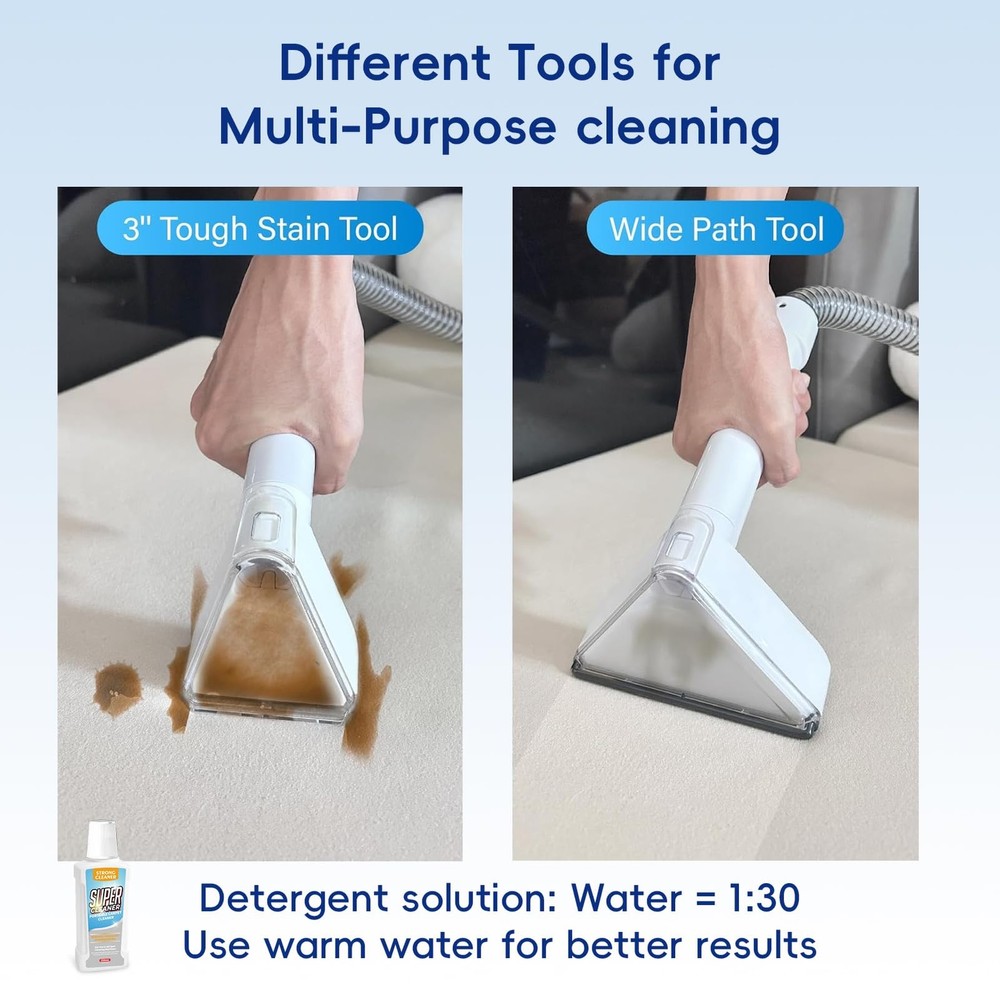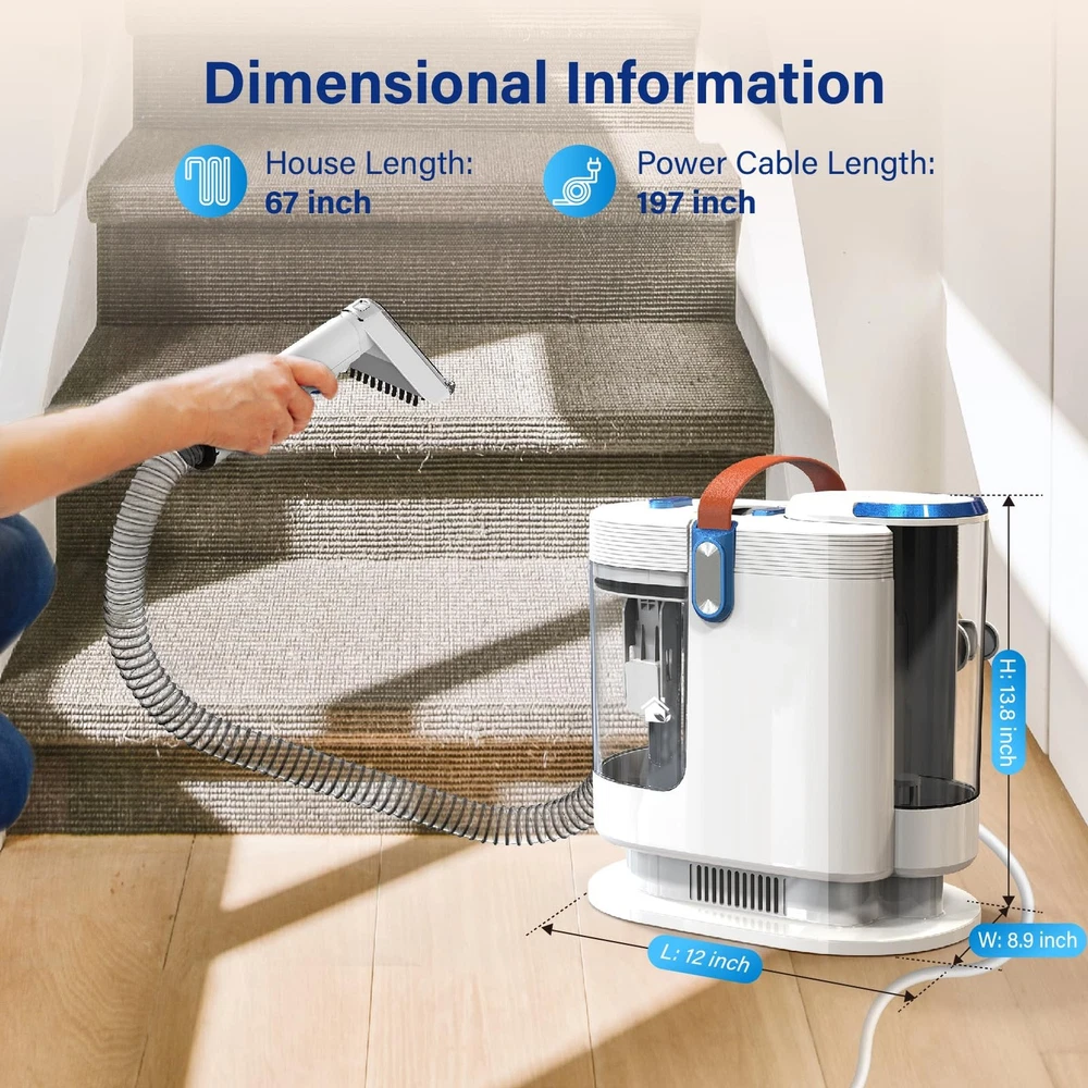 Portable Carpet Cleaner Machine 【Powerful Suction with 500W Motor】 : This carpet cleaner machine (Teal)has a powerful suction of 15KPa and 500W super power, can be quickly cleaned, and the cleaning effect is better, and can help us solve the family cleaning problem to the greatest extent. 【3 Tools for All Your Cleaning】 : The carpet cleaner machine comes with 2 types of cleaning tools: Wide path tool for quickly tackling large stains. Tough stain tool for carpets, couches, upholstery, stairs, car interiors even pet beds. The carpet cleaner machine also features a self-cleaning function that can clean the dirty water inside the pipes. 【Dual Water Tank】: Portable upholstery cleaner machine features a dual-tank system with a 54oz clean water tank and a 42oz dirty water tank, allowing you to easily detach the tanks for filling, draining, and cleaning. Tips: Do not exceed the MAX line in the dirty water tank, as it may cause the carpet cleaning machine's suction to stop. 【Portable and Compact】: The upholstery cleaner machine comes with an ultra long hose (5.5 ft) and power cord (16.4ft), and this portable carpet cleaner is lightweight and easy to move around to clean multiple surfaces throughout your home. The brush and power cord can be stored on the machine's hook to save space. 【Versatile / Multipurpose】: This carpet cleaning machine is recommended for use with low-foam neutral cleaning agents, (Cleaning sofa, carpet and other cleaning agent ratio 1:30; Dish soap is diluted at a ratio of 1:10 for optimal performance.) It is suitable for cleaning carpets, sofas, stairs, and other household surfaces, as well as car seats. It provides a comfortable cleaning experience and helps maintain a clean environment.