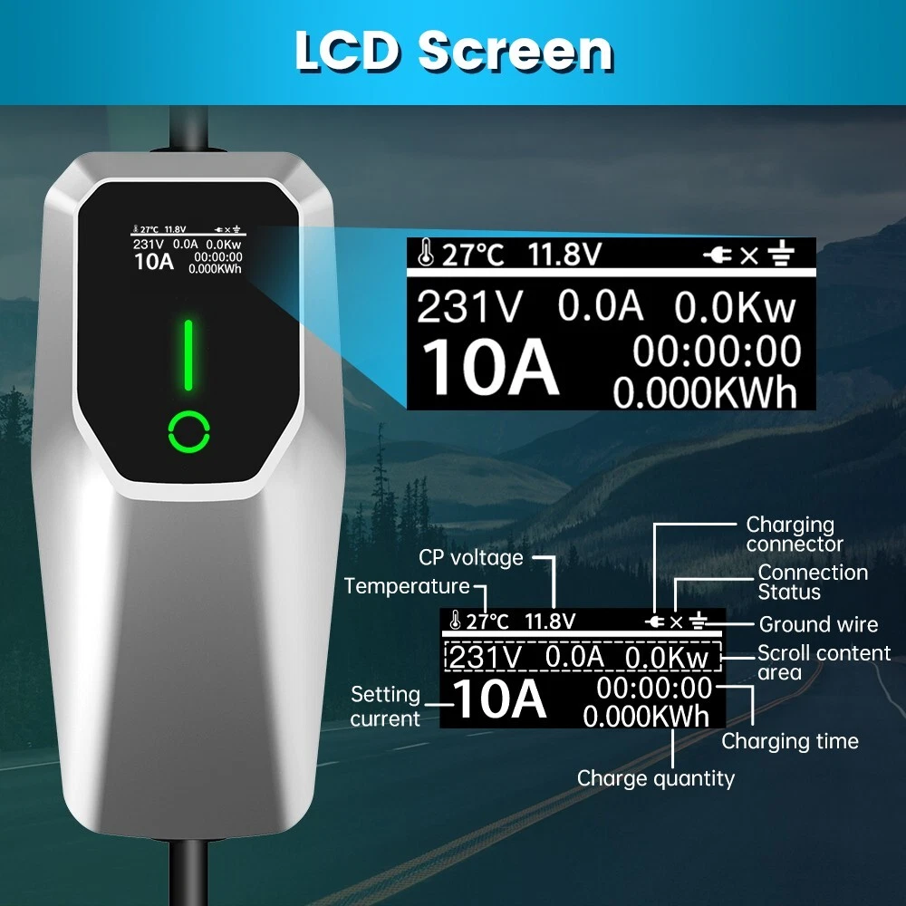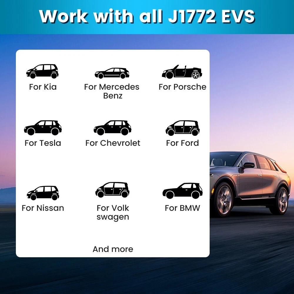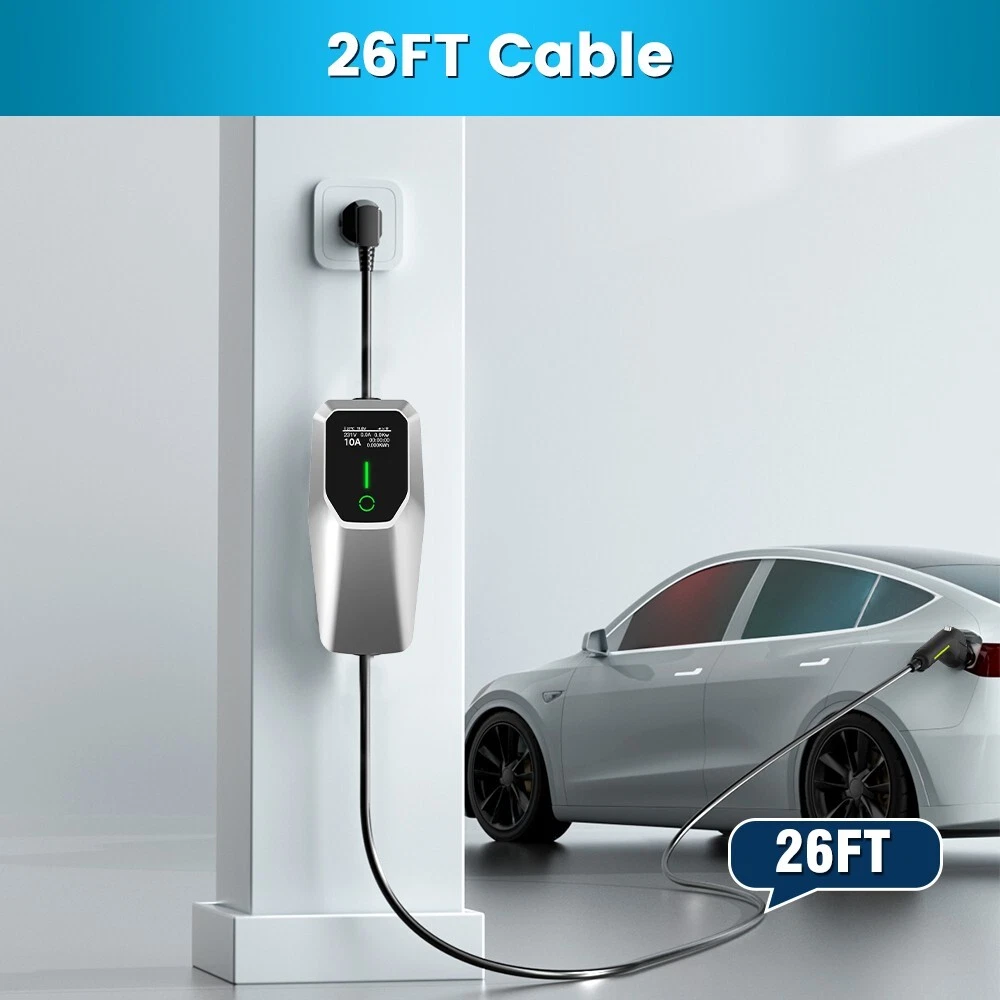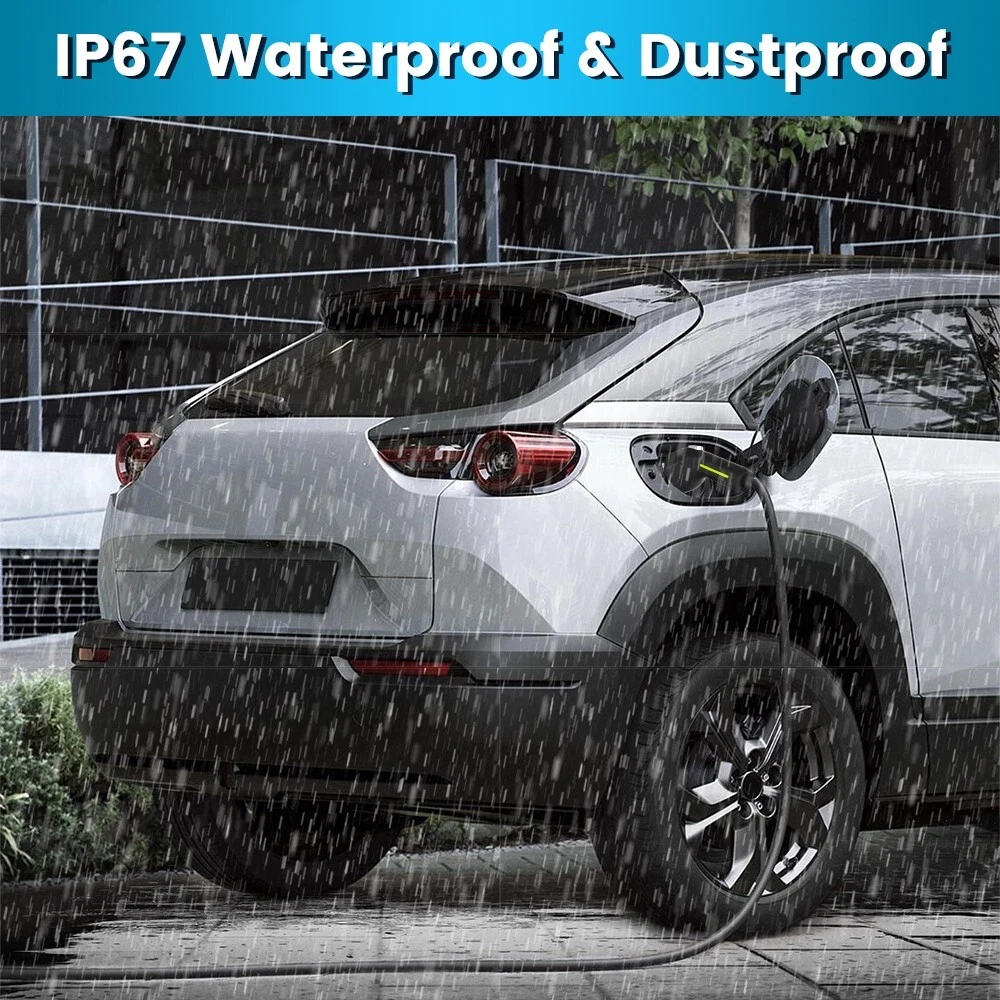 【2 In 1 Lightning EV Charger 】 Lightning Fast Charging Level 1 & Level 2 EV Charger with adjustable 16/32amp. NEMA 14-50 plug: charge Level 2 vehicle, up to 32Amp 240V, 7 KW Max., 6x faster than a normal 8A level 1 charger. NEMA 5-15 Adaptor: charge Level 1 vehicle, up to 16Amp 110V, 1.7 KW Max., Ideal for older and newer model electric cars. 【6X Faster Charging】 Level 2 EV Charger with NEMA 14-50 plug fill up your car at an average of 6 times faster than a standard charger, delivering 24 miles in only 1 hour at 240V charge. 【LED Screen】 The LCD screen display every detail that you need during the charging including the real-time current and voltage, charging amount and time. 【Portability & Easy Operation】 Charging your EV in anywhere and at any Time. The Portable EV Charger can be carried with your car. Compact controller size for flexible installation and usability, and 26 feet of charging cable can fulfill your demands of charging in driveways and garages. 【Safer & Reliable Charger】 Safety is a top priority, which is why this charger is equipped with a LED indicator on the control box. This indicator displays the charging status of your EV, alerting you immediately to any potential issues. Additionally, the charger incorporates triple protection functions, including Leakag Protection, Overcharge Protection, and Under Voltage Protection, ensuring a safe and reliable charging experience.