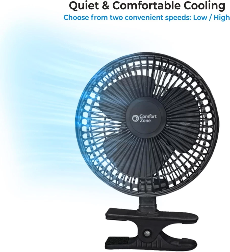 Size:6"Is Cordless?:NoVoltage:120.0Efficiency:EfficientMounting Type Tabletop Mount:Controller Type Button ControlOperating Sound Rating:44 DecibelsGlobal Trade Identification Number:00075877252722Switch Type:Push ButtonIs Discontinued By Manufacturer:NoElectric fan design:Table FanControl Method:TouchBrand:Does not applySpeed:2327 RPMItem Diameter:6 InchesRecommended Uses For Product:Air Circulation, CoolingMain Power Connector Type:2-PinNumber of Power Levels:2Style:CompactNumber of pieces:1Special Feature:Adjustable Tilt, Lightweight, Portable, Quiet OperationInstallation Type:clip-onPower Source:Corded ElectricAssembly required:NoFinish Type:PaintedType:Does not applyForm Factor:MountableMaterial Plastic:Number of Speeds 2Number of Blades:3Motor Type:BrushlessBlade Length:6 InchesIncluded Components:CordModel Name:CZ6CBKIndoor/Outdoor Usage:IndoorColor:BlackCare instructions:Hand WashAir Flow Capacity:55 Cubic Feet Per MinuteFinish types:PaintedItem model number:CZ6CBKgtin13:313032250207Warranty Description:1 year warranty against manufacturer defects.Room Type:Bedroom, Dorm Room, Living RoomBatteries required:NoUPC:313032250207Product Dimensions:7.5"D x 7.5"W x 10"HWattage:12 wattsItem Weight:1.5 pounds