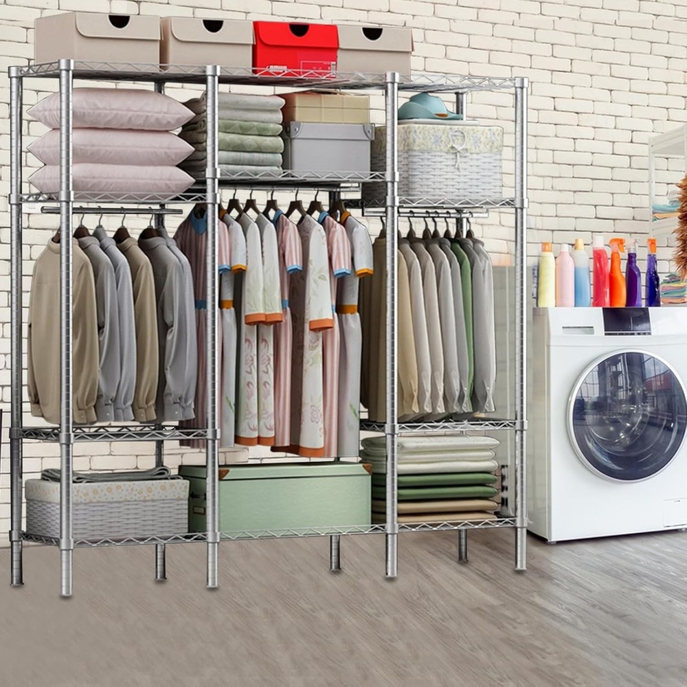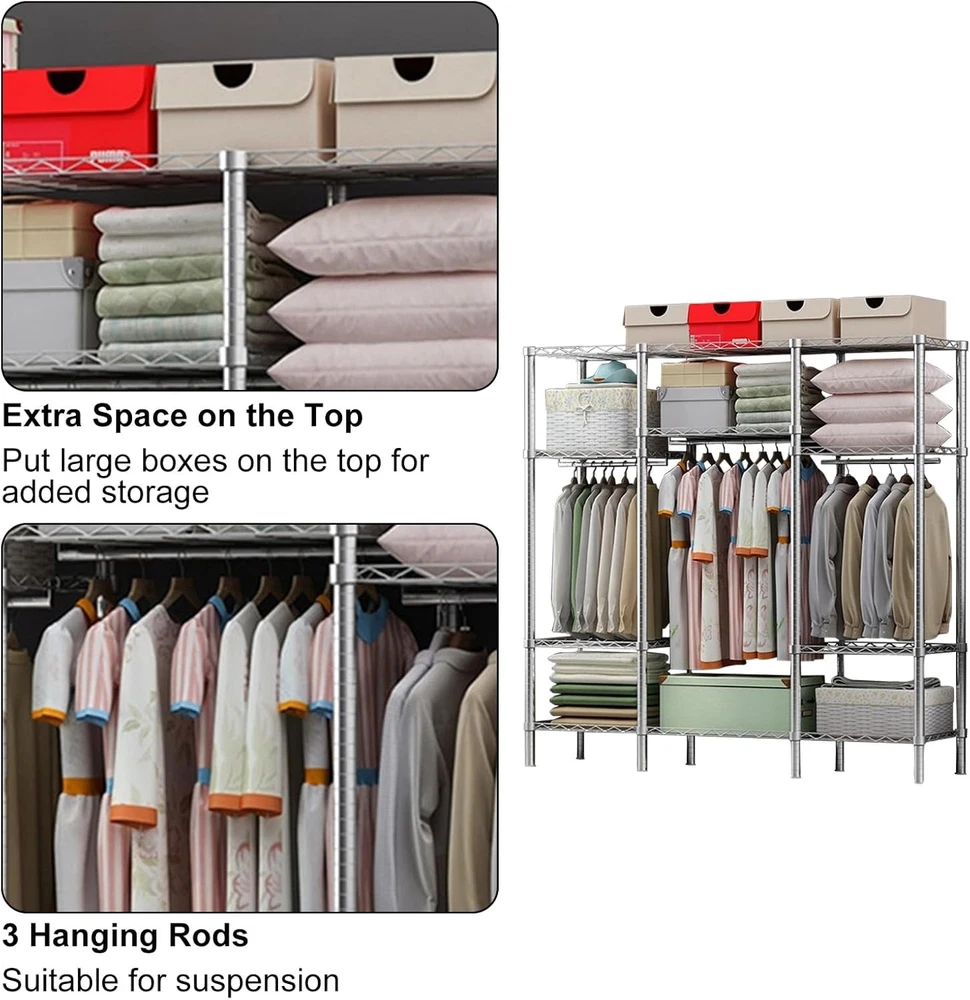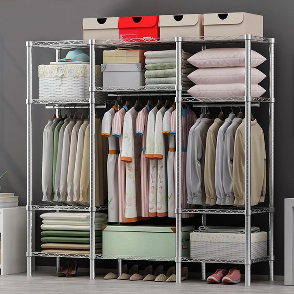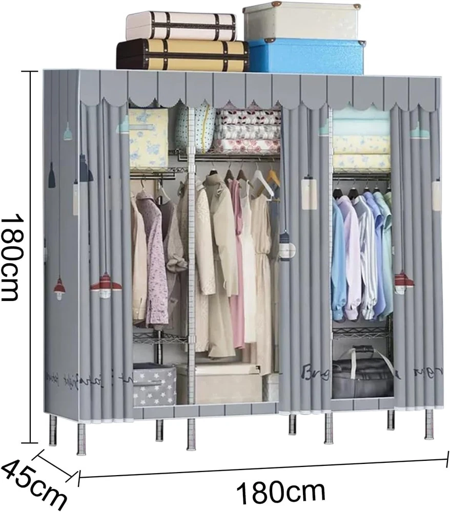 Product Description Descriptions: Closet storage organizer with top shelves, 3 tiers closet shelves and hanging rods offers you various storage area. The 8 open storage shelves allow you to create a personalized closet layout, accommodating different garment lengths, shoes, and accessories. O-xford fabric dustproof cover offered to keep your item away from dust and oxford fabric tier is easy to clean with damp cloth, and offers privacy while maintaining a neat appearance. Portable garment rack for hanging clothes is made of premium thicken carbon steel to protect it from scratch and rust. Designed with stability in mind, this garment rack features reinforced connectors and a sturdy frame to ensure it keeps stable even when fully loaded. This portable closet is easy to assemble with its multi-style assembly design. Just be sure to read the assembly directions carefully BEFORE you start putting it together. Certain shelves must be installed in a particular order. Single hanging rod can support up to 40kg. This garment rack provides ample space for all your clothing storage needs. Suitable for dormitory, home, bedroom, rental room, etc. Item Name: Portable Wardrobe Material: Carbon Steel Tube Diameter: 22mm Features: Strong Load-Bearing, Compartment Design, Colorful Light Design Size Details: L: 180cm/70.87"", W: 45cm/17.72"", H: 180cm/70.87"" (Approx.) Notes: Due to the light and screen setting difference, the item's color may be slightly different from the pictures. Please allow slight dimension difference due to different manual measurement. Package Includes: 11 x Net Racks 16 x Steel Tubes 3 x Hooks 1 x Accessories Bag 1 x User Manual 1 x O-xford Cloth Cover On Aug 7, 2025 at 02:26:31 PDT, seller added the following information: