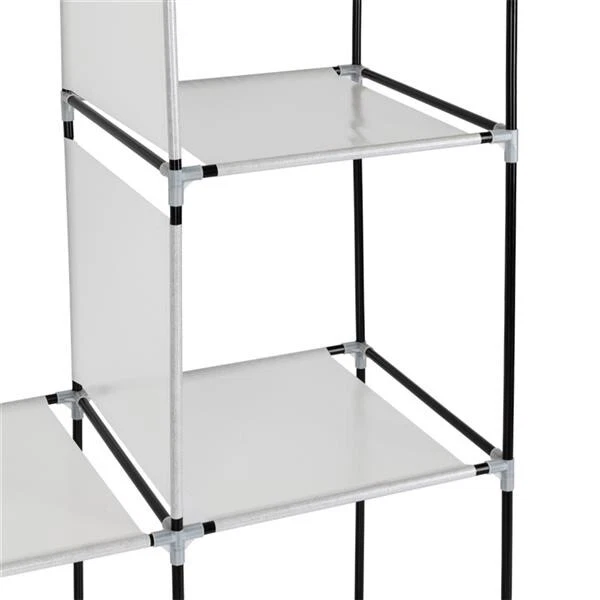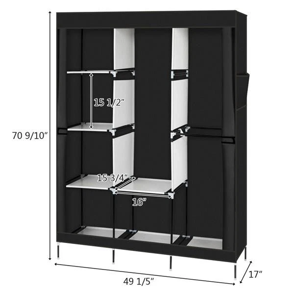 Introductions: Our 71" Portable Closet Storage Organizer Clothes Wardrobe is Made from Selected Non-Woven Fabric Cover, High Quality Steel Tube and PP Plastic Connectors, Which Will Durable and Meet Your Long Term Storage Needs. The Size for The Clothes Wardrobe Makes it Suitable for Organizing Your Small Rooms and Walk-In Closet. Movable Improved Clothes Hanging Rod and 8 Storage Shelves Offers You Enough Space Both for Your Longer Outfits and Folded Clothes. Zippered Dustproof Cover Offered to Keep Your Item Away from Dust and Water-Proof Fabric Tiers are Easy to Clean. It Will Be Great Convenient and Functional. Do Not Hesitate to Buy One! Features: 1. STURDY & DURABLE CONSTRUCTION: Made from Selected Non-woven Fabric Cover, Water-Proof Fabric Tiers, High Quality Steel Tube and PP Plastic Connectors, This Portable Storage Closet Will Meet Your Long Term Storage Needs. 2. SPACE SAVING ORGANIZER: Great Size of 49.2”W x 17” D x 70.9”H, Which Makes it Suitable for Organizing Your Small Rooms and Walk-in Closet. 3. SPACIOUS STORAGE CLOSET: Movable Clothes Hanging Rod and 8 Storage Shelves Offers You Enough Space both for Your Longer Outfits and Folded Clothes. 4. DUSTPROOF COVER & WATER-PROOF TIER: Zippered Dustproof Cover Offered to Keep Your Item away from Dust and Water-proof Fabric Tiers are Easy to Clean. 5. CONVENIENT TO USE & ASSEMBLE: This Amazing Closet Makes Your Clothes or Daily Accessories Easy to Access; Installation is just Easy, no Tool Required. Specifications: 1. Item Name: 71" Portable Clothes Closet Home Wardrobe Clothes Storage Organizer with Shelves 2. Material of the Home wardrobe: Non-Woven Fabric Cover, Steel Tube And Plastic Connection 3. Dimension of Home Wardrobe: (49.2 x 17 x 70.90)" / (125 x 43.18 x 180)cm (W x D x H) 4. Color of Home Wardrobe: Black Package Includes: 1 x Portable Closet 1 x Instruction Note: 1.When receiving the goods, please confirm the product according to the listing of instructions. Once you find Less pieces, please provide relevant pictures to contact us. We will deal it in the time. 2.Please install goods with the instruction manual. 3.It is recommended that the installation should not be too tight to adjust easily. After the structure is installed, firm the interface for more stability.