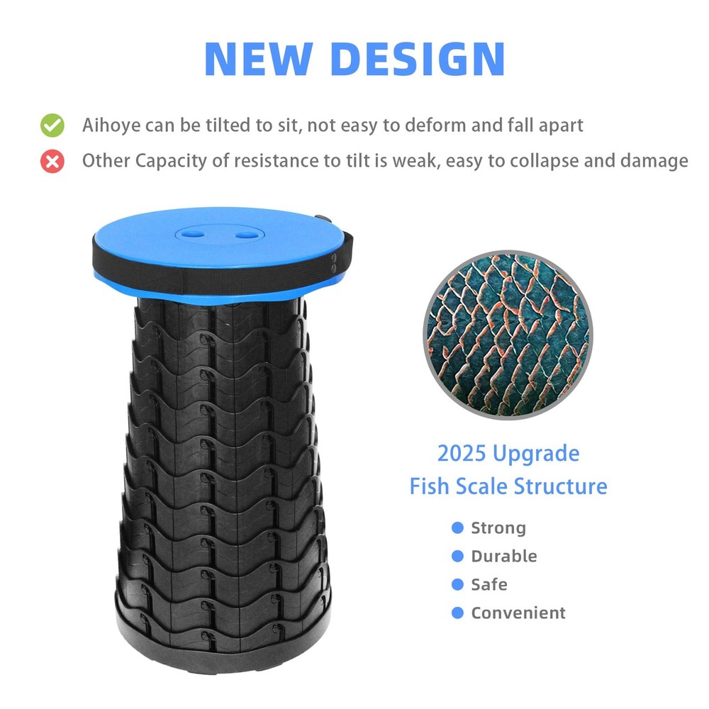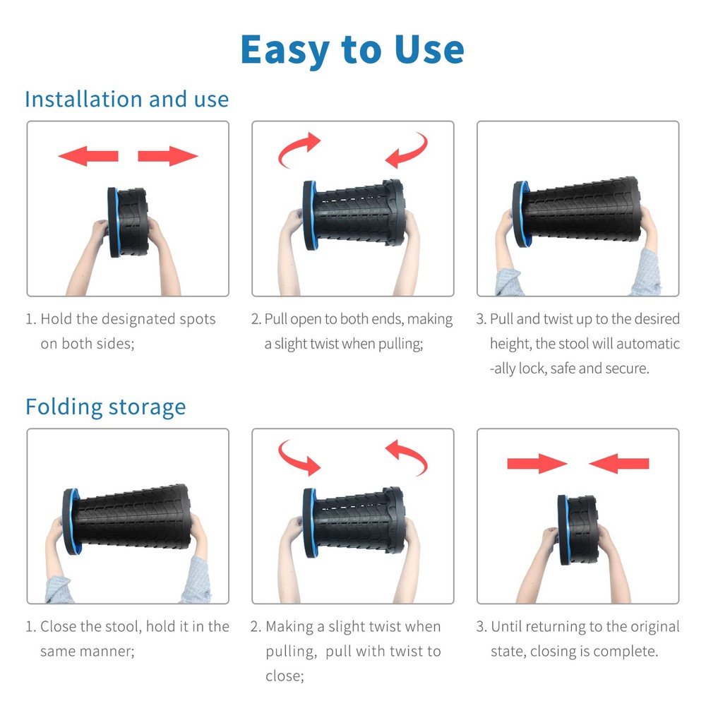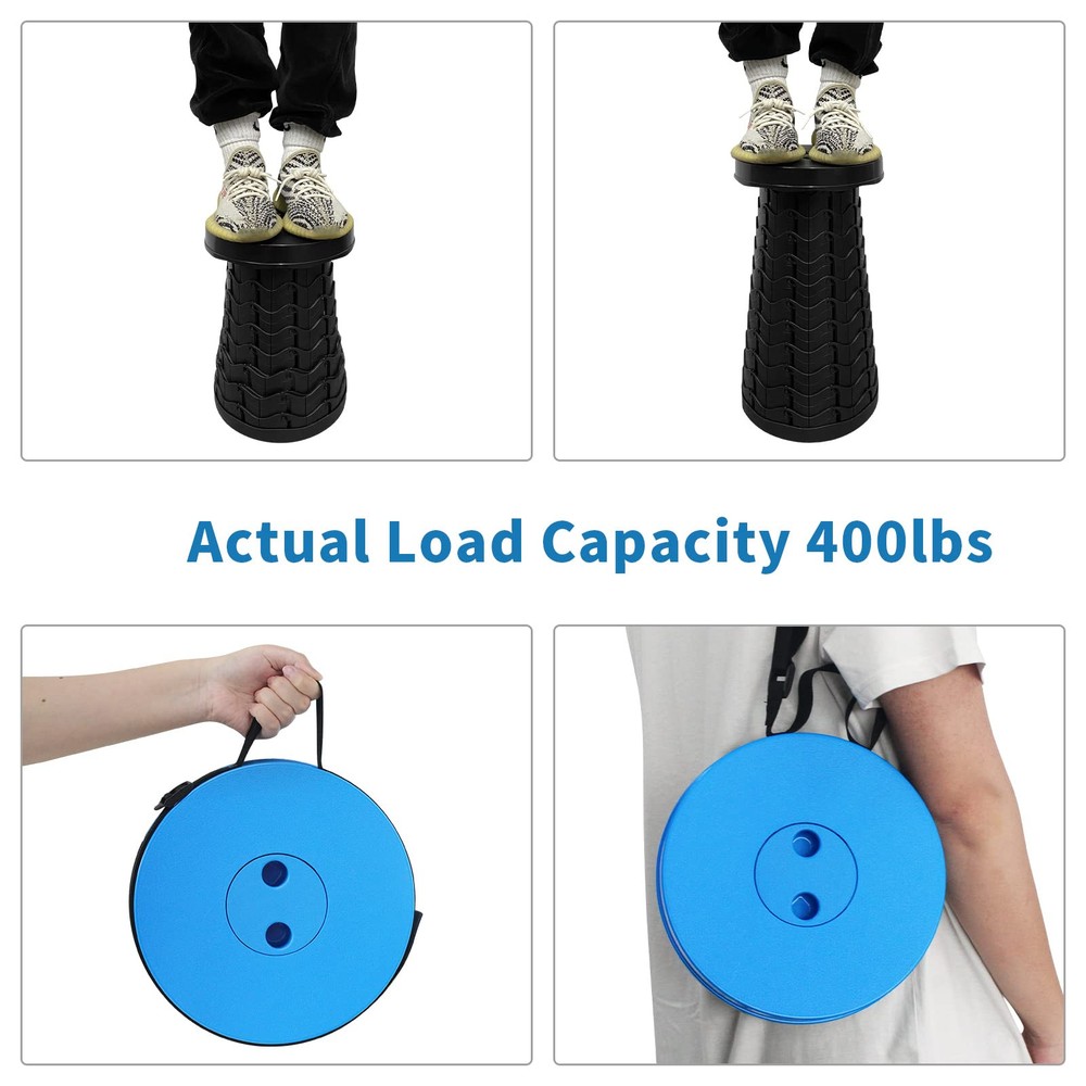 Sturdy & Durable - The Telescoping Stool Is Made Of High Quality Plastic Material, The Newly Designed Fish Scale Structure And Tight Connecting Clasps Improve The Durability And Safety Of The Chair. The Maximum Load Capacity Is Up To 400pounds, Side Support Is Reinforced, Both The Load Capacity And Anti-Tilting Ability Are Stronger Than Other Brands Safe And Stable- The Body Of The Folding Stool Is Made 120 Segments And Each Layer Has Multiple Buckles For Safety,Sturdy,Durability,Stability. Which Makes The Stool More Flexible And Stronger And Not Easy To Break And Deform. The Special Design Allows This Sturdy Folding Stool Effortlessly Bear More Weight. The Anti-Slip Base Ensure The Stability Of The Foldable Stool Adjustable Height- The Camping Stool Is Lightweight And The Unique Locking System Allows You To Adjust The Height Easily, Retractable From 2.5” To 18”, 12 Positions Can Be Chosen According To Your Needs, Fit For Men, Women And Kids Lightweight And Portable-This Telescopic Stool Is Portable And Lightweight, Only 2.54 Pounds With Diameter 9.8 Inches, It Takes Very Little Space, Can Easily Fit Into Any Luggage Or Backpack, It Is Also Designed With A Adjustable Strap So That You Can Carry In Your Hand Or Hang On Your Shoulder Versatility- This Portable Telescoping Stool Is Suitable For Both Indoor Or Outdoor Activities, You Can Put It In Your Kitchen,Bathroom, Garden And Even On The Subway! It's Also Perfect For BBQ, Picnic, Fishing, Camping, Gardening, Traveling, Hiking, Queuing And Even Hunting